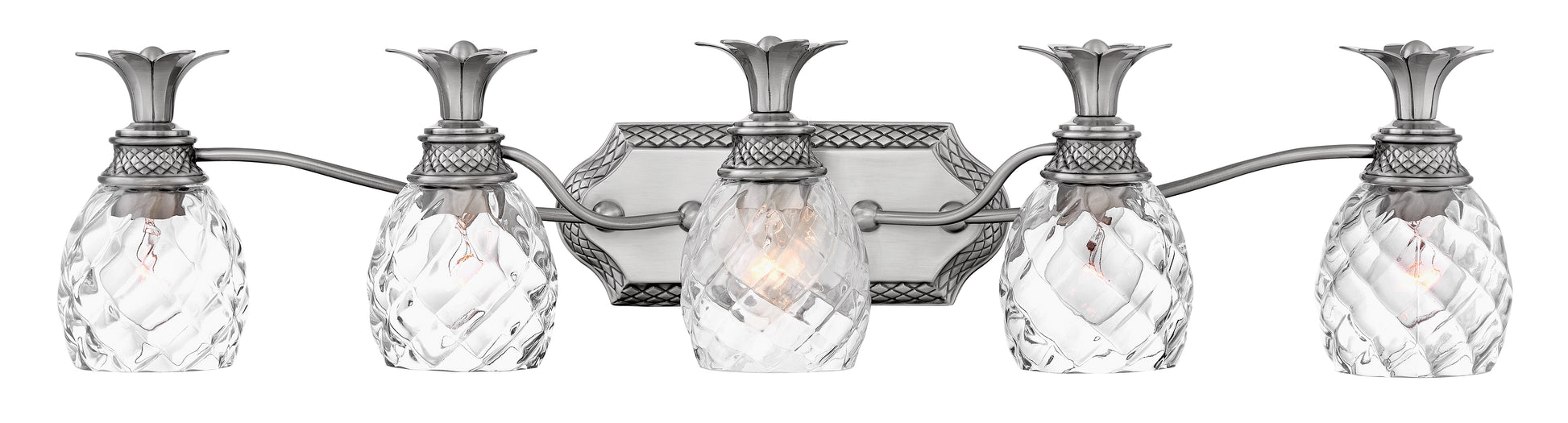 A Hinkley classic, the ornate Plantation collection features exceptional pineapple shaped, clear optic glass that makes a noble statement. The elaborate, decorative cast detailing is accentuated by its lush finish.
