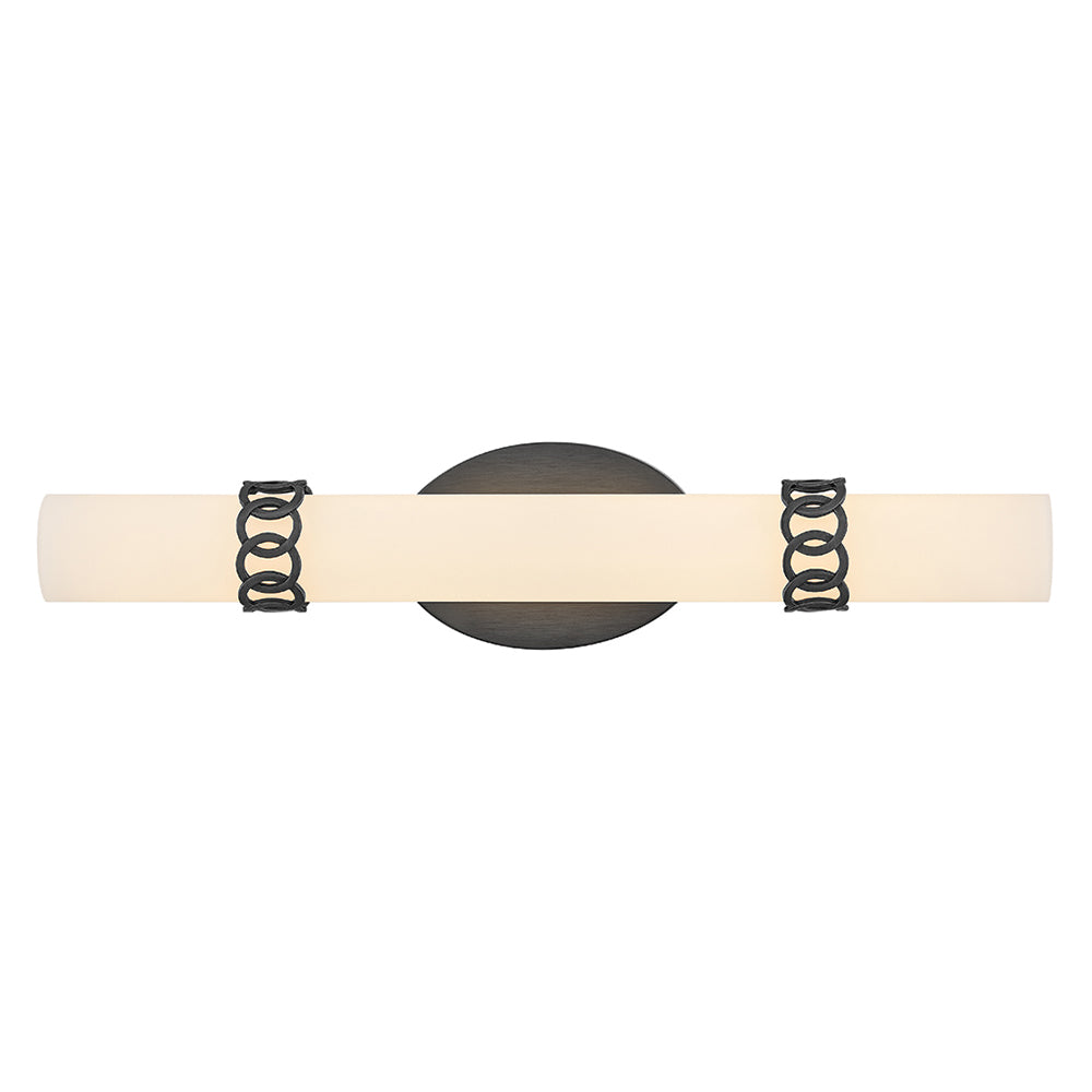 Reminiscent of the fanciful detailing found in fine jeweled bracelets, Eliza’s decorative chain cuffs accentuate its tasteful etched opal glass. Fully dimmable integrated LEDs evenly cast bright yet comfortable illumination to fill your entire bathroom or living space.
