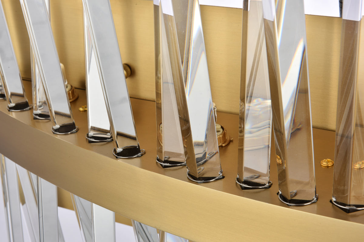 Modern crystal wall sconce features top and bottom tier crystal prisms staggered along a wrought iron frame. The thick metal frame wraps around top grade crystal prisms ensure it is built to last, definitely worth it. Mount this work of art and dim the lights for a bit of sophisticated lighting in your home. Get lost in a beautiful light and sleek design available in multiple finishes.