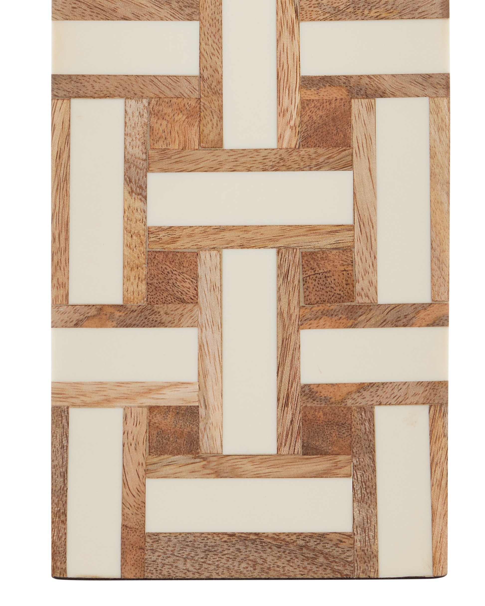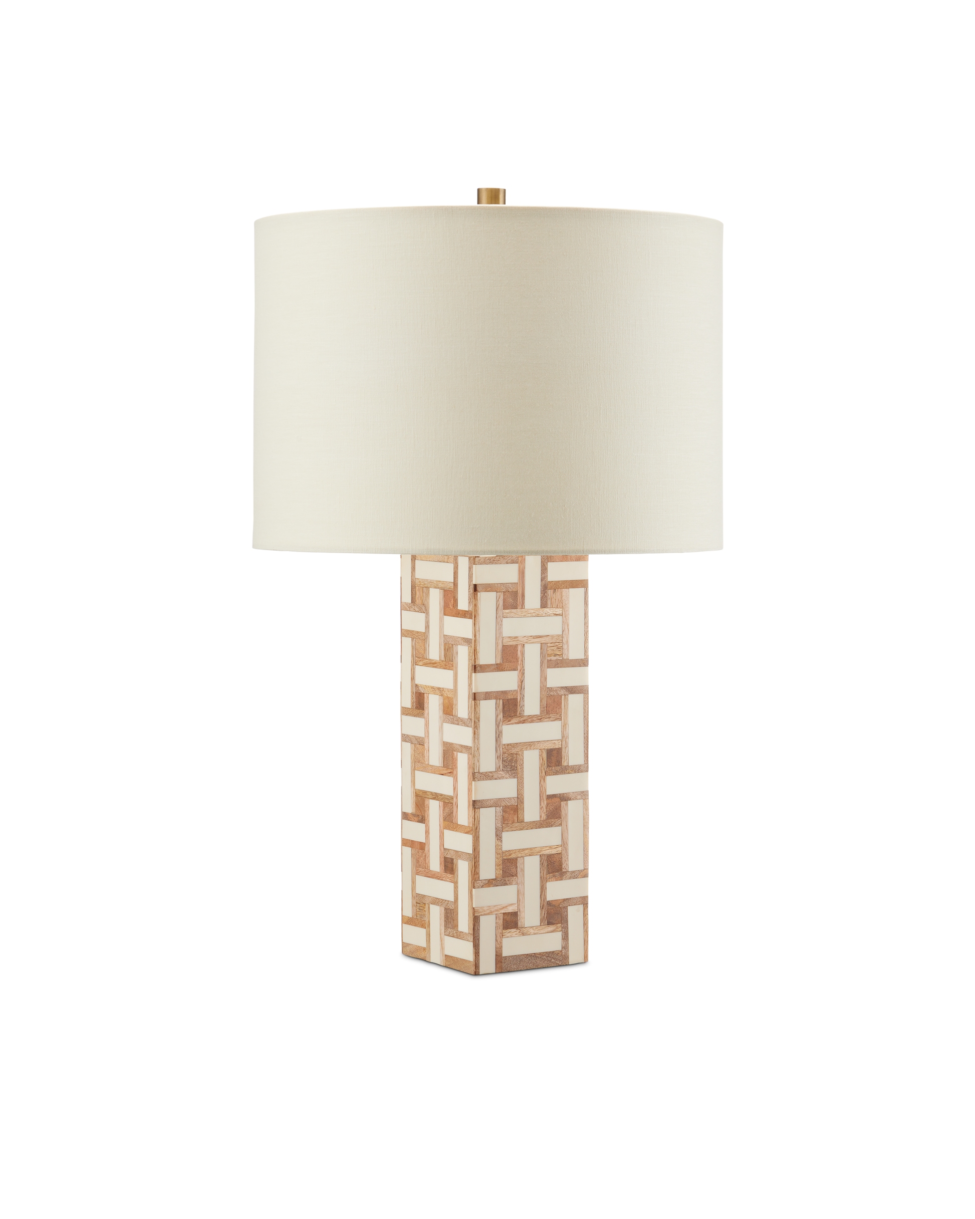The Aarna Cream Table Lamp, with its basketweave pattern, is made of pieces of wood interspersed with strips of ivory composite. The contrast of the textural woodgrains and the sleek composite creates an interesting aspect to this design, as do the angular lines of the rectangular body that echo the scale of the elongated pieces on its surface. The drum shade contributes to the feeling of complexity that is obvious with this design.