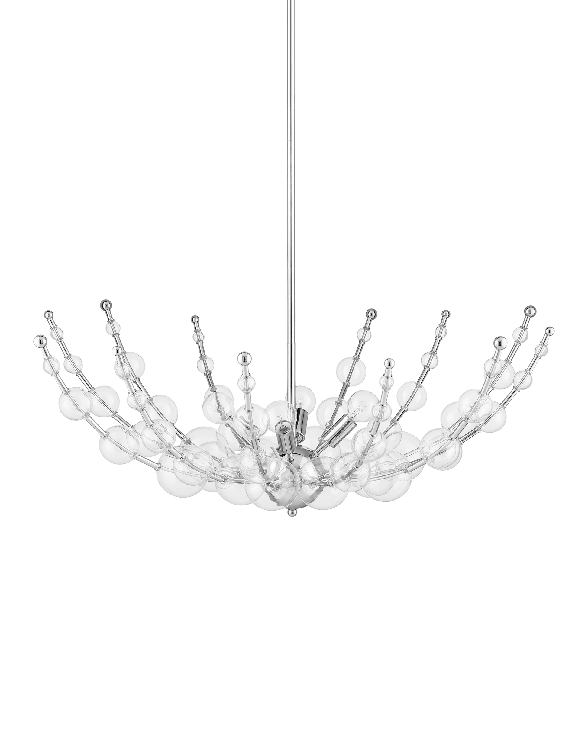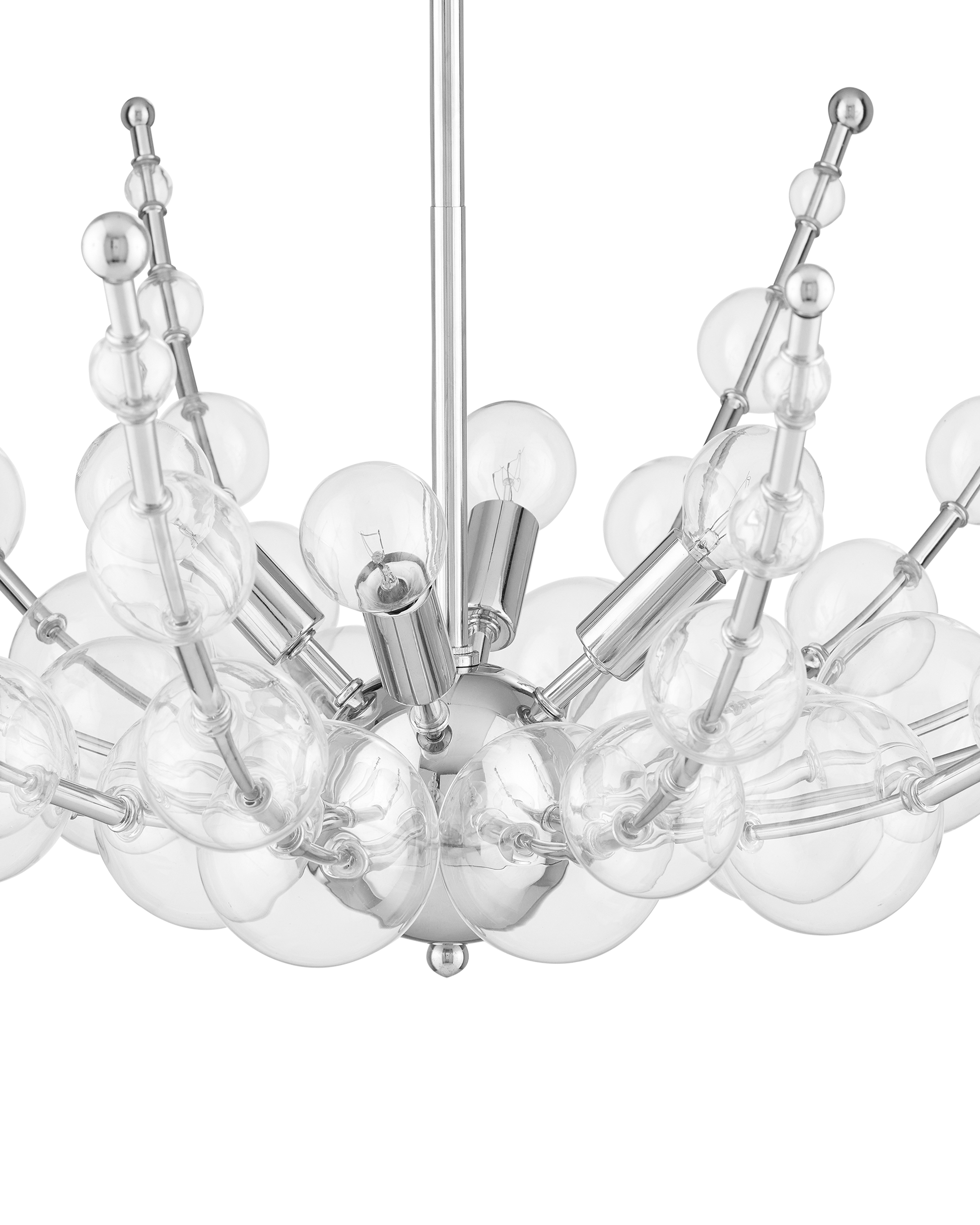 The Abberton Chandelier will bring a wow-factor to any room it illuminates. Designed by Ian Thornton, the silver chandelier with its polished nickel finish will effervesce when the lights are switched on as the glow reflects on and through the glass globes that graduate from large at the fixture's central cog to small near the apex of each stem. Design details of note are the rod stem from which it hangs, the bulbs that echo the roundness of the glass globes, and the circular accent on the ends of the stems that mimic the shape of the smallest ones. Adjustable from 23" to 61" with use of included chain/rod kit/cable. If your space calls for a longer drop, additional chain/rods/cable is available for purchase.