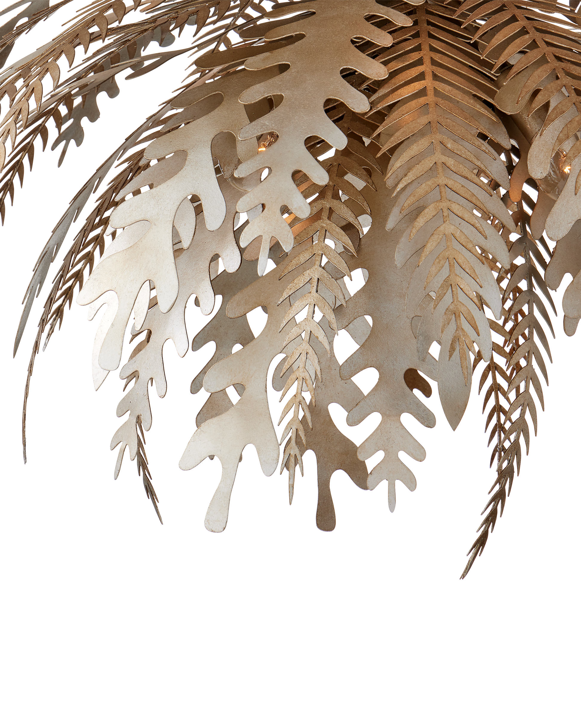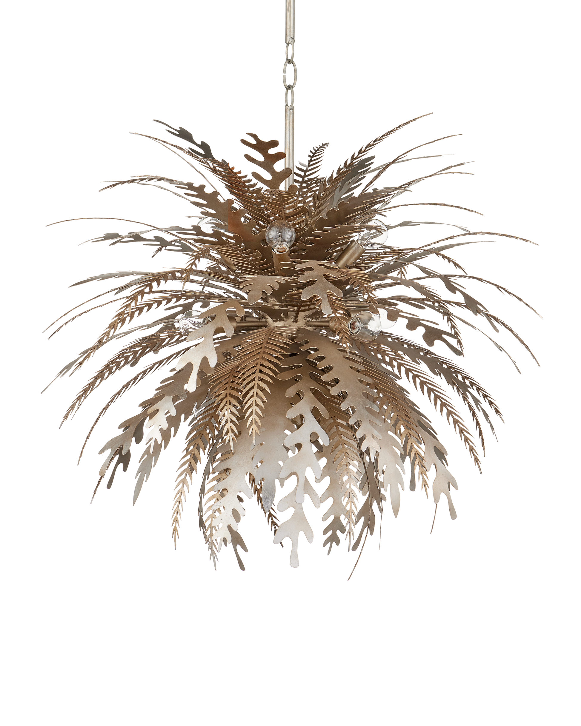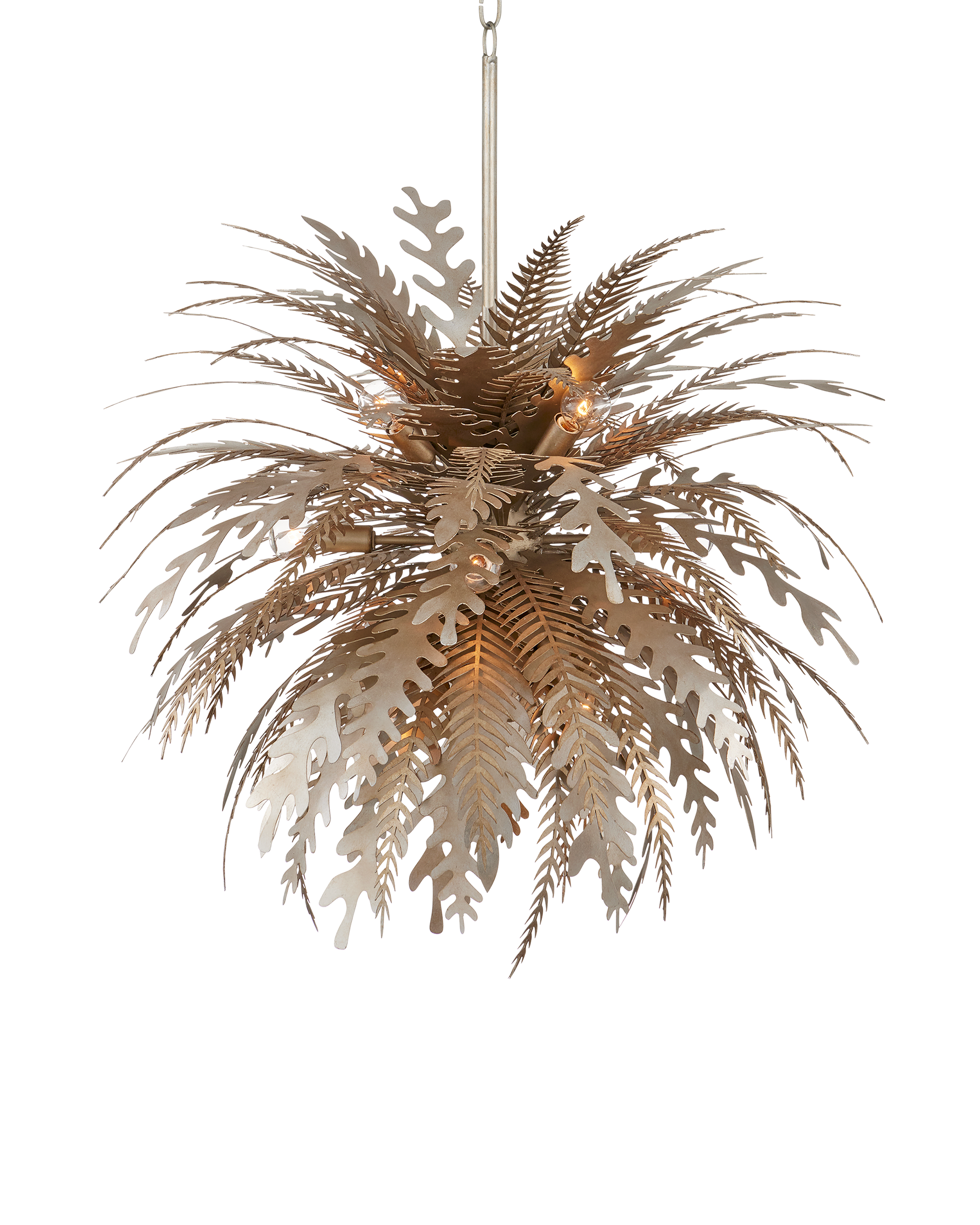 Wildly exuberant in its energy, the Abyssinia Chandelier is a sensational creation exploding with flora in varying wrought iron shapes. Designed by Ian Thornton, the organic, nature-inspired chandelier was seriously labor-intensive to create, as each of the leaves is individually laser cut and bent, then welded to a center core to mimic how a plant would grow from a planter. The intermingling of contemporary silver leaf and dark silver leaf finishes creates an even more intense sense of texture. The hanging rods are adjustable. Adjustable from 40" to 86" with use of included chain/rod kit/cable. If your space calls for a longer drop, additional chain/rods/cable is available for purchase.