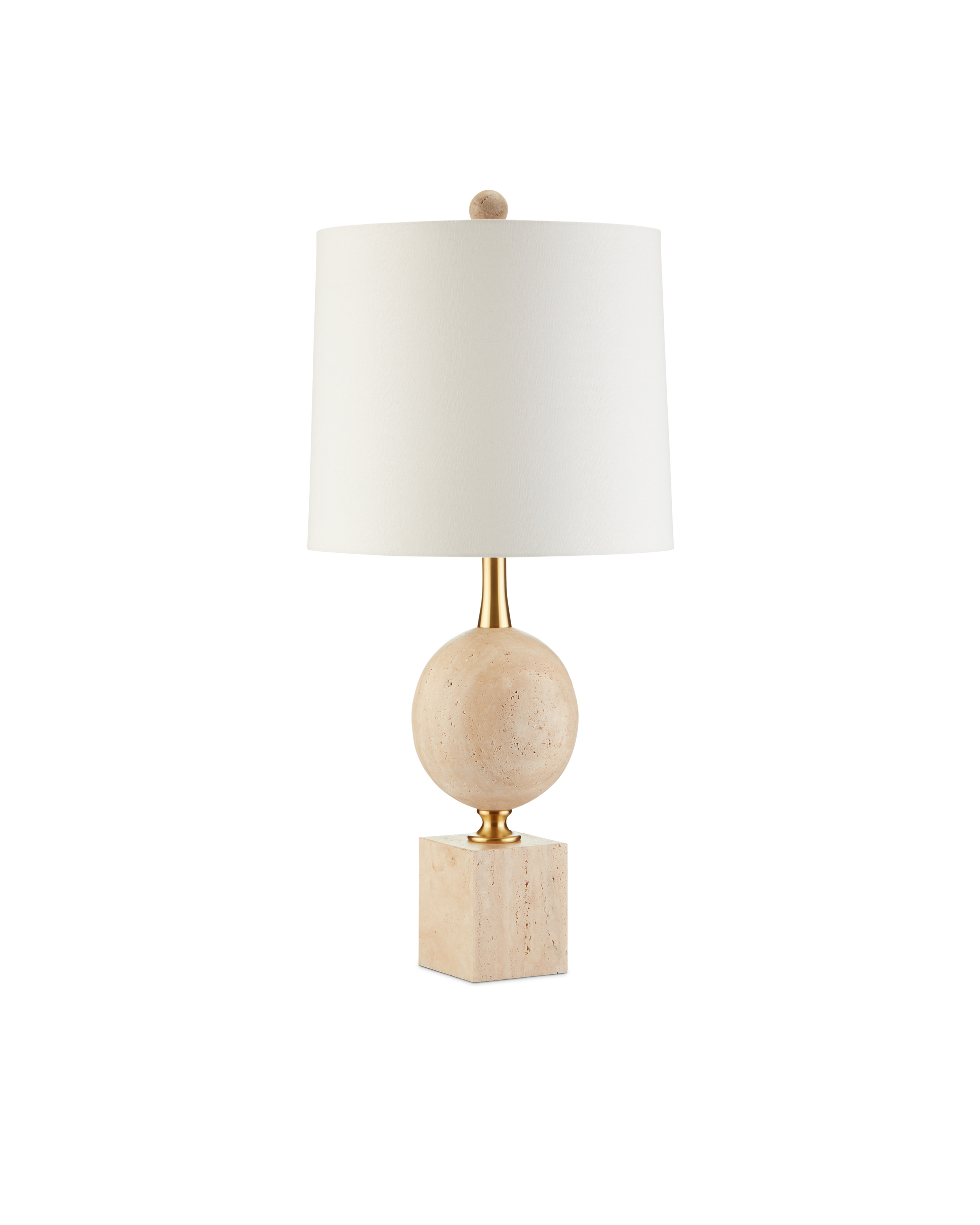 The Adorno Table Lamp is a modern take on a classic design. The beige marble shapes connected by metal elements in an antique brass finish are clean-lined to bring it into the 21st century. The warm finish picks up the darker tones in the veining of the marble to bring texture to the lamp, which is topped with a shade that perfectly reflects the scale of the lamp. Each surface is unique so no two are exactly alike.