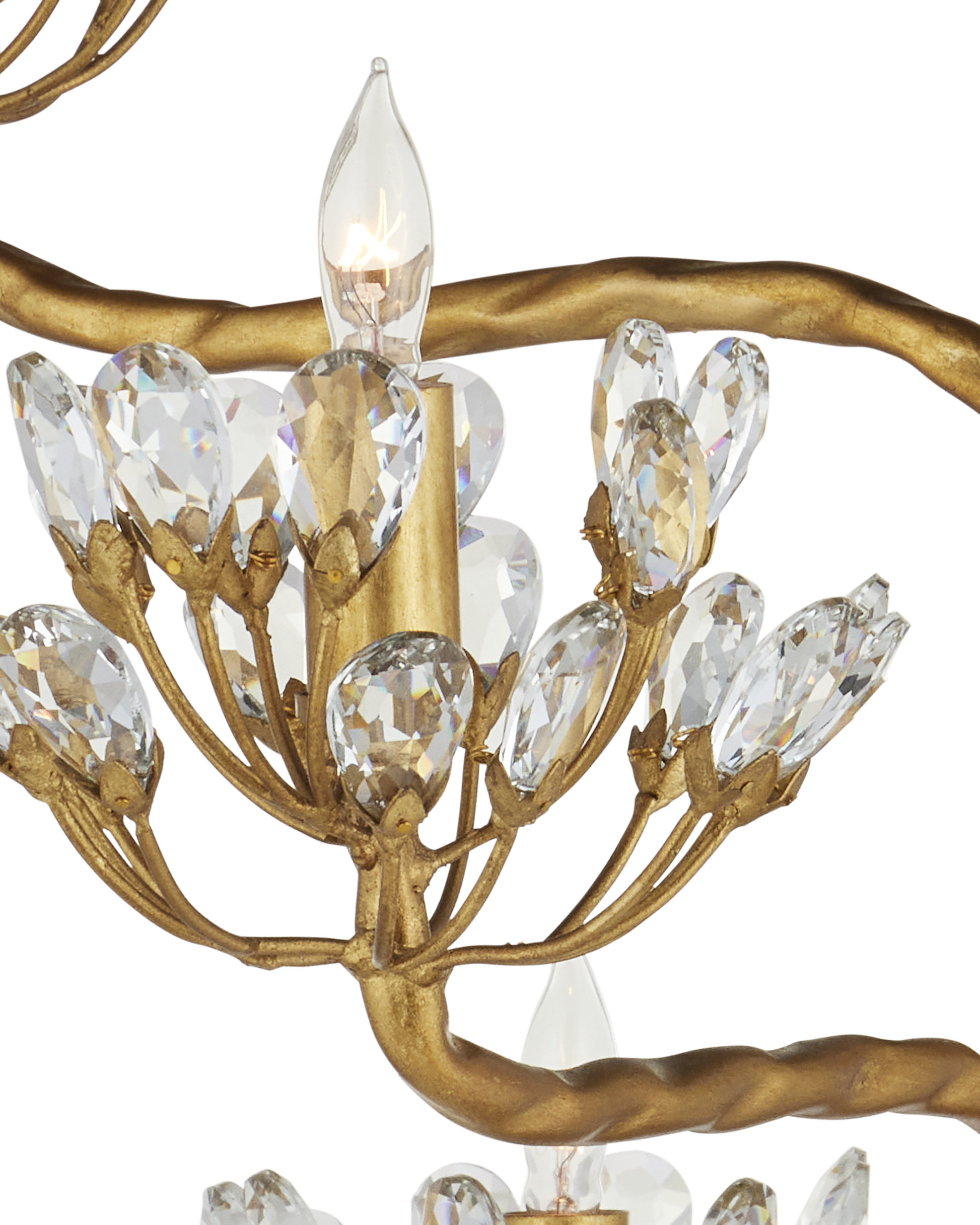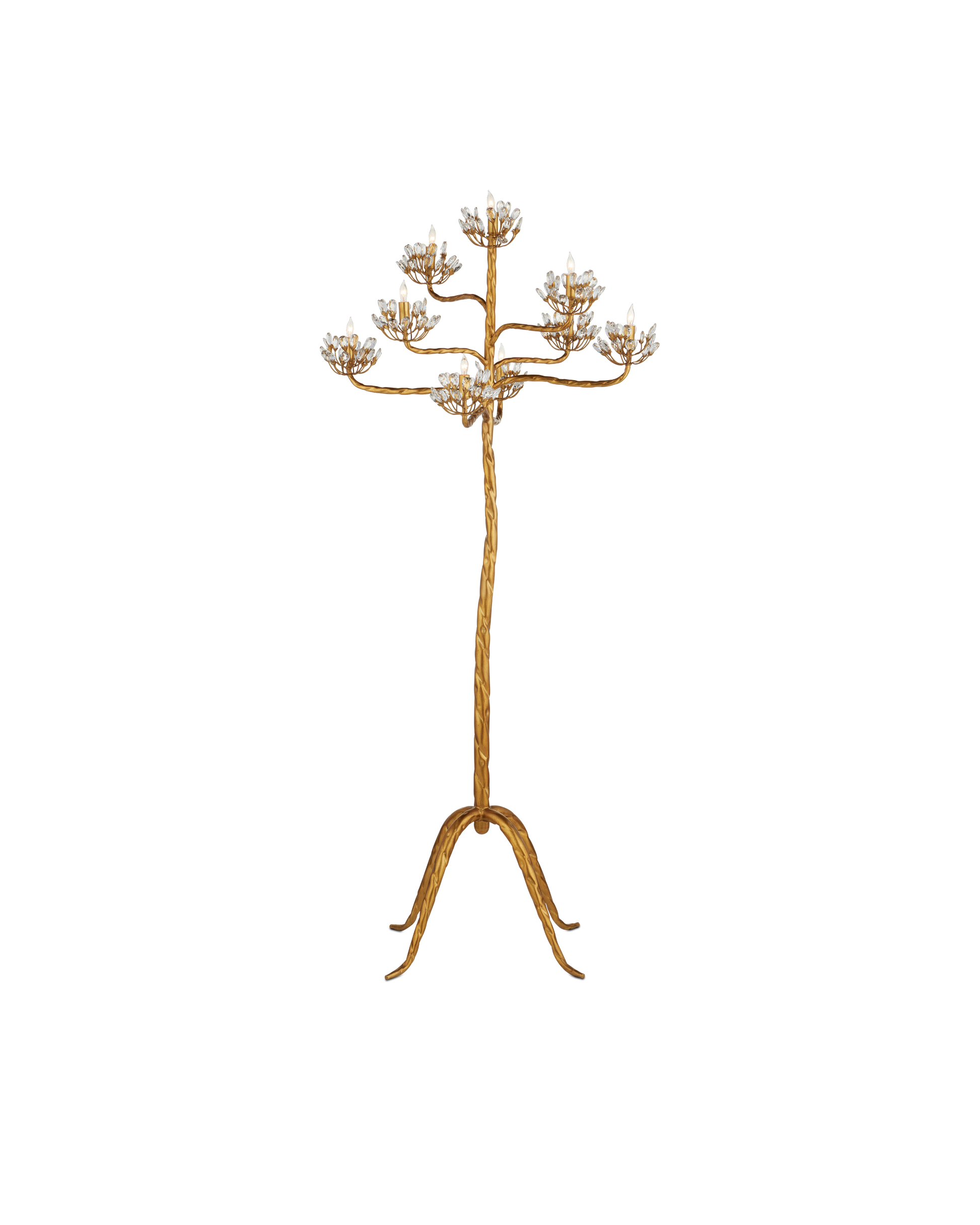 The Agave Americana Floor Candelabra is a grand piece inspired by the Century plant of the American desert. Nine lights are surrounded by clusters of faceted crystals fitted to branches of hand-forged metal tubes in a contemporary gold leaf finish. The gold floor lamp is in our Marjorie Skouras Collection.