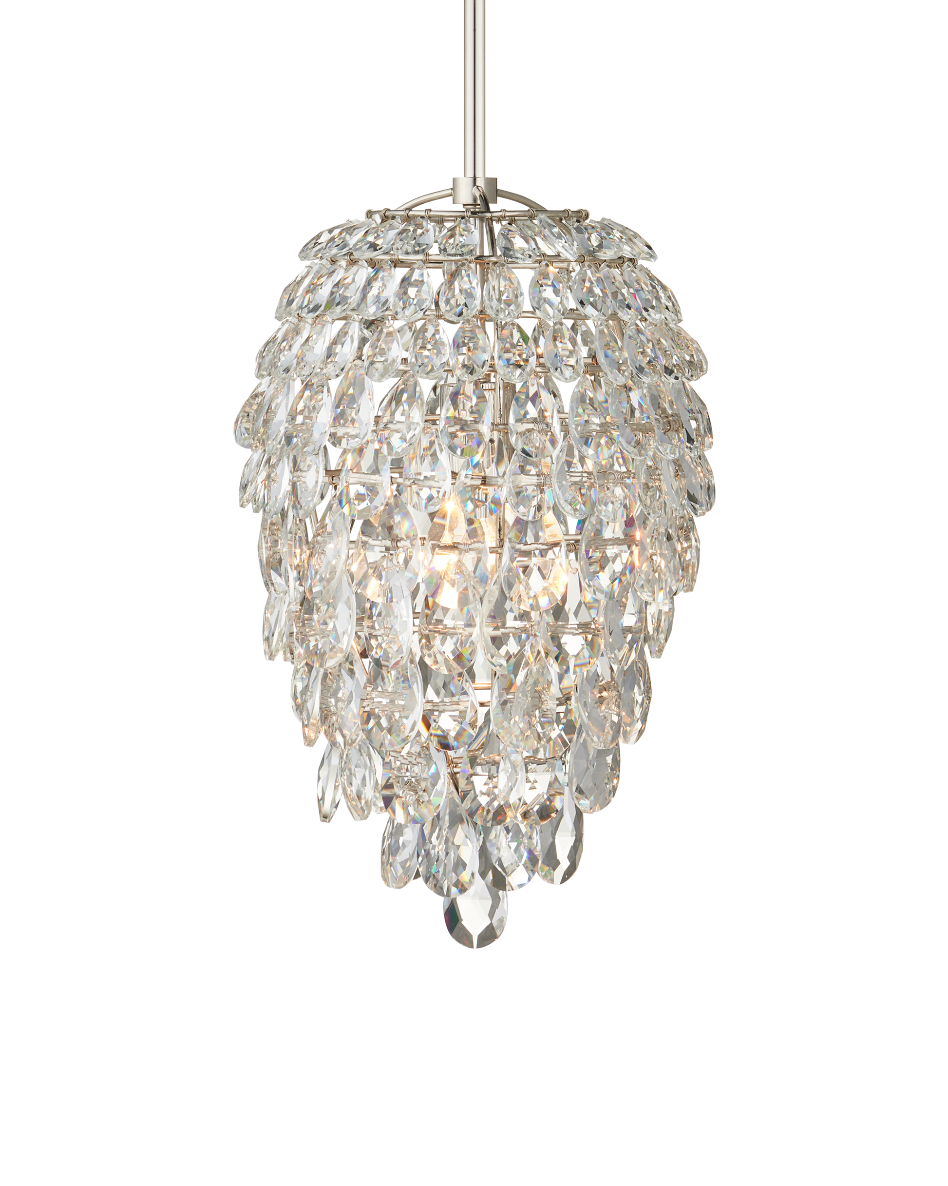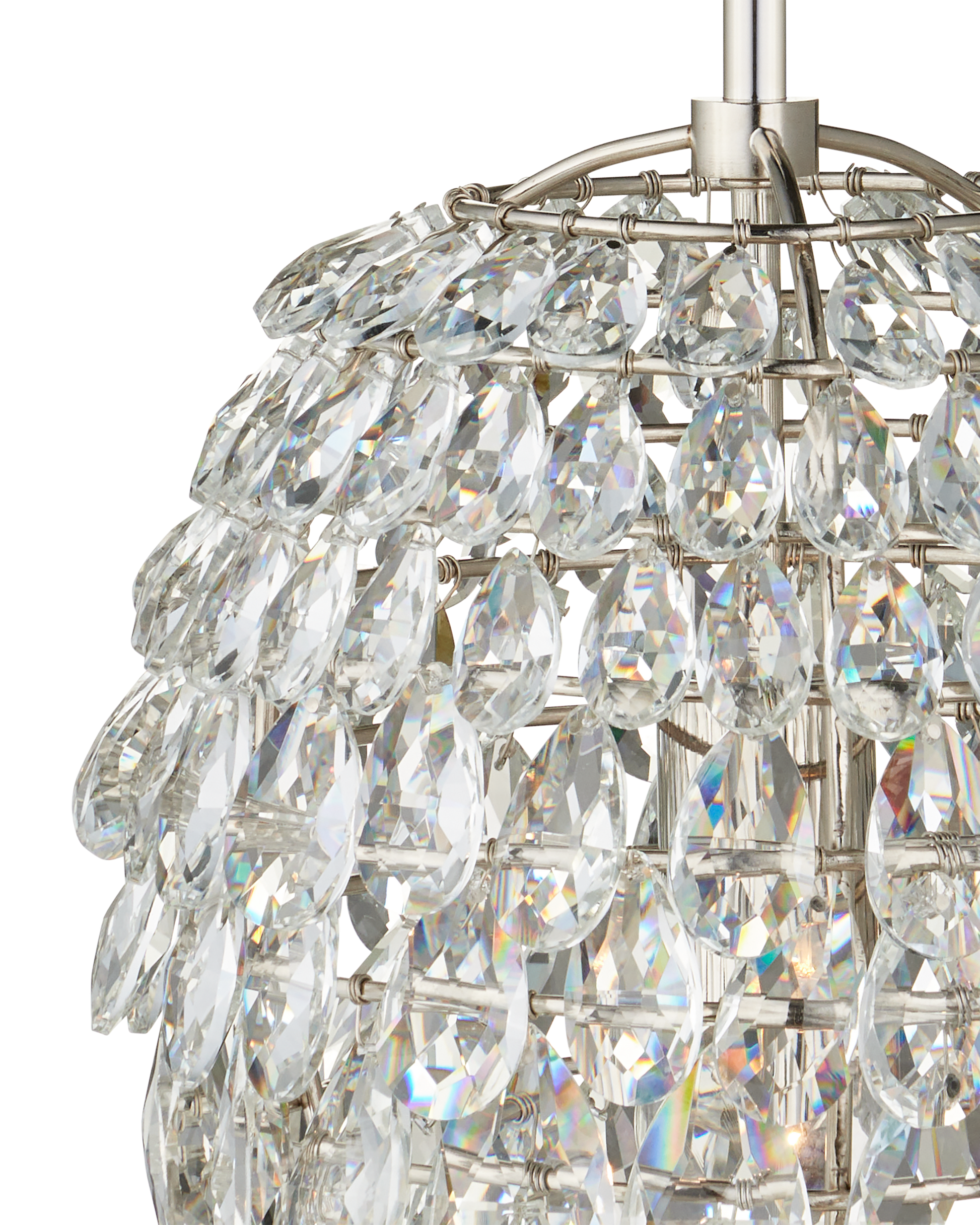 The shade of the Aisling Pendent is made up of hundreds of teardrop optic crystals. This gleaming fixture designed by Iian Thornton was inspired by antique brooches. The metal hardware on the crystal pendant, in a polished nickel finish, is so luminous, it complements the glow perfectly. Adjustable from 23" to 59" with use of included chain/rod kit/cable. If your space calls for a longer drop, additional chain/rods/cable is available for purchase.