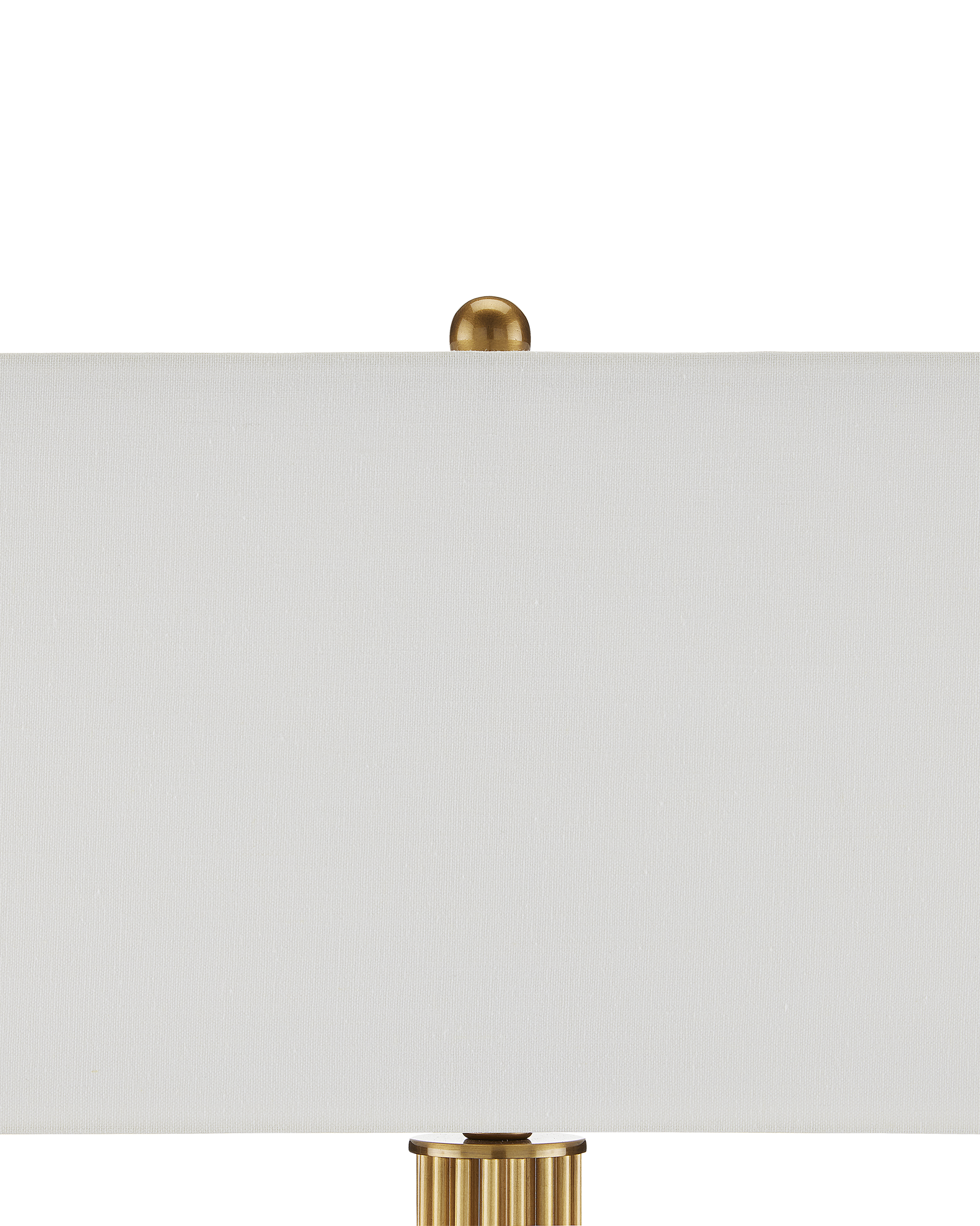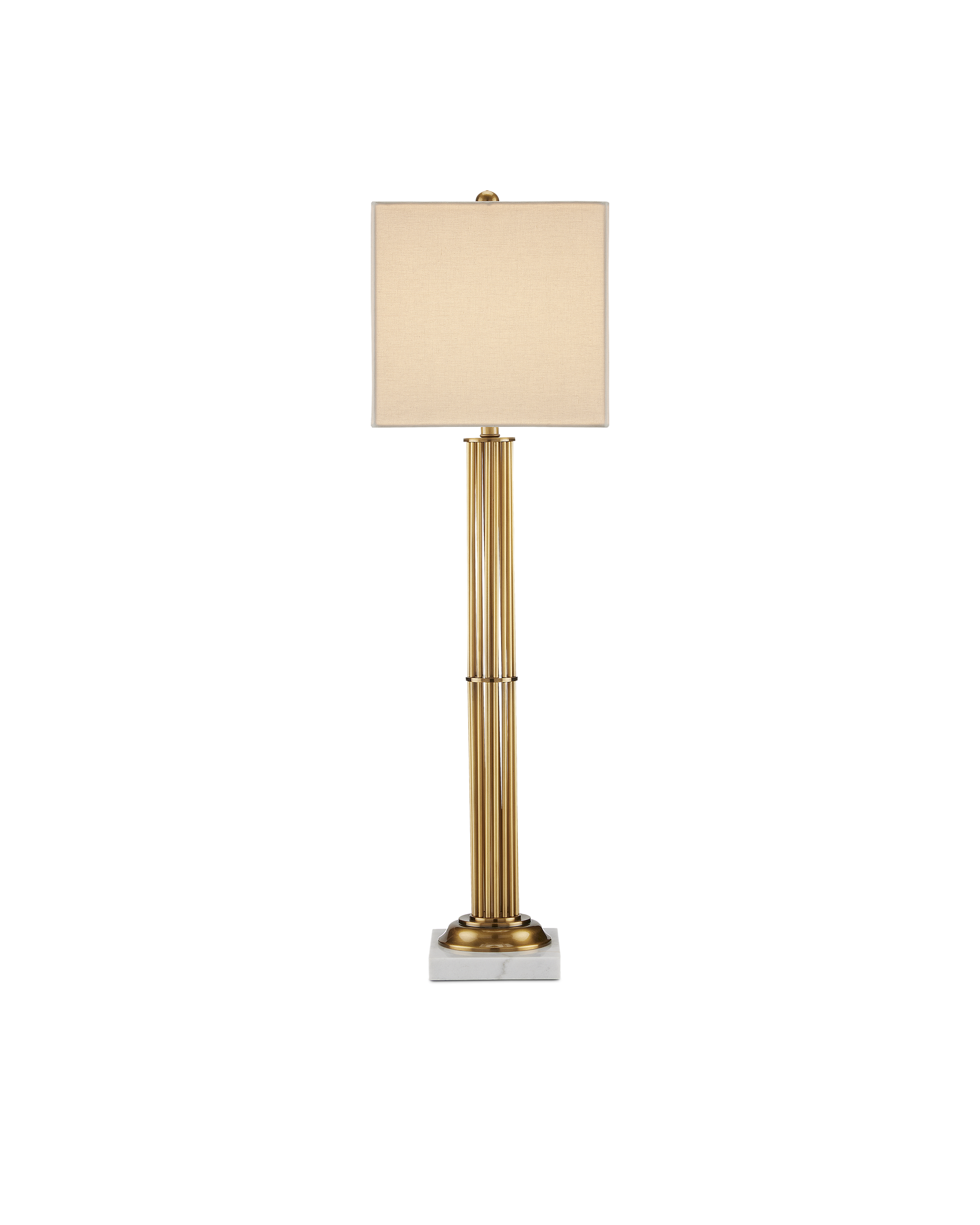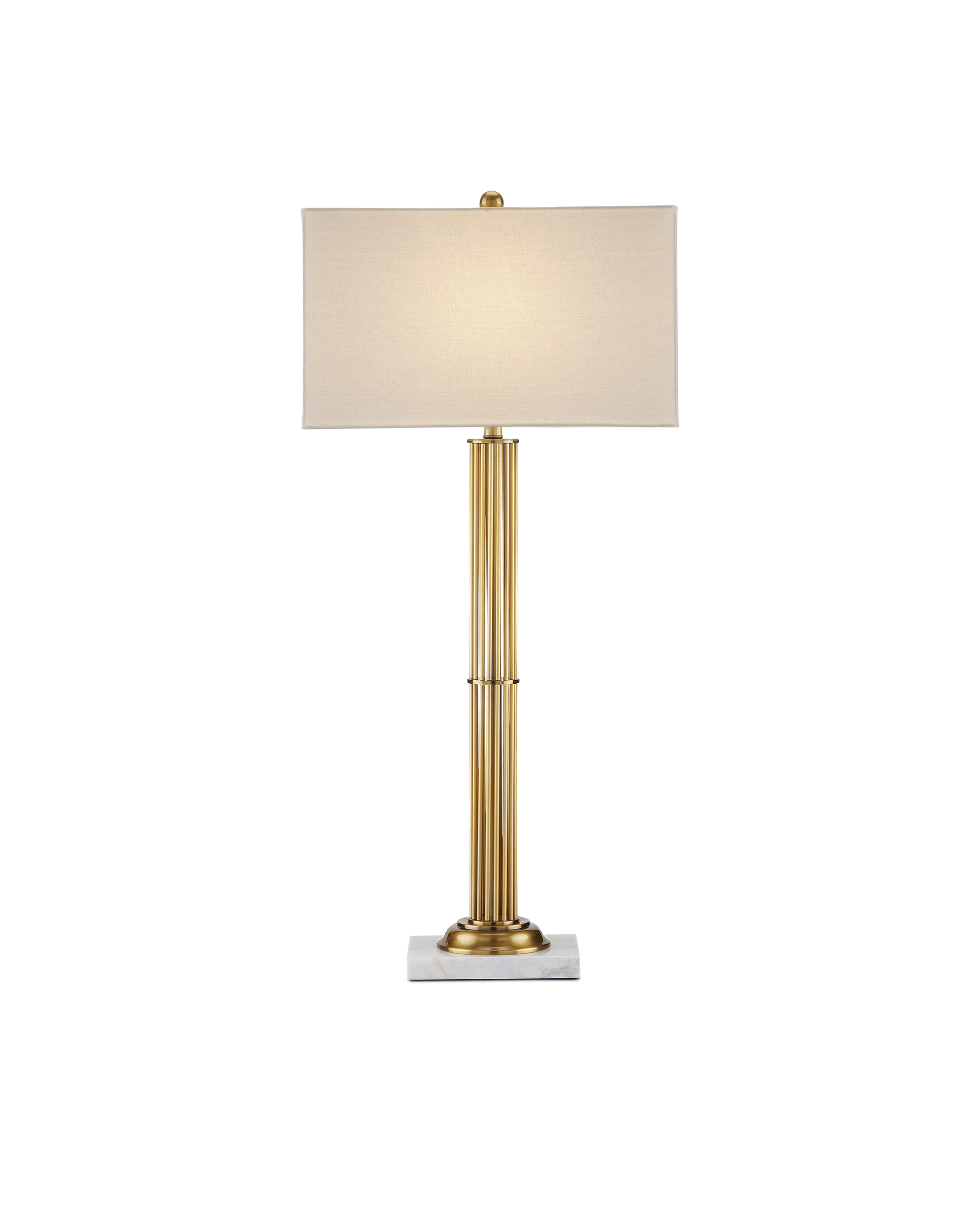 The design story the Allegory Table Lamp tells is a sleek and gleaming one. The extra tall and slender cylindrical body of the gold lamp is formed from rods made of metal in an antique brass finish that are cleverly clasped together by a thin central ring. The white marble base and rectangular shade are pale elements that contrast the warmth of the metal, including the matching antique brass finial.