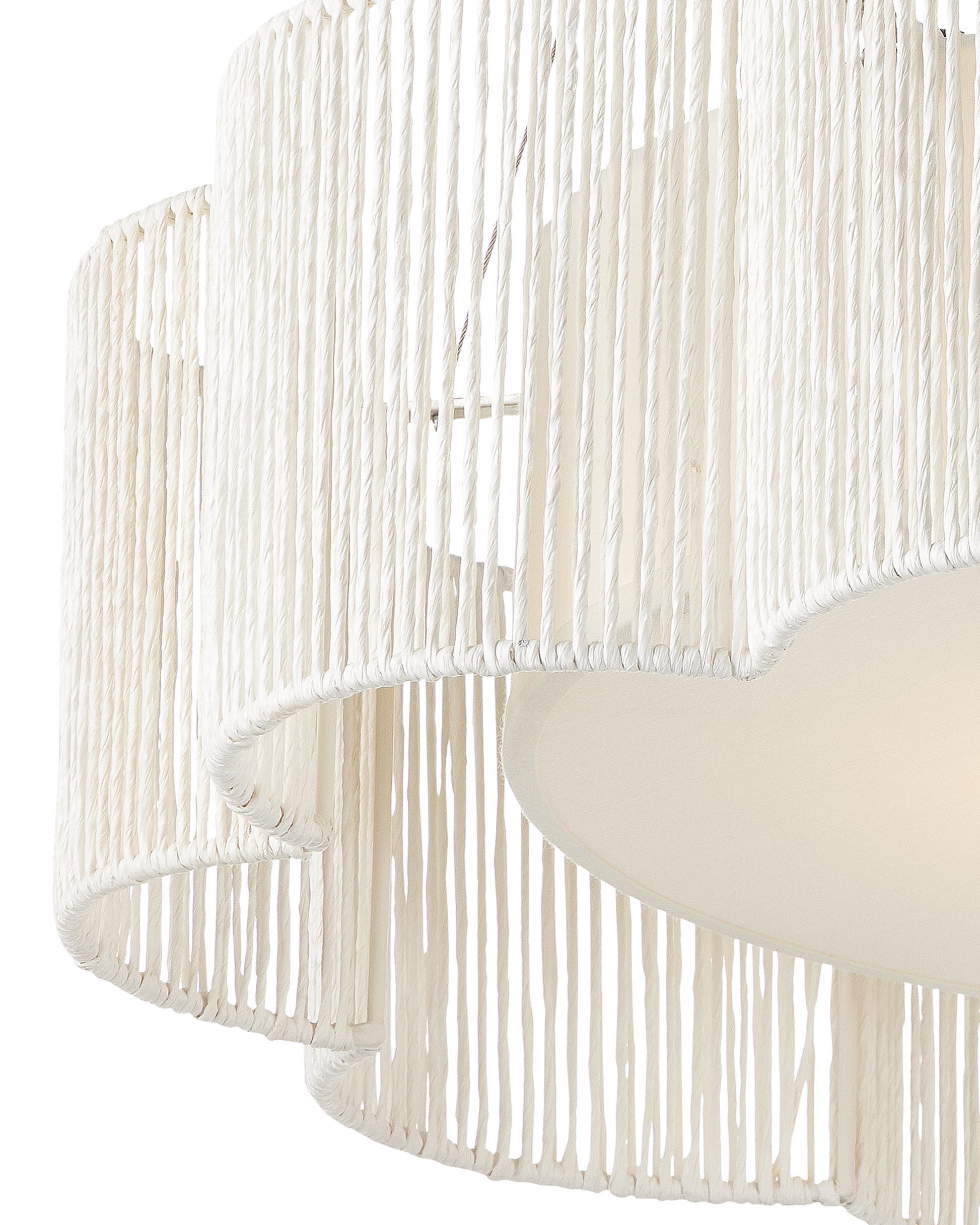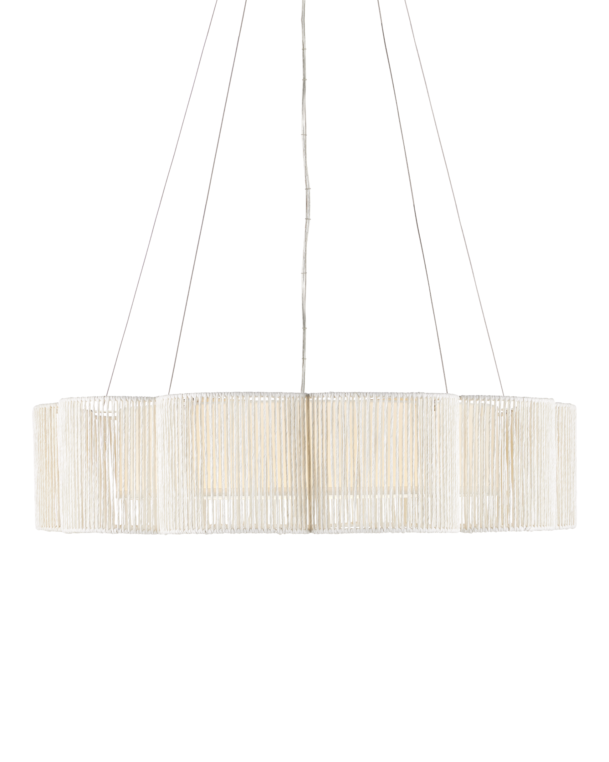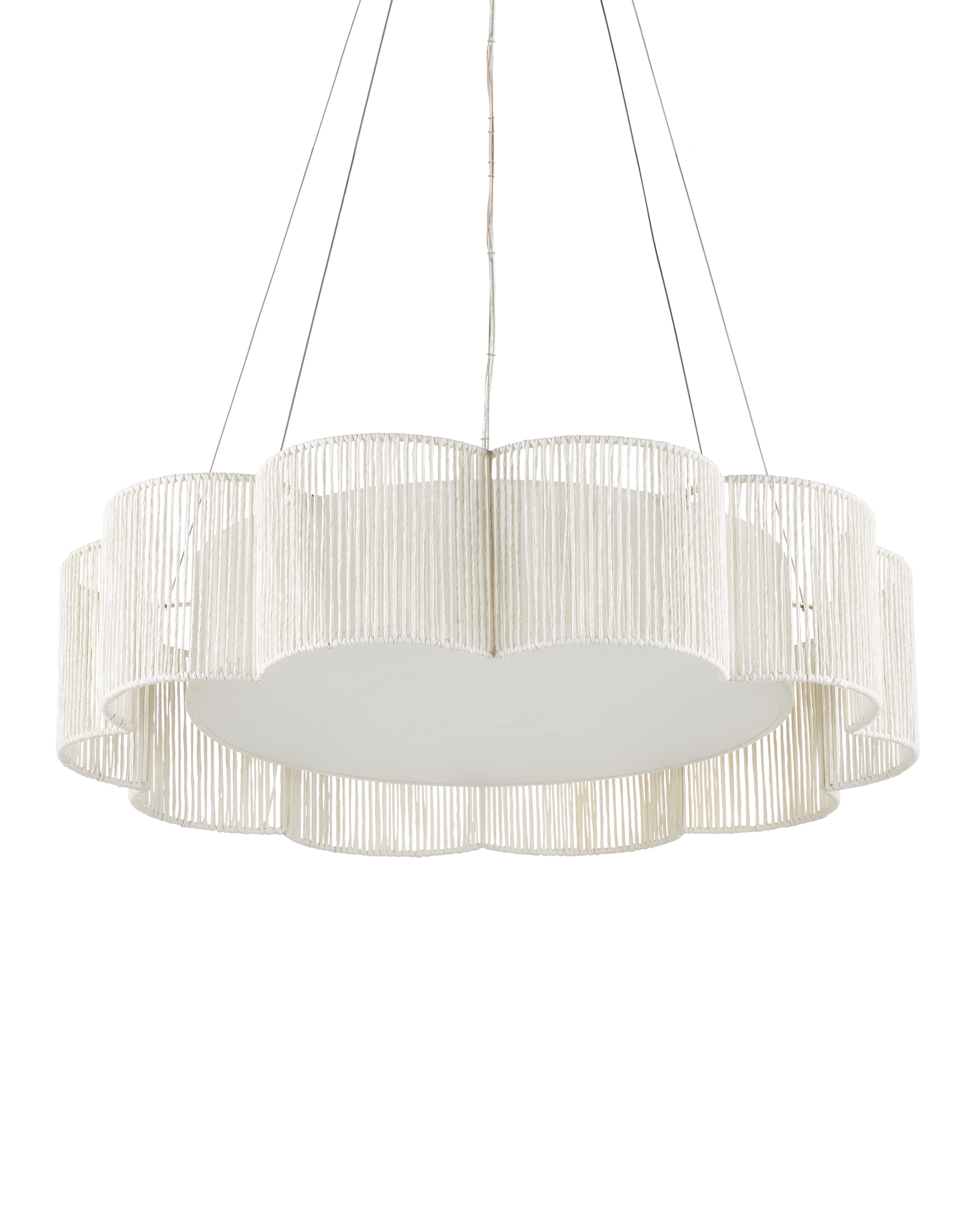 Scallops of Kraft paper twine fold around the wrought iron frame of the Ancroft Chandelier to form a delicate flowing silhouette. The string has a white finish that works in concert with the contemporary silver leaf on the metal to keep the white chandelier light and airy. This is enhanced by the fact that it is hung from aircraft cable, which is adjustable. The integrated LED light flows through a diffuser fitted to the bottom of the shade. Adjustable from 27" to 129.25" with use of included chain/rod kit/cable. If your space calls for a longer drop, additional chain/rods/cable is available for purchase.