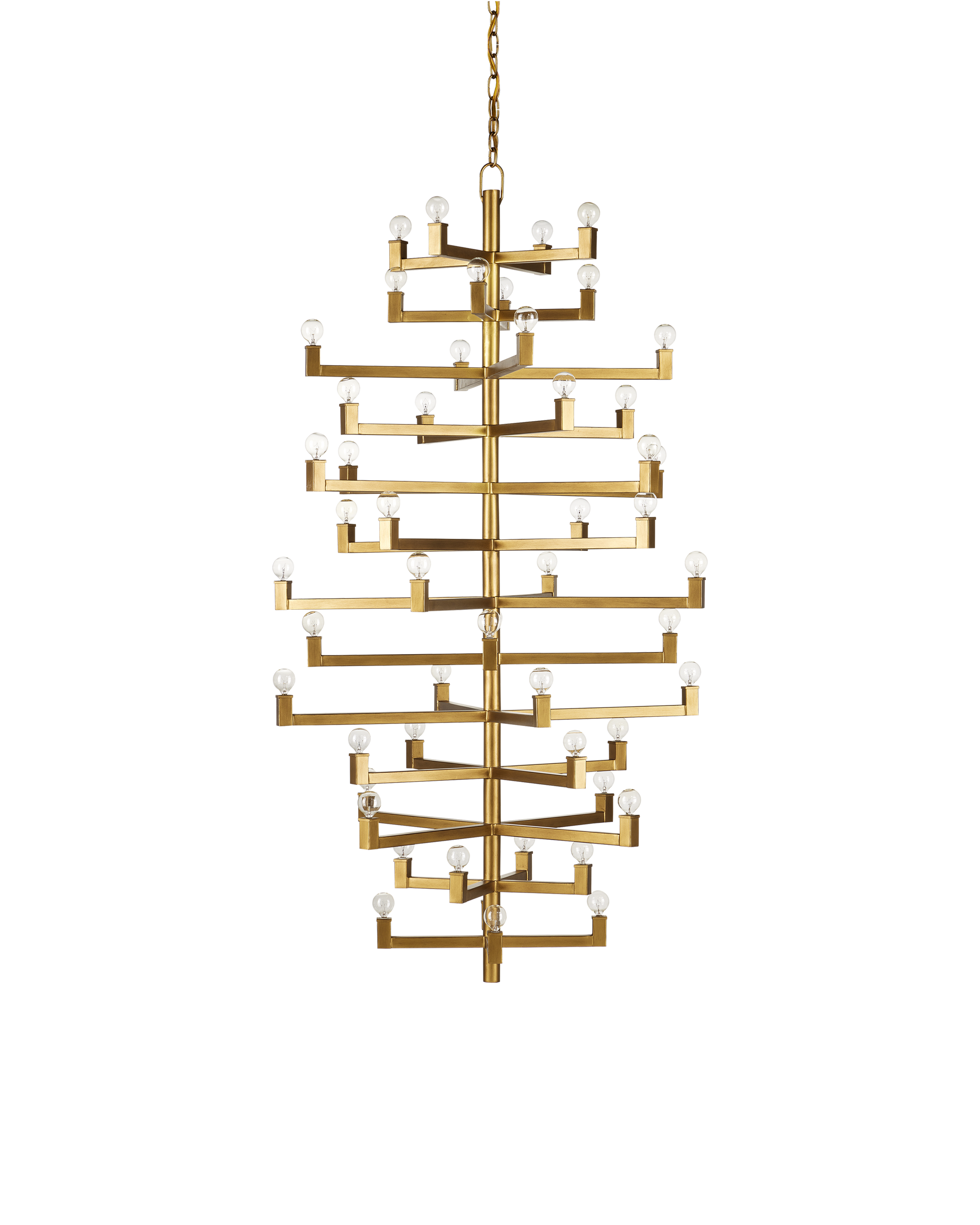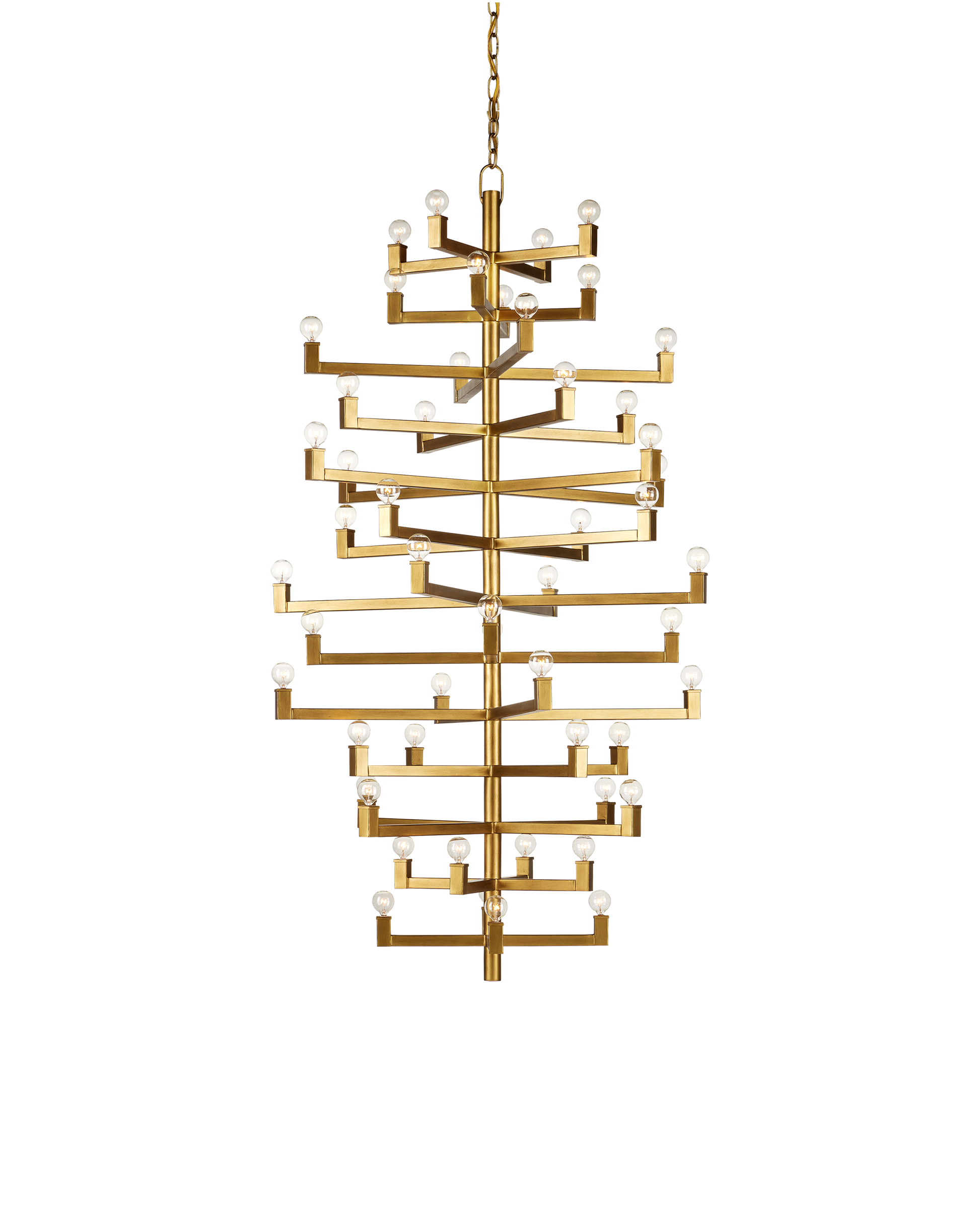 Clean articulated arms with resolute geometries make the big, bold Andre Grande Chandelier a powerful statement that can easily swing from contemporary to transitional styles, and many in between. Made of wrought iron in a brass finish, the gold chandelier will take on other personalities when the shapes of the bulbs are changed. Tall foyers and great rooms with high ceilings are perfect spots for this luminous modern light fixture with a stunning 52 lights. Adjustable from 78" to 169" with use of included chain/rod kit/cable. If your space calls for a longer drop, additional chain/rods/cable is available for purchase.