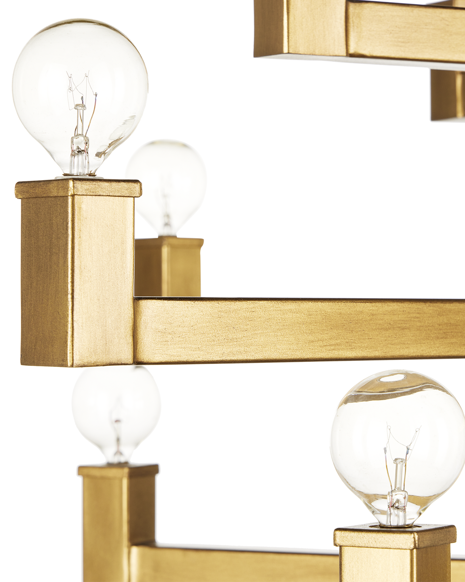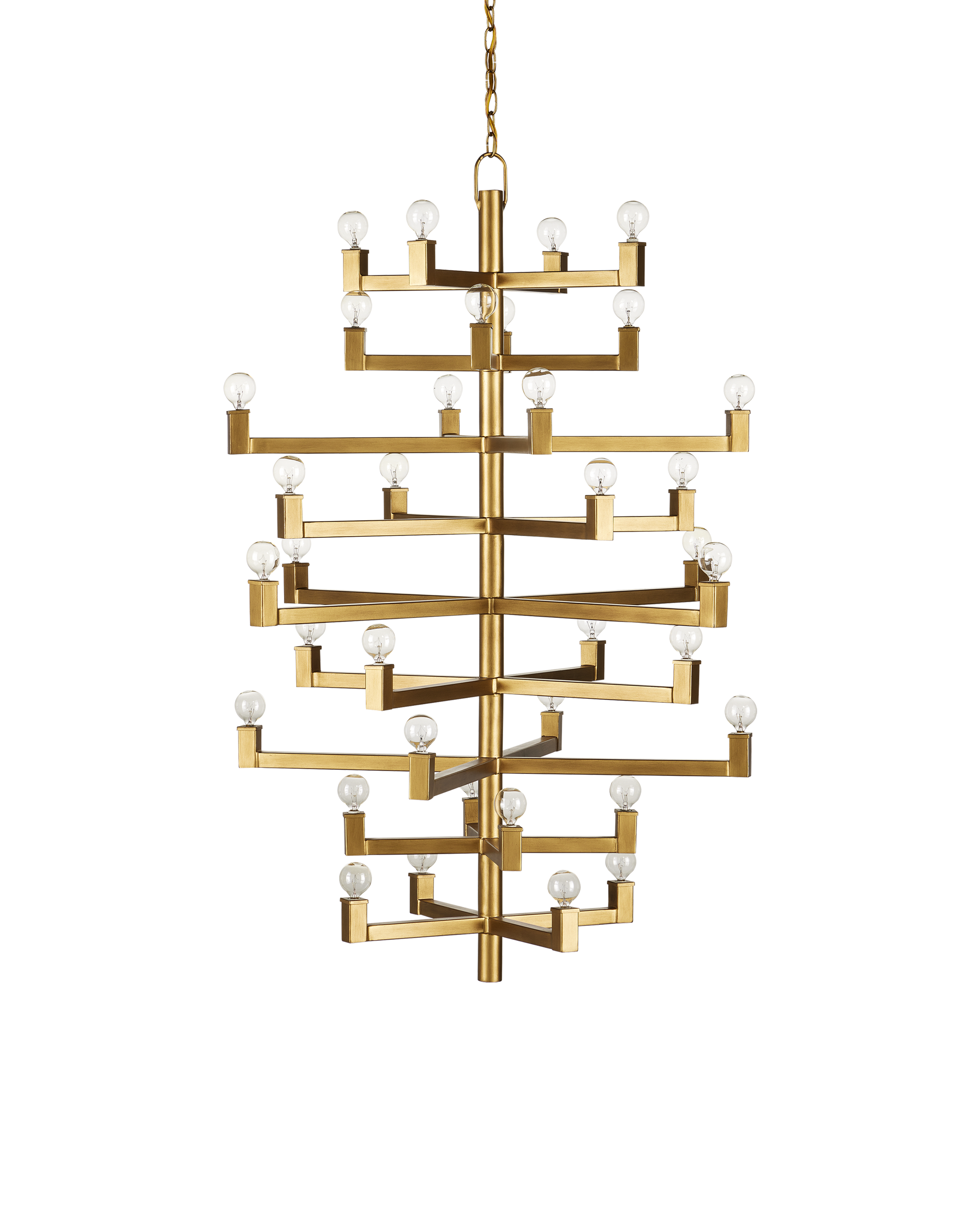 Clean articulated arms with resolute geometries make the big, bold Andre Large Chandelier a powerful statement that can easily swing from contemporary to transitional styles, and many in between. Made of wrought iron in a brass finish, the gold chandelier will take on other personalities when the shapes of the bulbs are changed. Tall foyers and great rooms with high ceilings are perfect spots for this luminous modern light fixture, boasting an impressive 36 lights. Adjustable from 57.5" to 126.5" with use of included chain/rod kit/cable. If your space calls for a longer drop, additional chain/rods/cable is available for purchase.