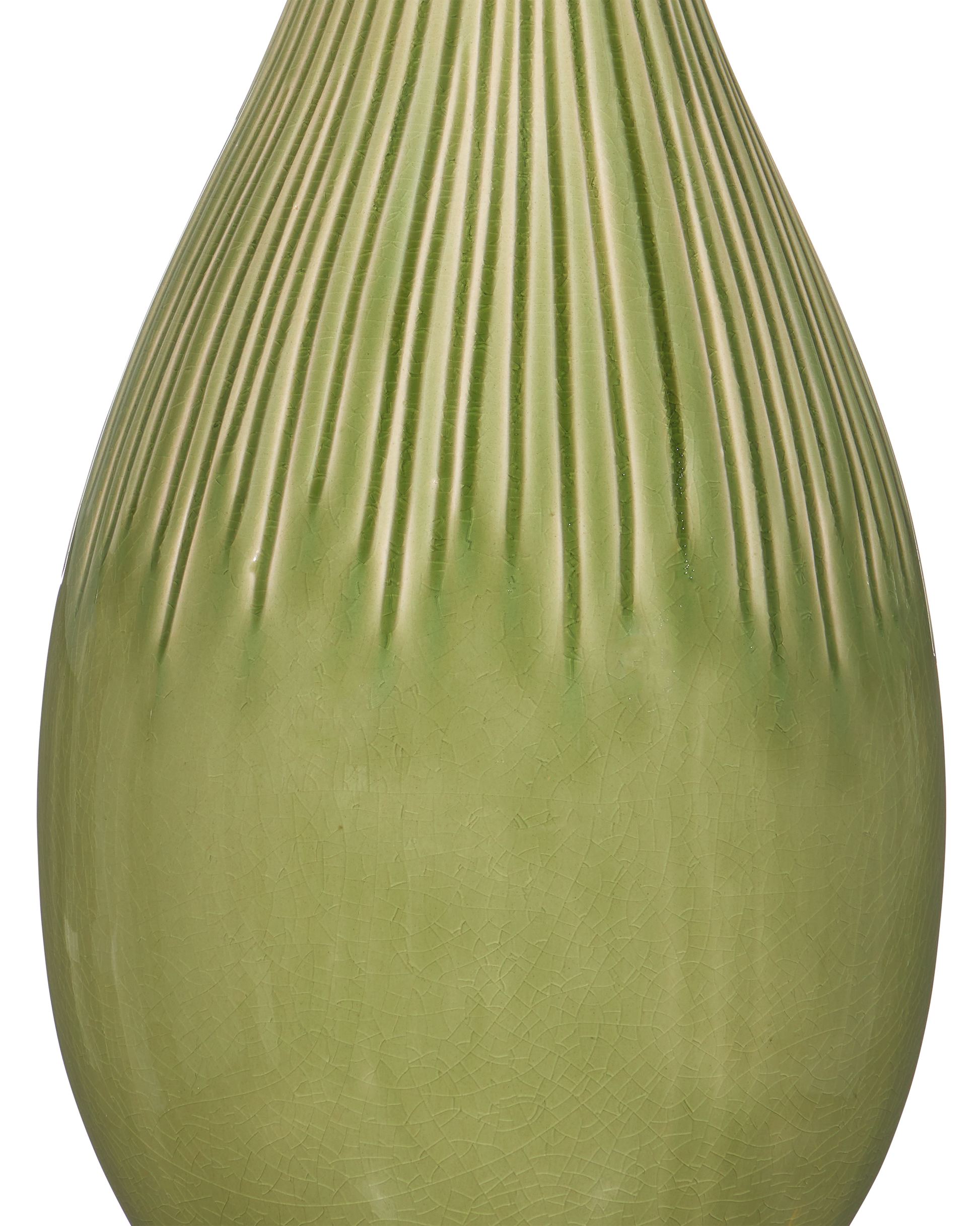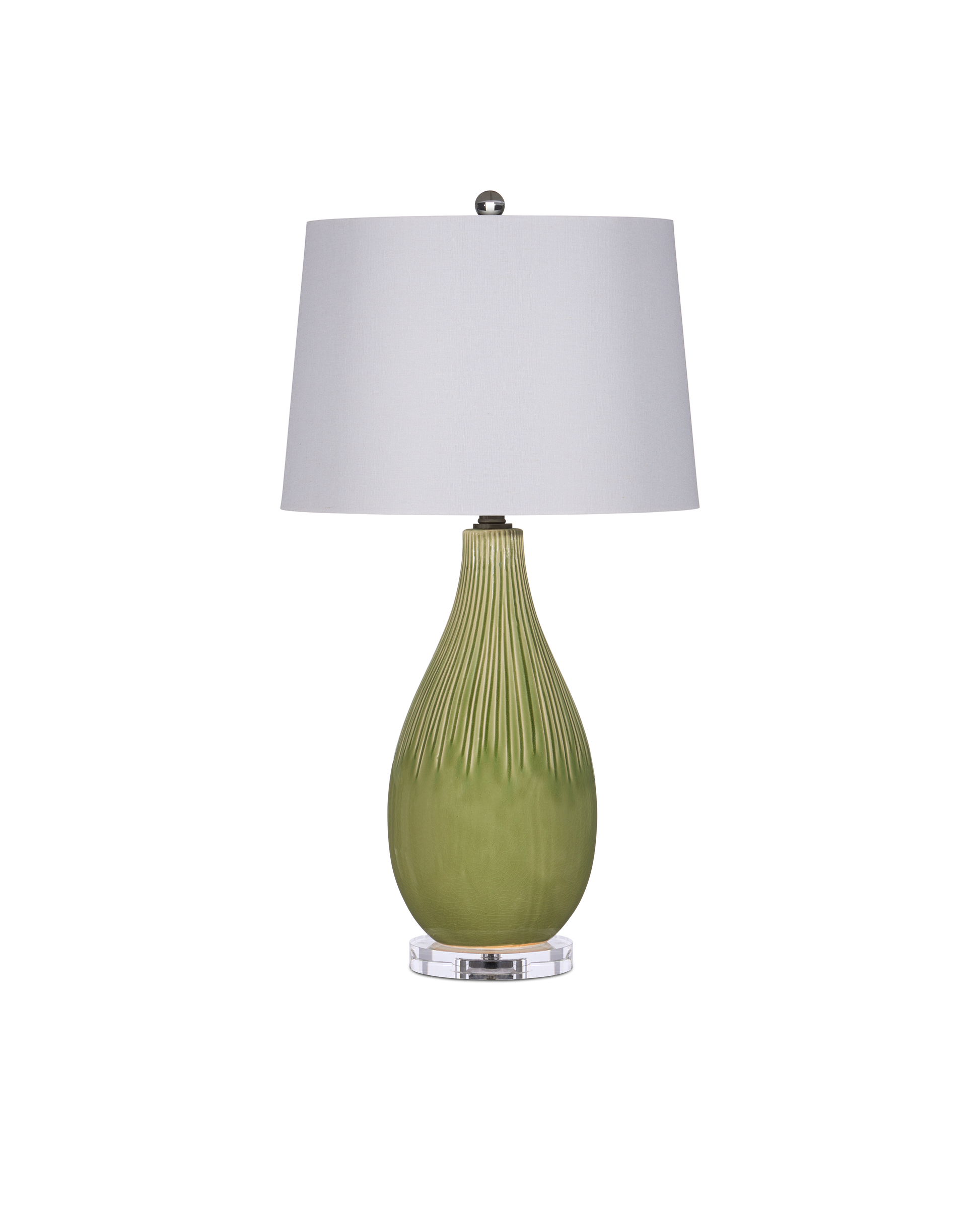 The Anjou Table Lamp is a glamorous creation made of ceramic with a rich green glazing that has been artfully applied to flow seamlessly down from the striations that are carved into the top section of the pear-shaped lamp. The optic crystal base and finial are luminous accents, and the satin brass finish on the hardware is warm in tone, as is the linen natural shade that tops the green lamp.