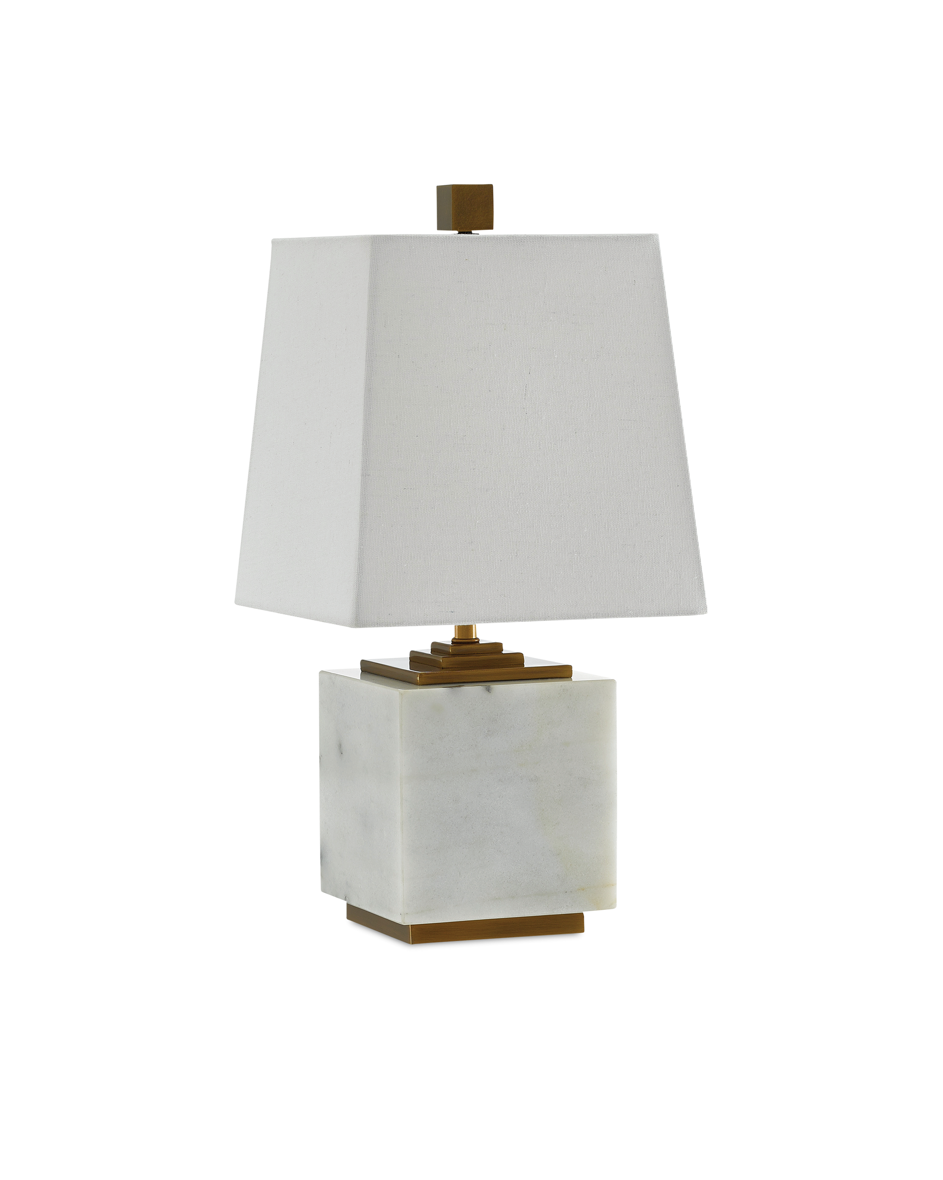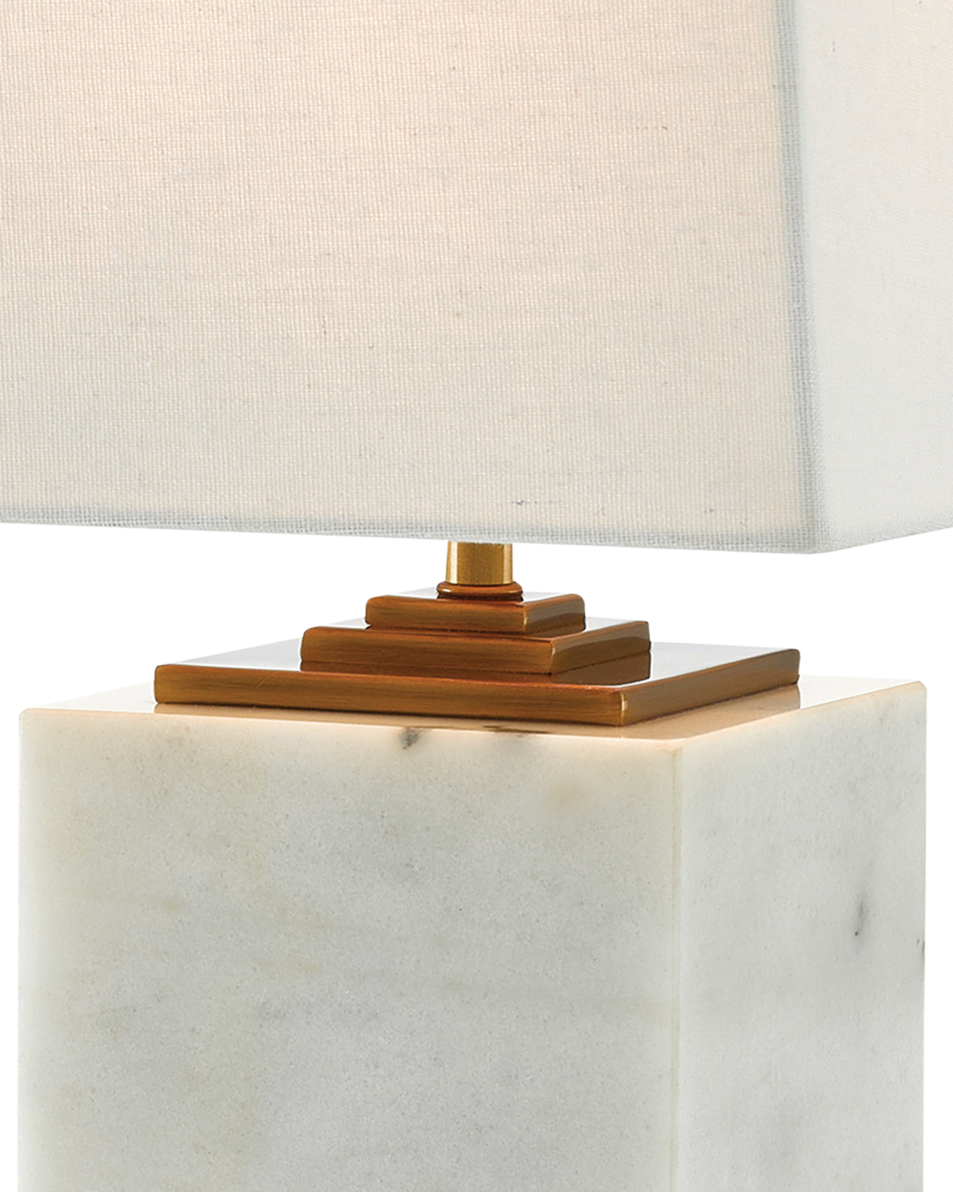 The Annelore Table Lamp is made from a block of white marble with stacked plates of metal above its body and a single-slab base below it. Along with the tall metal finial in an antique brass finish, these elements contrast the marble and the white linen shade. For a black version of this lamp, see our Mairin Table Lamp.