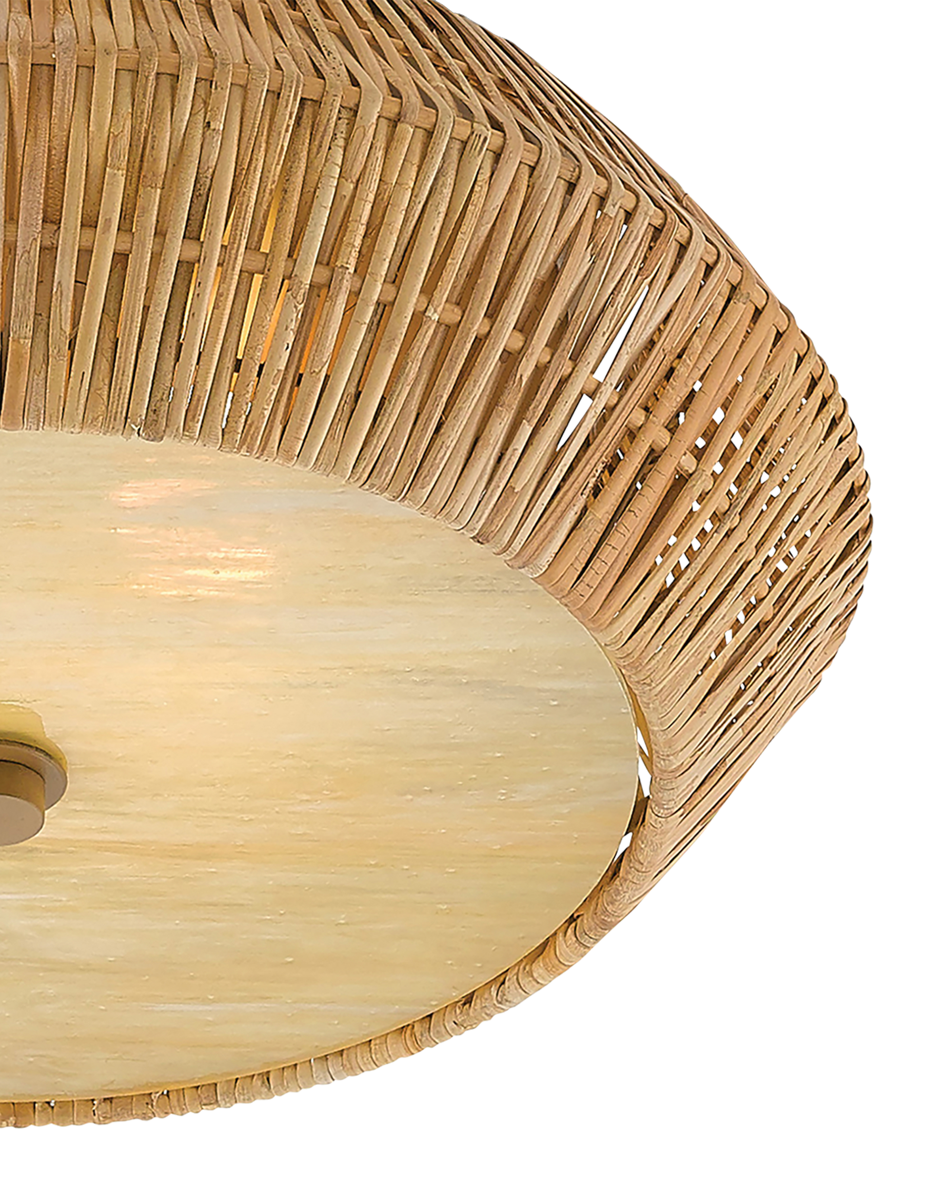 Painstakingly woven by artisans who use traditional techniques, the Antibes Flush Mount is a marriage of artistry and high-quality construction. Natural rattan forms the outer ring of a geometric cage fitted with an art glass diffuser to create the rattan ceiling light.