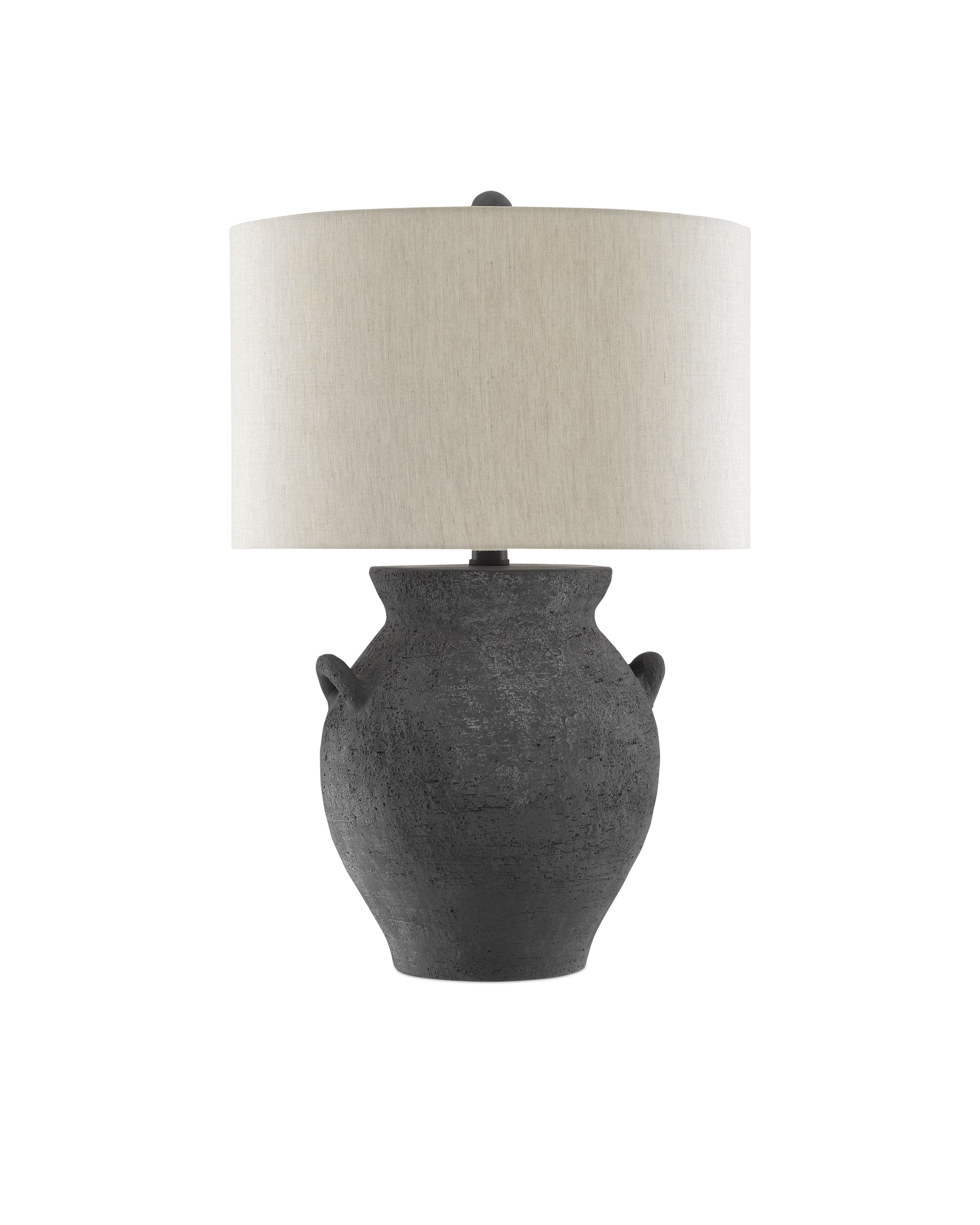 Made of terracotta in a black ash finish, the Anza Table Lamp mimics a ginger jar shape with cleverly placed handles. The roughness of the surface of the terracotta gives this dark gray lamp an extra dose of texture. Wrought iron hardware in a satin black finish is a seamless addition, as is the matching terracotta finial that fastens the natural linen drum shade to the lamp.