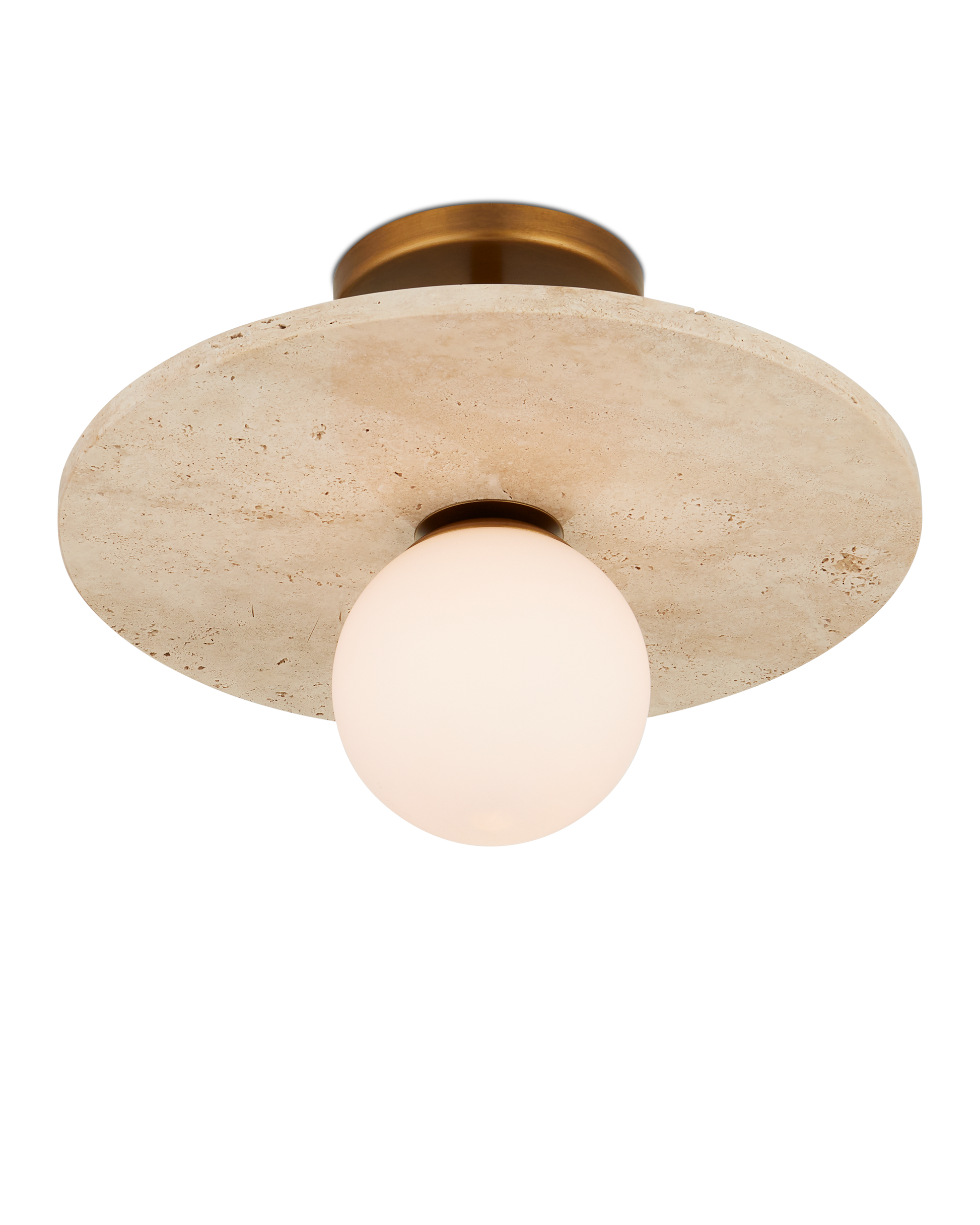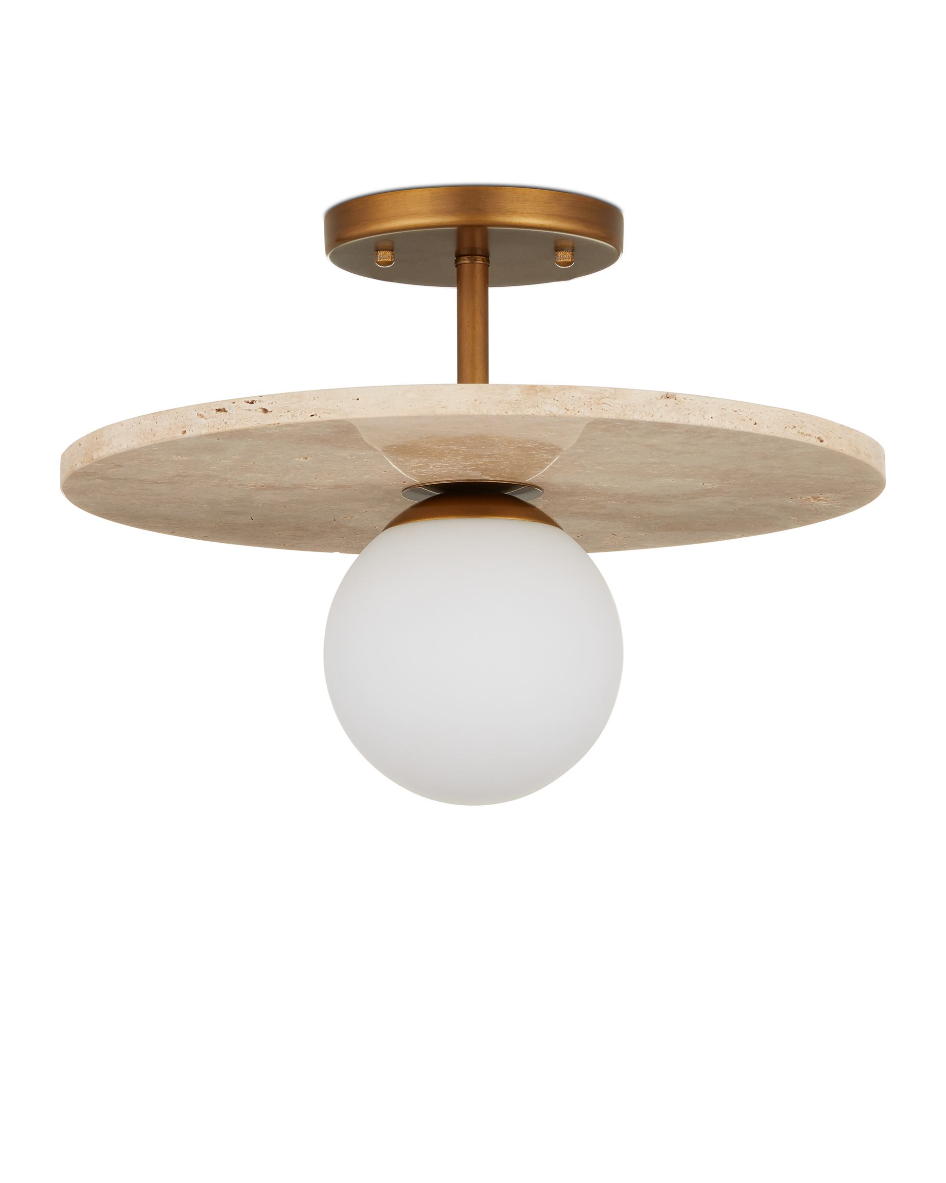 Inspired by a piece of jewelry, the Apricity Semi-Flush Mount features a frosted white cast-glass globe fitted to a travertine disc by metal hardware in an antique brass finish, reminiscent of a large pearl with its beautiful sheen. The simplicity of the profile leaves the glowing orb as the focal point of this design, while the way the illumination strikes the natural stone adds a clever aspect. The warmth of the metal draws out the subtle deeper tones in the travertine.