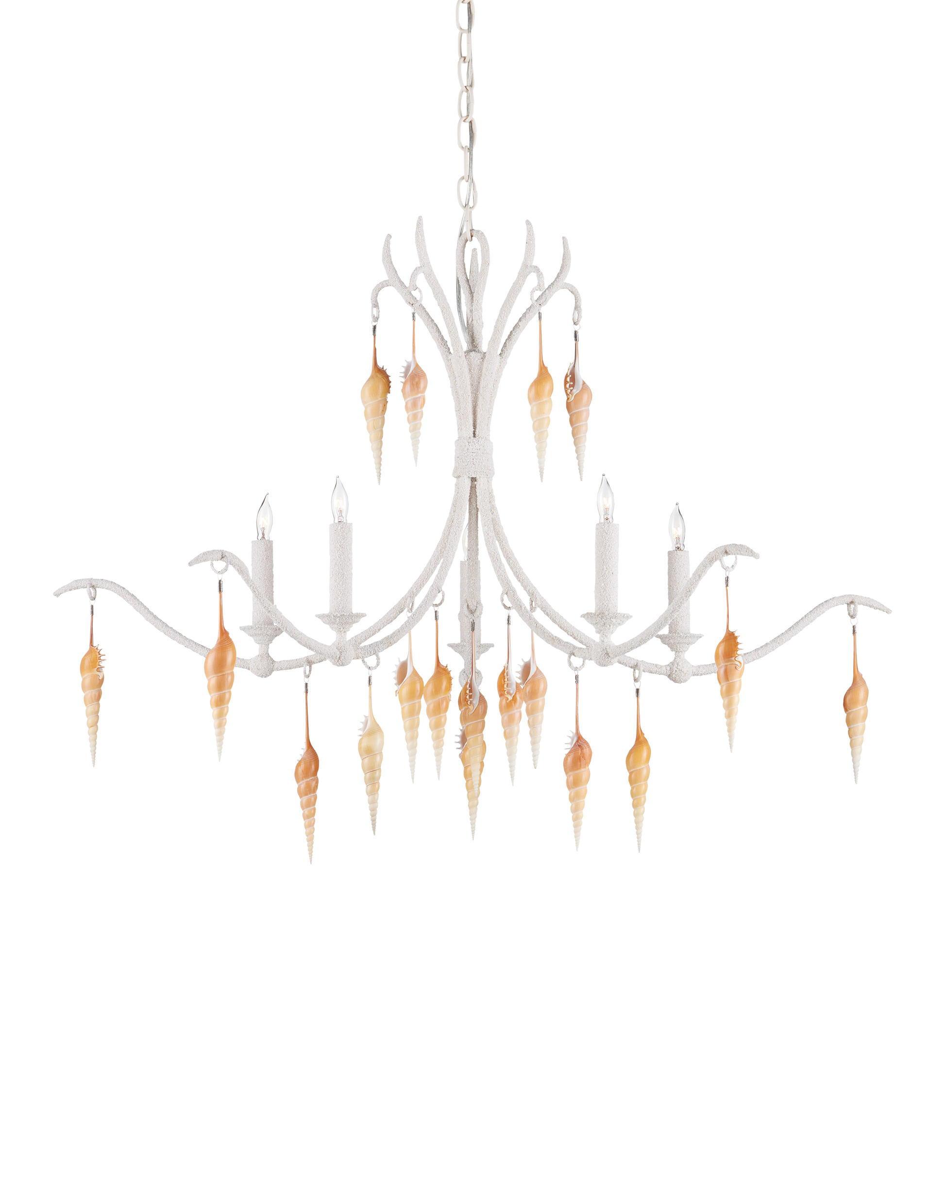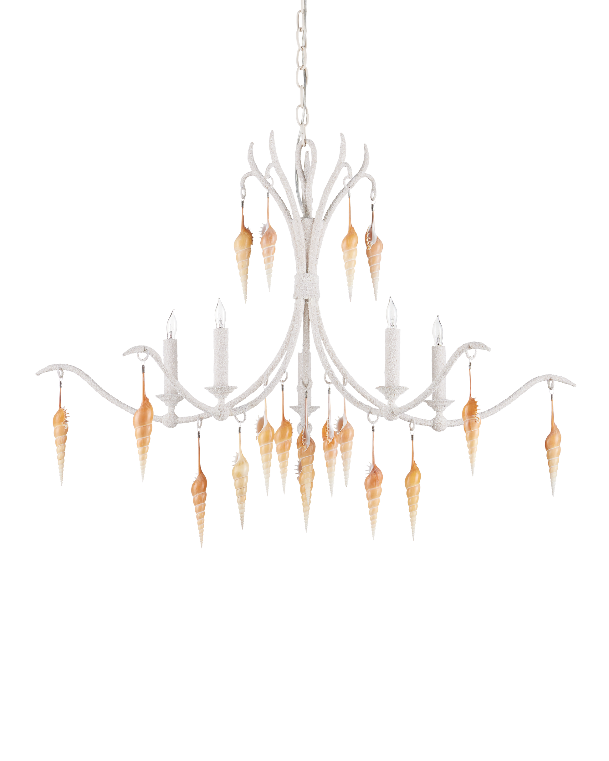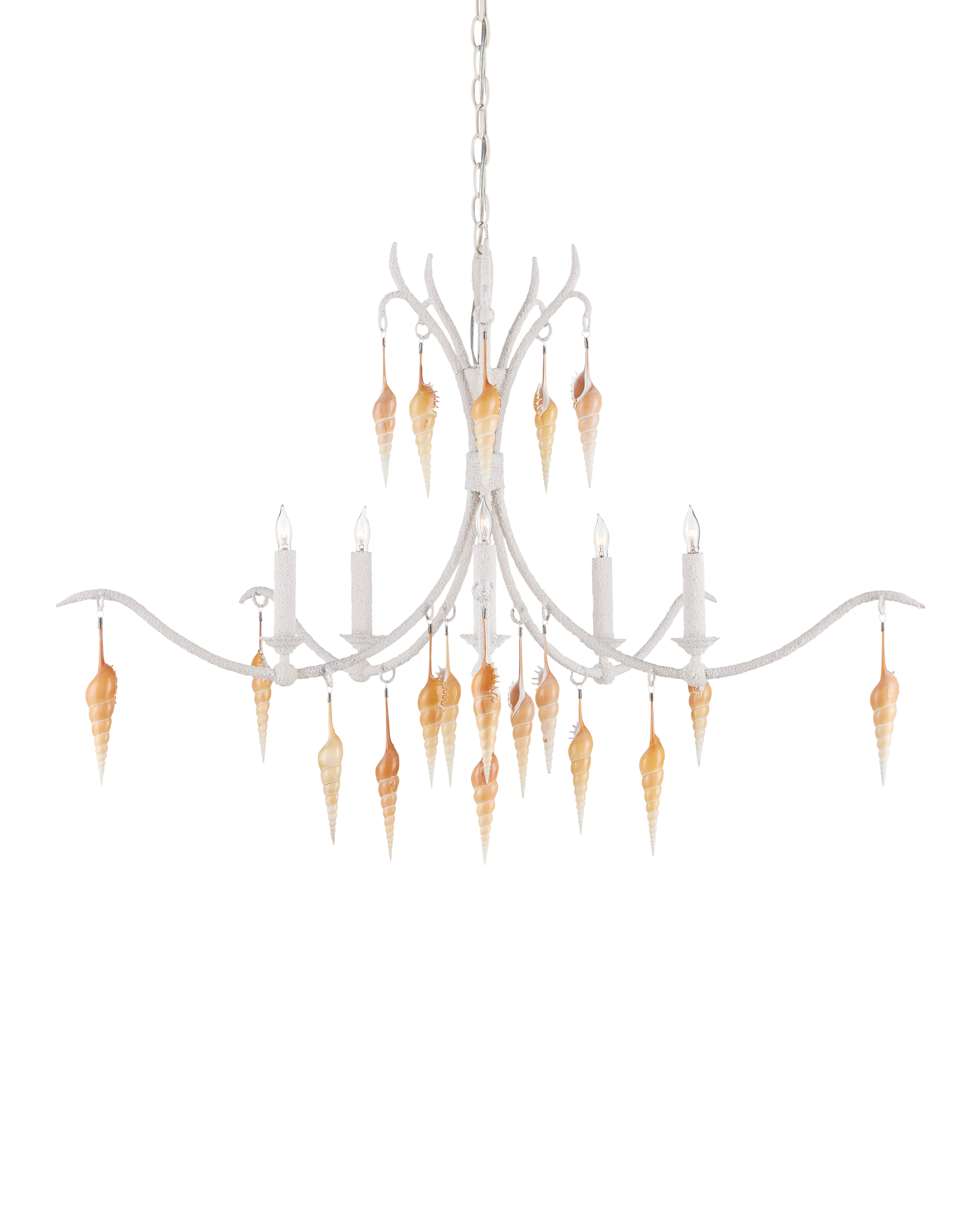 Tom Caldwell took one of the most popular chandelier shapes in our lineup and gave it a pale and pretty new life in the Arcachon Chandelier. The wrought iron frame has been covered in crushed shells to give it a heavy dose of tone-on-tone texture. Turbino shells dangle from the rings set in the arms that arch out and down or up and in to make the frame of the white chandelier a study in gracefulness. This is a design that fits swimmingly into our island-inspired offerings. Adjustable from 35" to 102.5" with use of included chain/rod kit/cable. If your space calls for a longer drop, additional chain/rods/cable is available for purchase.