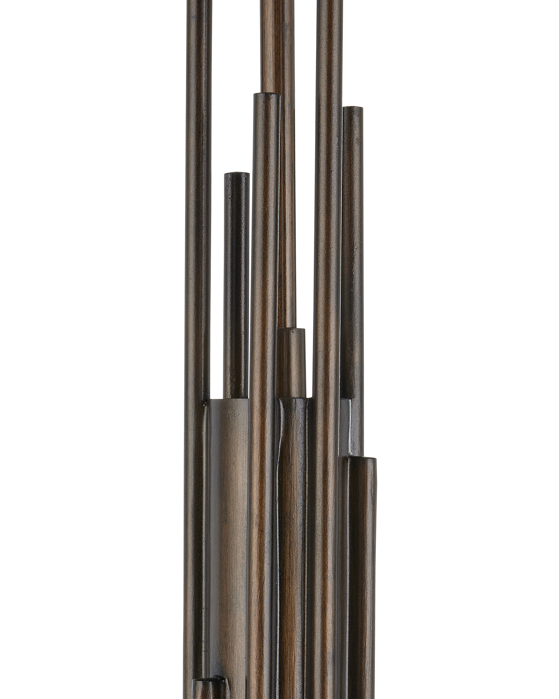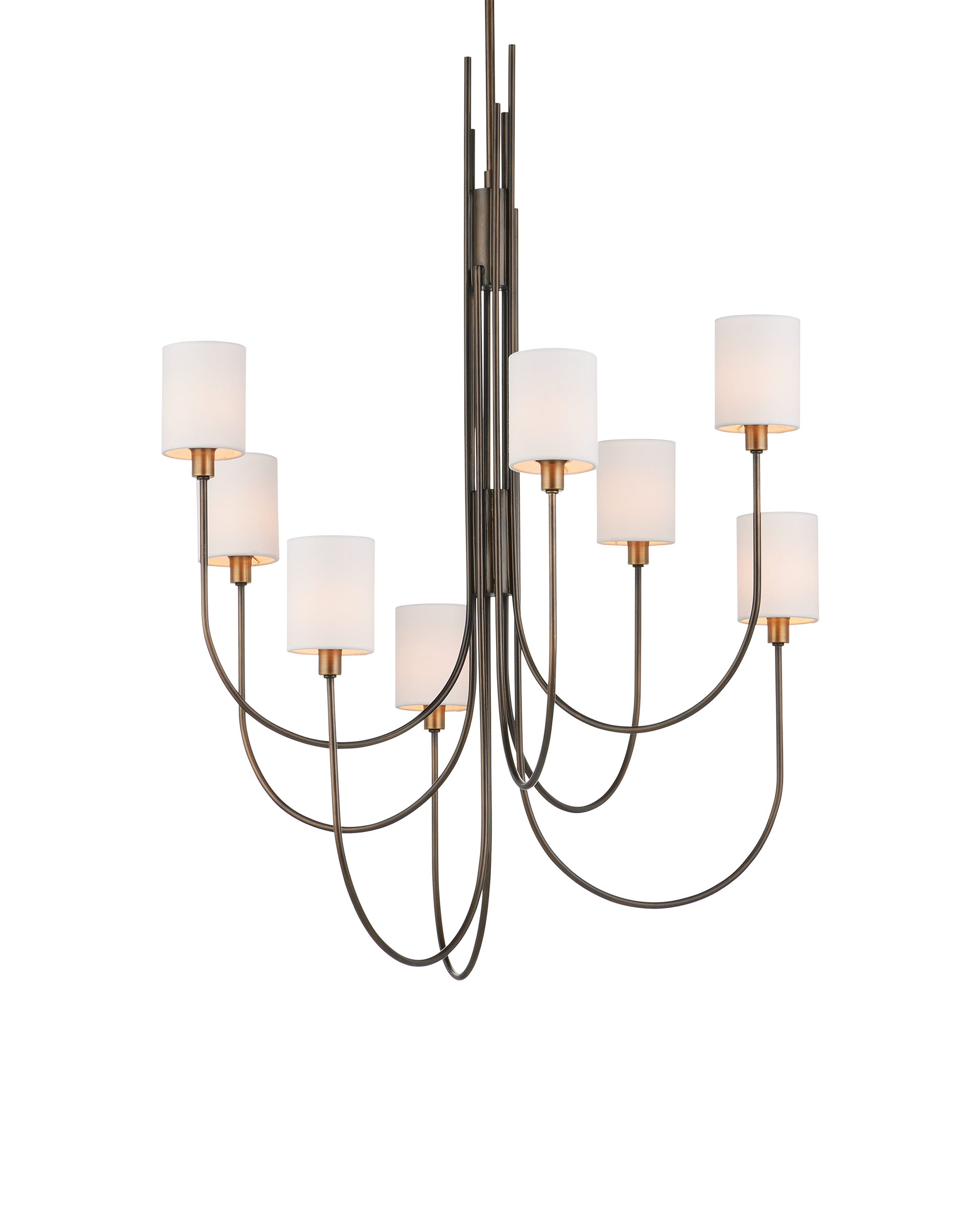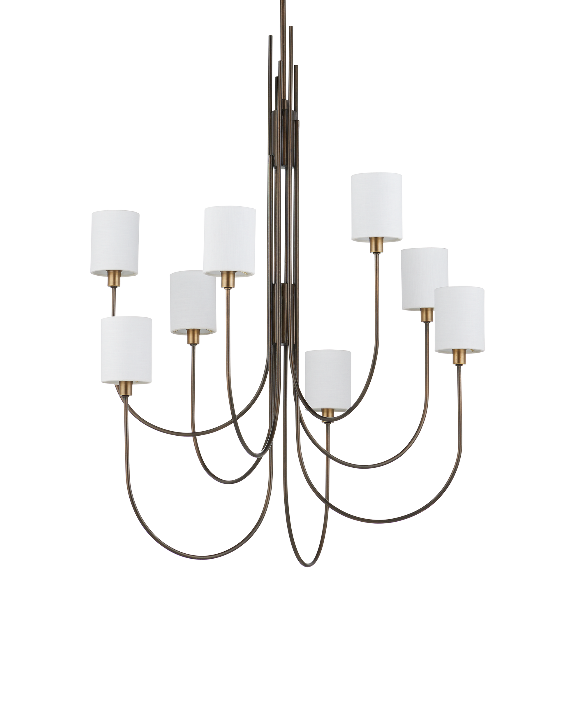 The Archetype Chandelier has a beautifully arcing form. The design details that make it special include the staggered curving lines of the thin pieces of metal at the bottom and the graduating placement of the straight ends as they attach to the stem. The Statuary Bronze finish is also a sophisticated design detail, as is the fact that the bobeches are finished in brass. The off-white linen shades sit directly on the bobeches and create a lovely glow. Adjustable from 52.25" to 94.25" with use of included chain/rod kit/cable. If your space calls for a longer drop, additional chain/rods/cable is available for purchase.