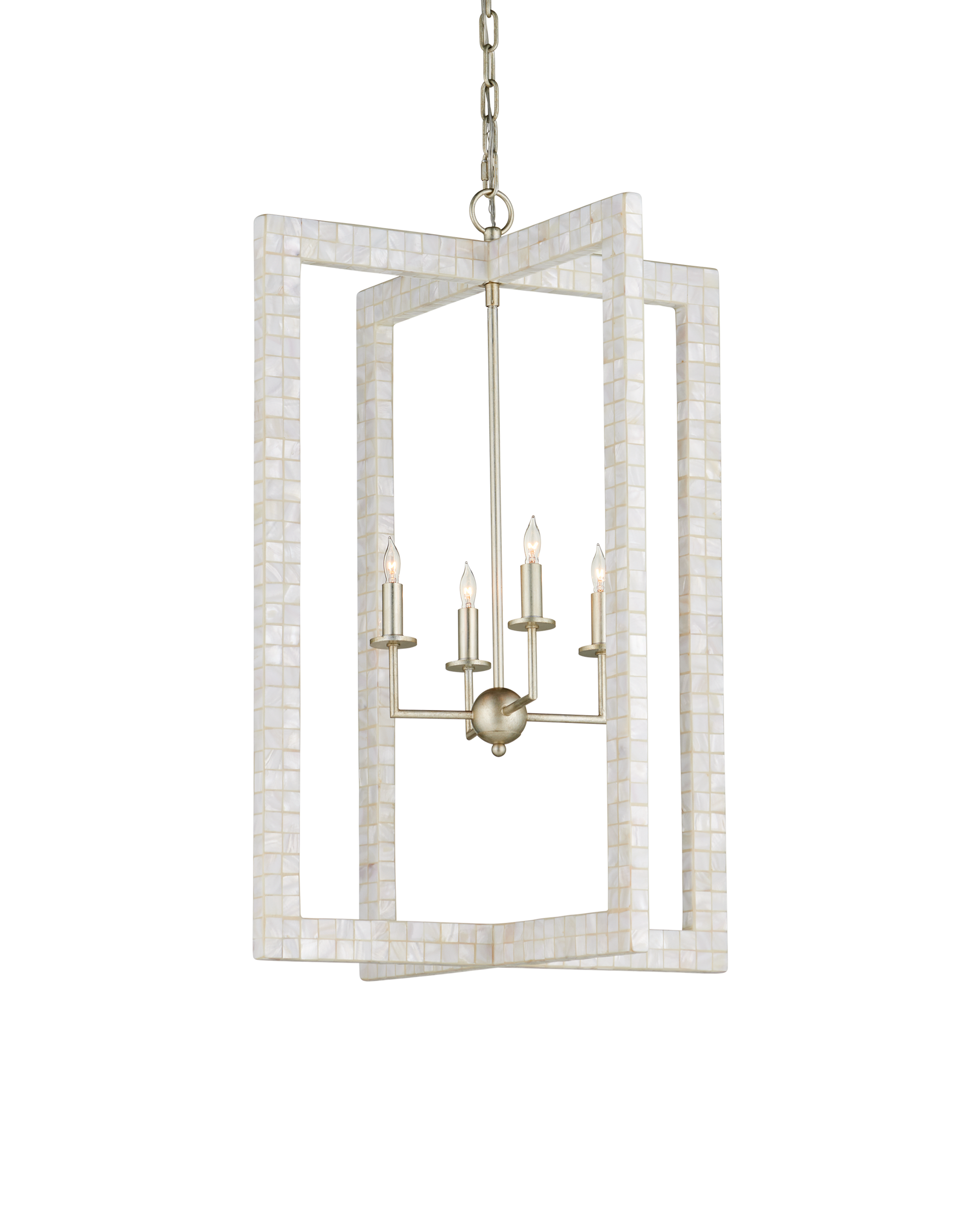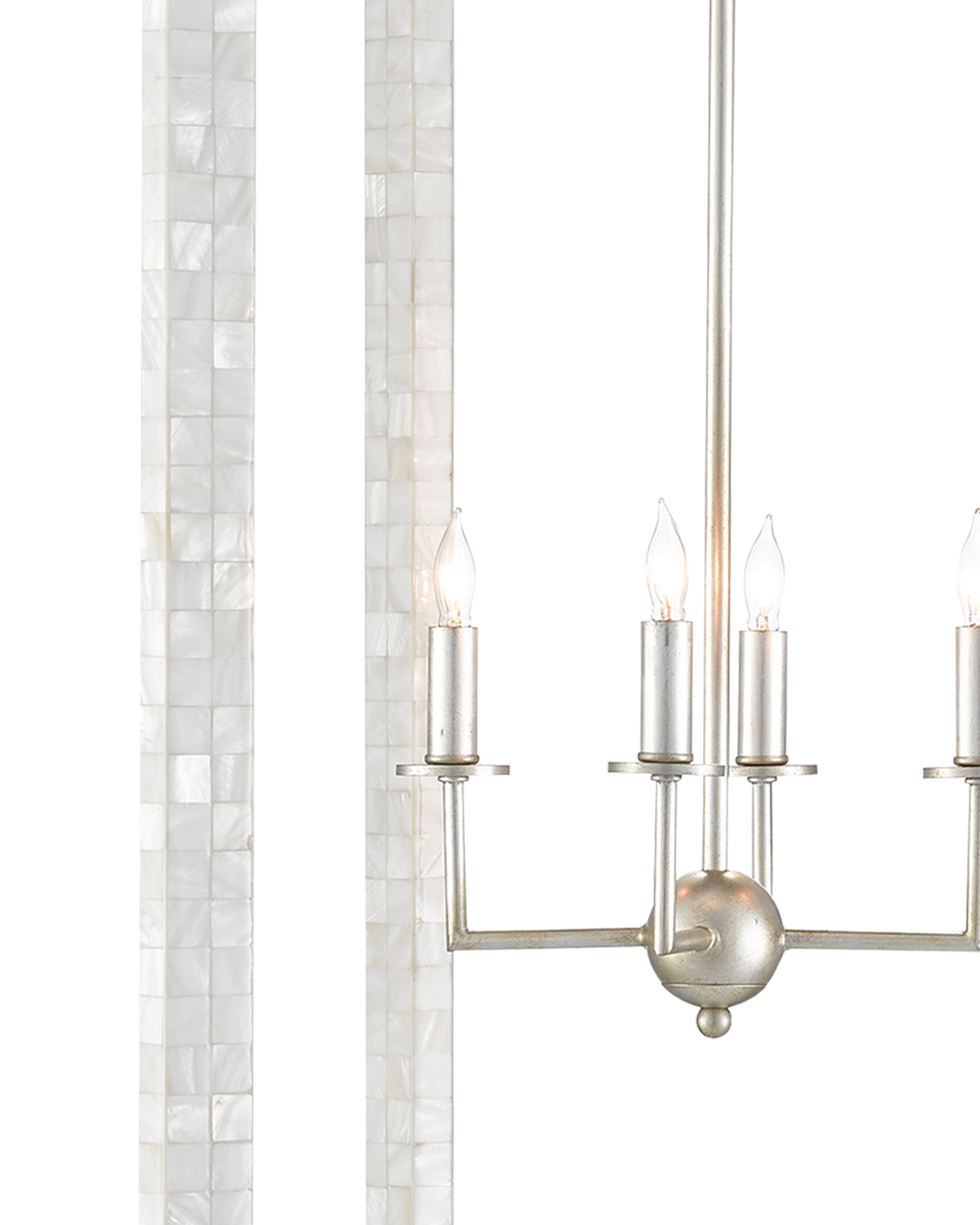 With thin rectangles covered in hand-applied mother-of-pearl mosaic, our Arietta Chandelier is an example of how talented our finish artisans are when it comes to handcrafted surfaces. The metal in a contemporary silver leaf finish enhances the glow of the fixture when the four lights of the silver chandelier illuminate. Adjustable from 38.75" to 106.75" with use of included chain/rod kit/cable. If your space calls for a longer drop, additional chain/rods/cable is available for purchase.