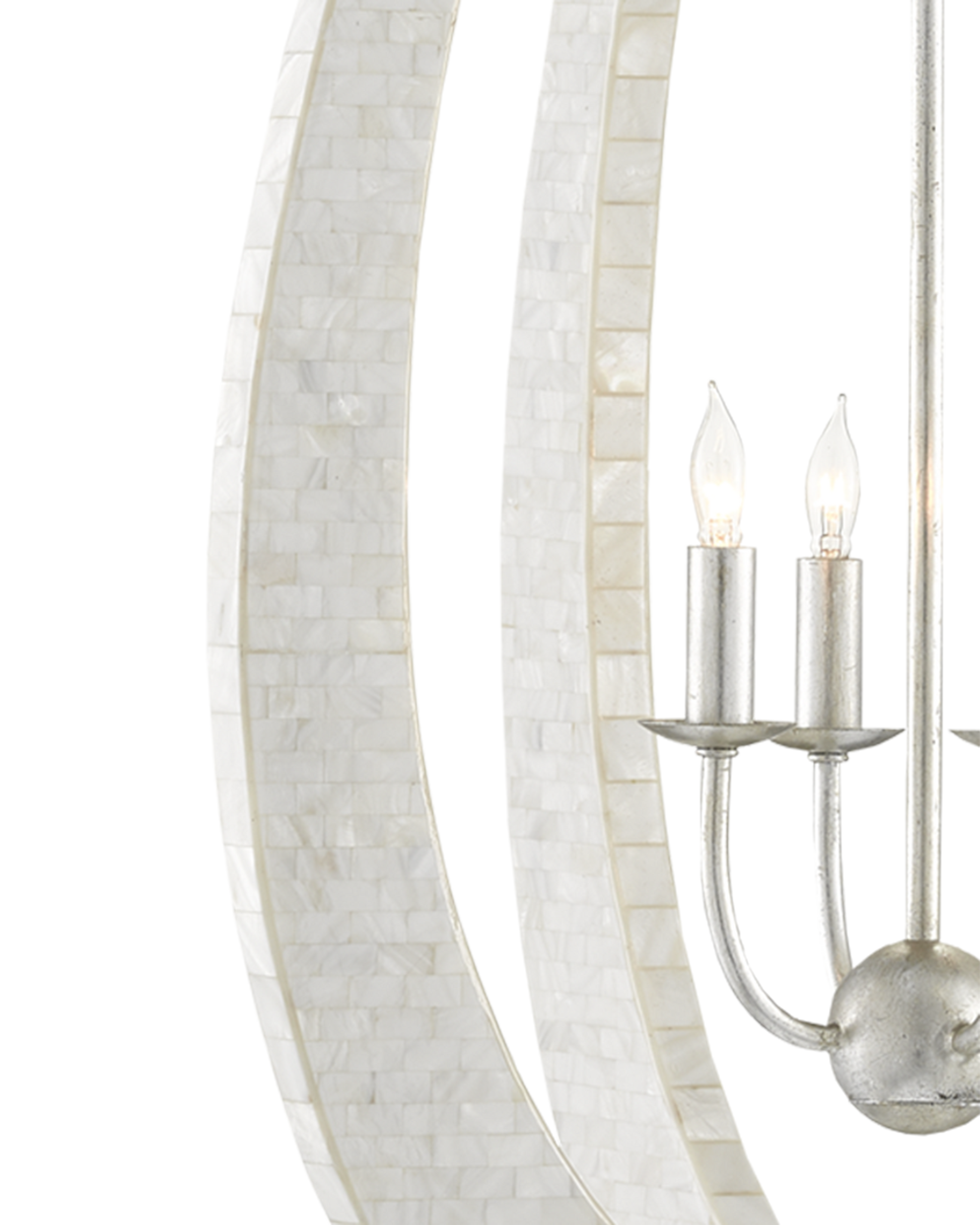 With thin arcing blades covered in hand-applied mother-of-pearl mosaic, our Arietta Teardrop Chandelier is an example of how talented our finish artisans are when it comes to handcrafted surfaces. The metal in a silver leaf finish enhances the glow of the fixture when the four lights of the silver chandelier illuminate. Clarence Mallari designed the Arietta family of fixtures, which also includes a rectangular version of this design. He was looking for a different perspective with the teardrop shape to make it softer in tone: without corners, he notes, the fixture is subtler and more delicate. Adjustable from 46.5" to 112.5" with use of included chain/rod kit/cable. If your space calls for a longer drop, additional chain/rods/cable is available for purchase.