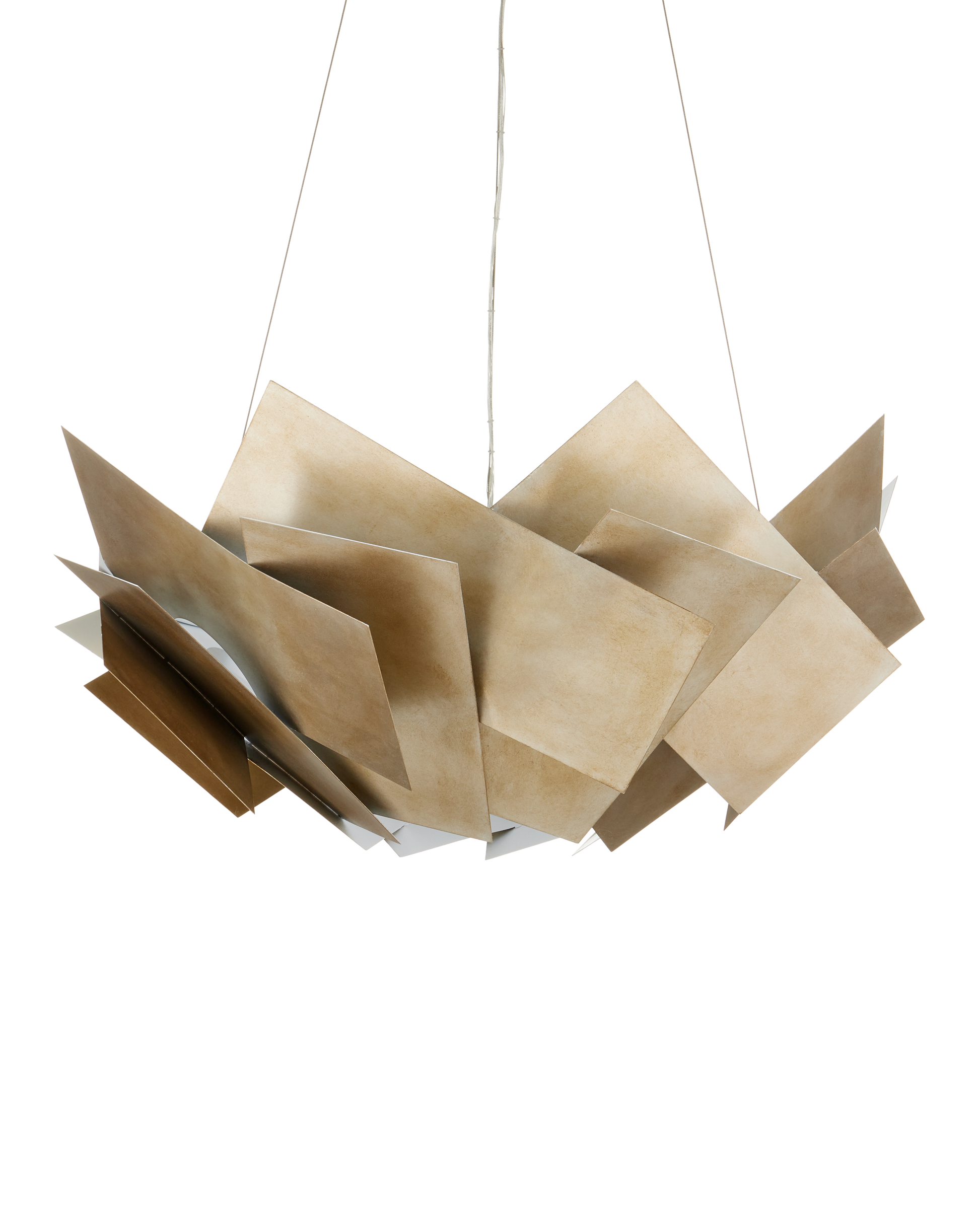 Our Artiste Chandelier is a powerful composition made of simple wrought iron-panels. It's how these sheets of metal, in a silver leaf finish, are arranged that bring it its edgy style. The bottom of the silver chandelier is fitted with an opaque acrylic diffuser that will soften the glow of the three-light fixture. Adjustable from 21" to 130" with use of included chain/rod kit/cable. If your space calls for a longer drop, additional chain/rods/cable is available for purchase.