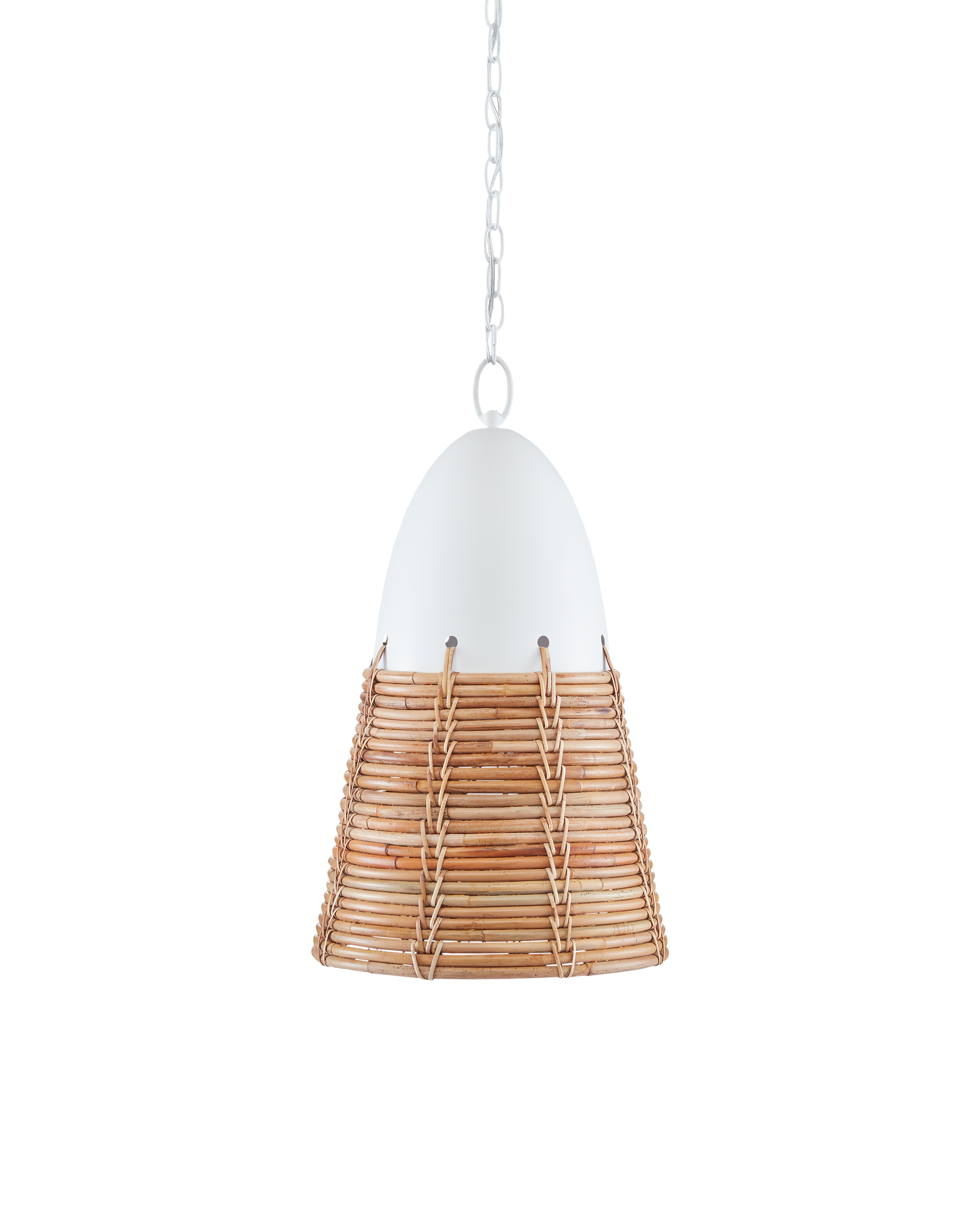 A classic mix of materials fashioned in a contemporary arrangement defines the Arundo Pendant, which is made of natural rattan and wrought iron painted in a gesso white finish. A design detail of note on this white pendant light is how the thinner strips of rattan that loop to hold the thicker strands in place disappear into the shade through drilled holes. Adjustable from 29.75" to 98.25" with use of included chain/rod kit/cable. If your space calls for a longer drop, additional chain/rods/cable is available for purchase.