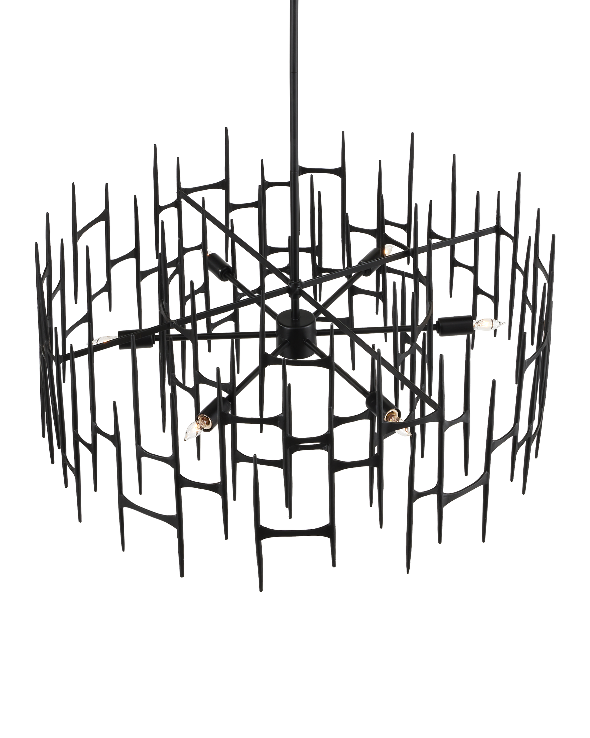 Drawing his inspiration from the brutalist design movement, Ian Thornton created the powerful spiky form of the Attingham Black Chandelier. This fixture, made of wrought iron in a satin black finish, teases the eye into to where it's hard to discern the beginning from the end. Impressive design attributes include the way each of the interlocking shapes tapers at the top and bottom, and the textural patterns these will cast when the chandelier is lit. Adjustable from 21" to 63" with use of included chain/rod kit/cable. If your space calls for a longer drop, additional chain/rods/cable is available for purchase.