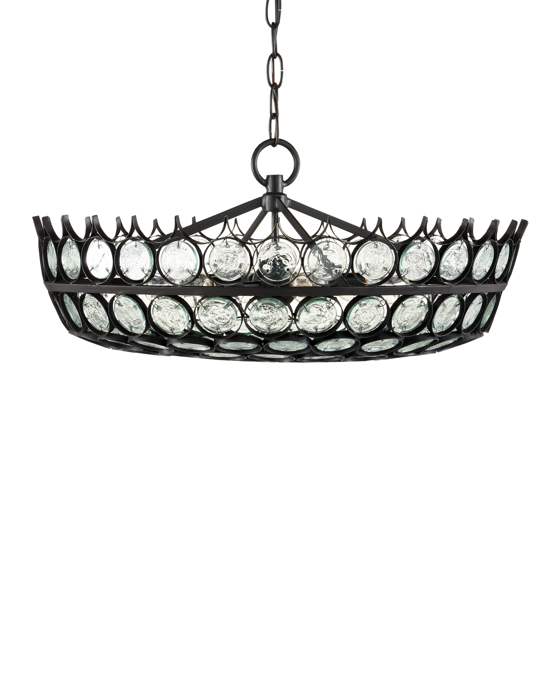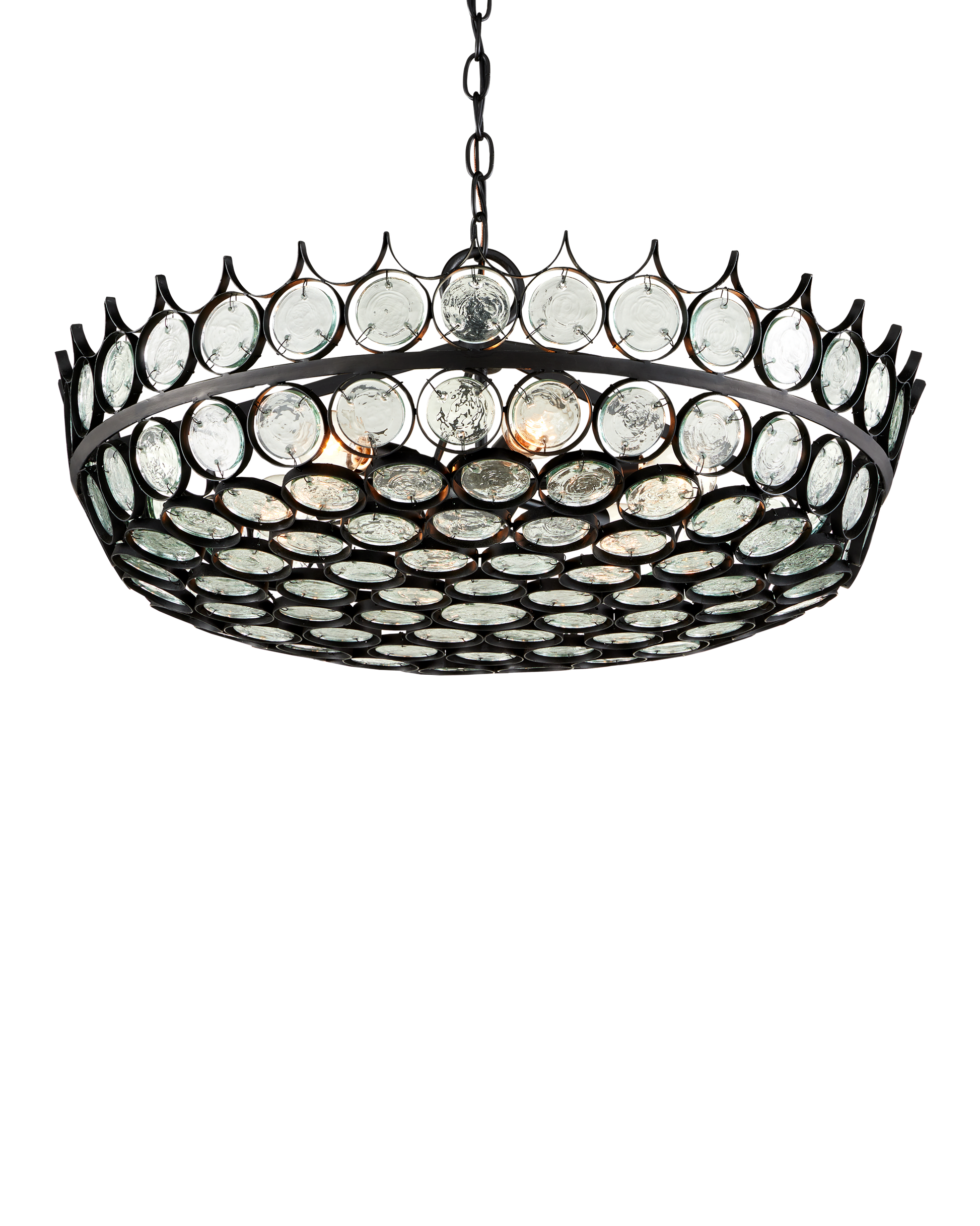 Recycled glass discs are encased in wrought iron in a satin black finish to bring the Augustus Small Chandelier great aesthetic strength. Design details of note are how unobtrusively the discs are fastened to the frame and the fact that the discs grow smaller as they descend to the bottom of the shade. This classic black chandelier is in the Bunny Williams Collection. Adjustable from 18.5" to 86" with use of included chain/rod kit/cable. If your space calls for a longer drop, additional chain/rods/cable is available for purchase.