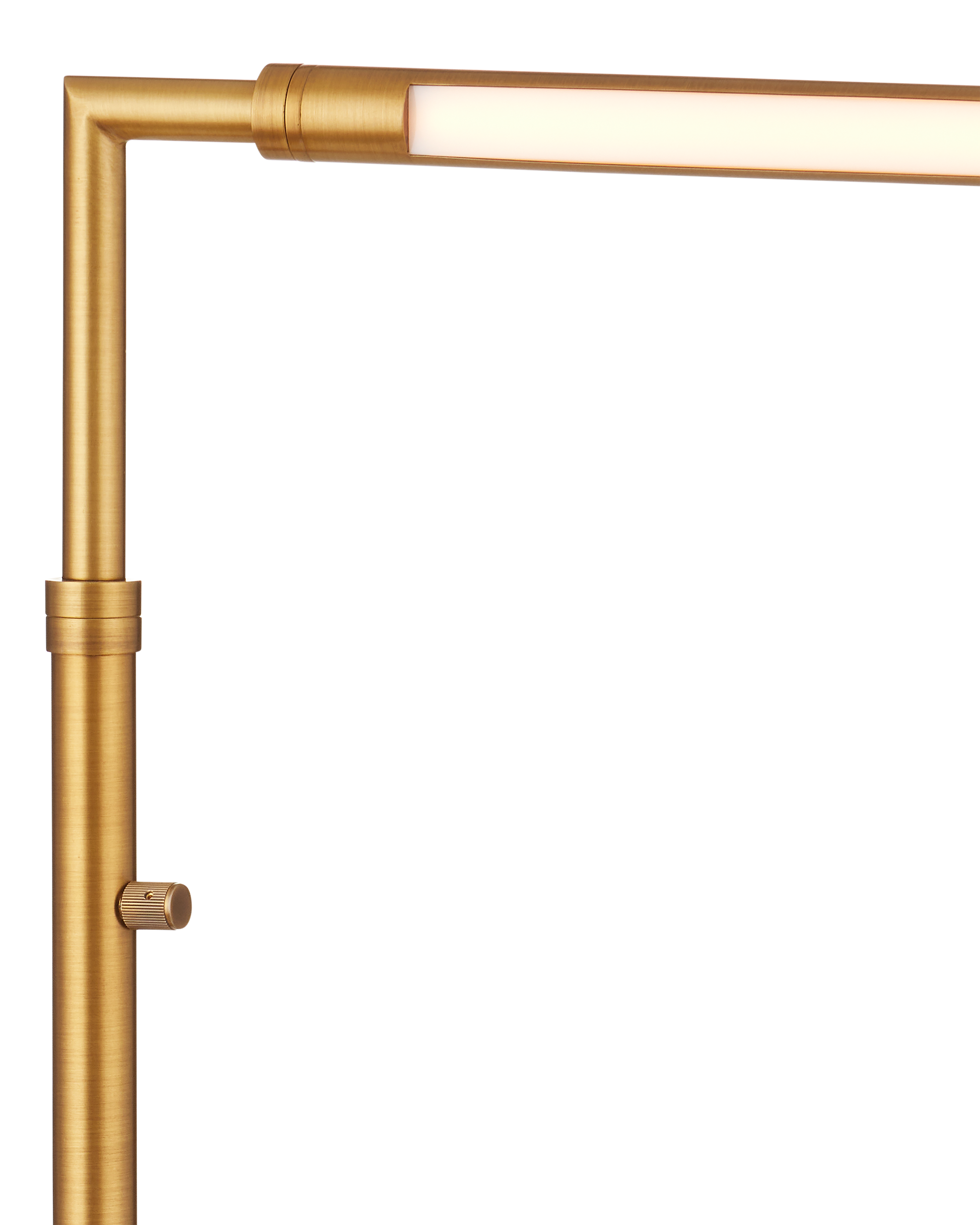 The Autrand Brass Floor Lamp is a nimble fixture that focuses illumination wherever it is needed most, as it swivels from side to side and the tubular shade on the top arm can be maneuvered to cast light up, down, or right to left. Made of metal in an antique brass finish, the simple lines of this gold floor lamp make it great for any number of interior styles, including contemporary. The fixture has a dimmer switch and is lit with integrated LED technology.