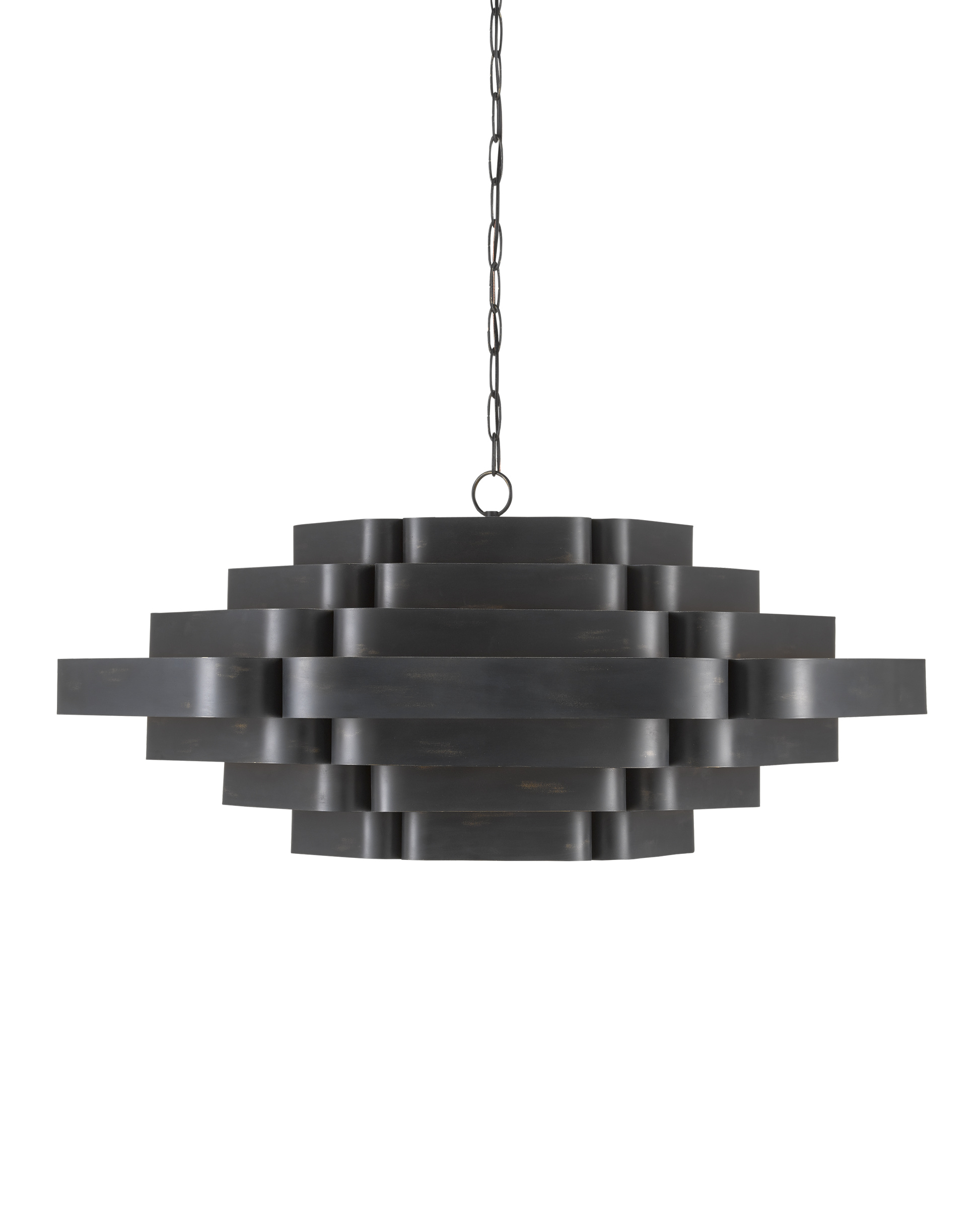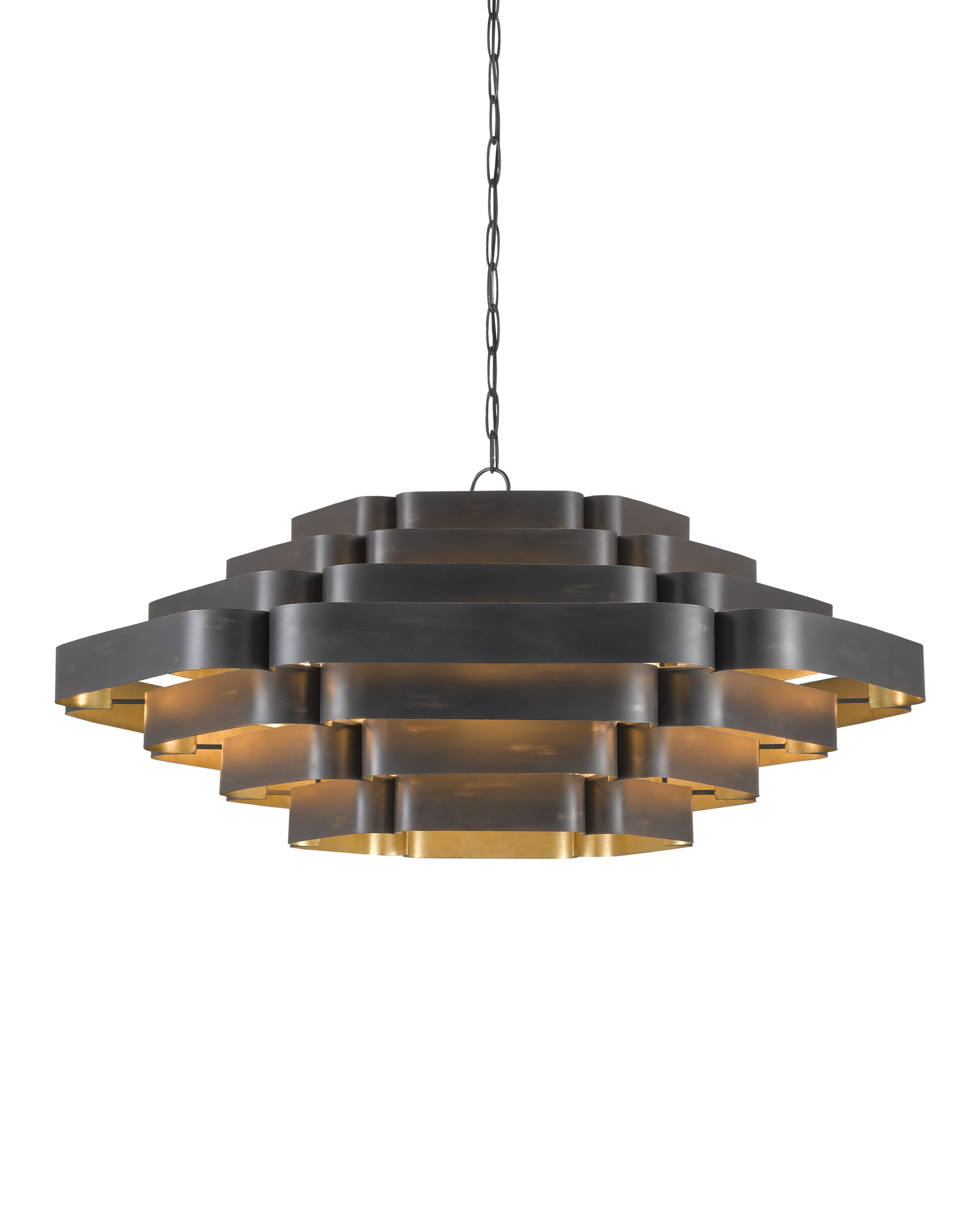 In the Bunny Williams collection, the Bailey Chandelier is a large chandelier with a two-tone finish: contemporary gold leaf on the interior and French black on the exterior. Ambient light radiates between the ribbons of wrought iron in a warm glow due to the gold interior. The black chandelier has six lights so that glow is abundant. Adjustable from 28" to 96" with use of included chain/rod kit/cable. If your space calls for a longer drop, additional chain/rods/cable is available for purchase.