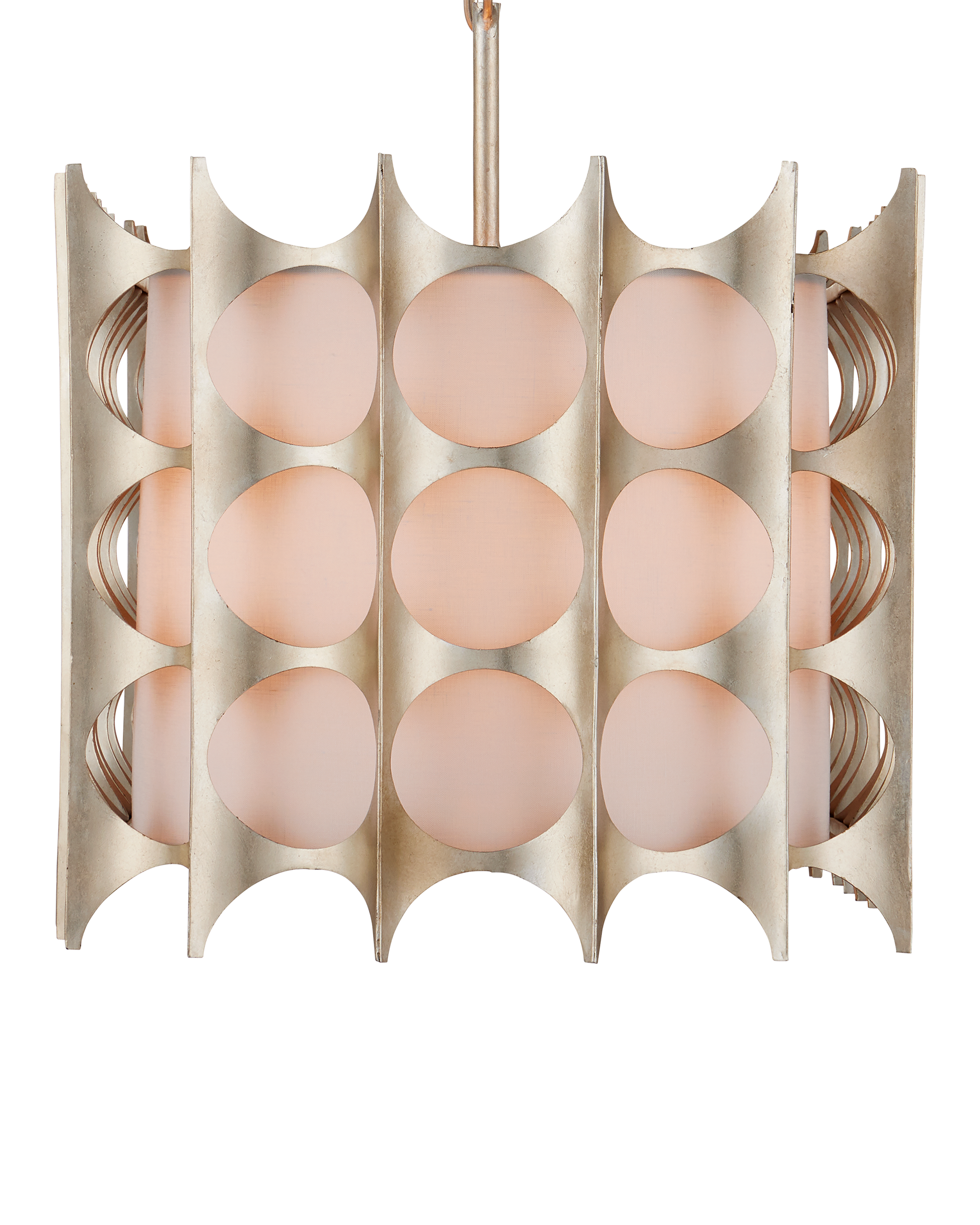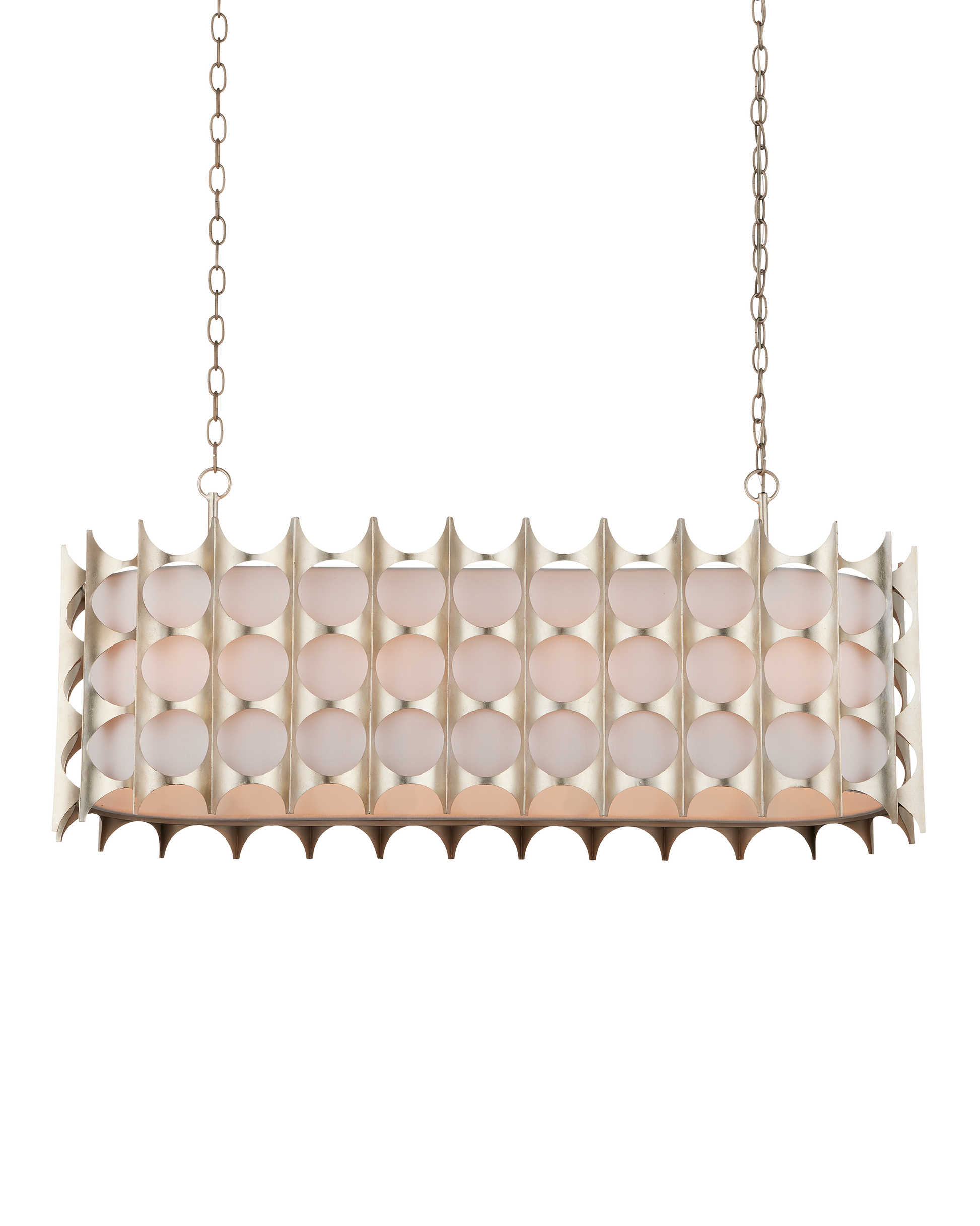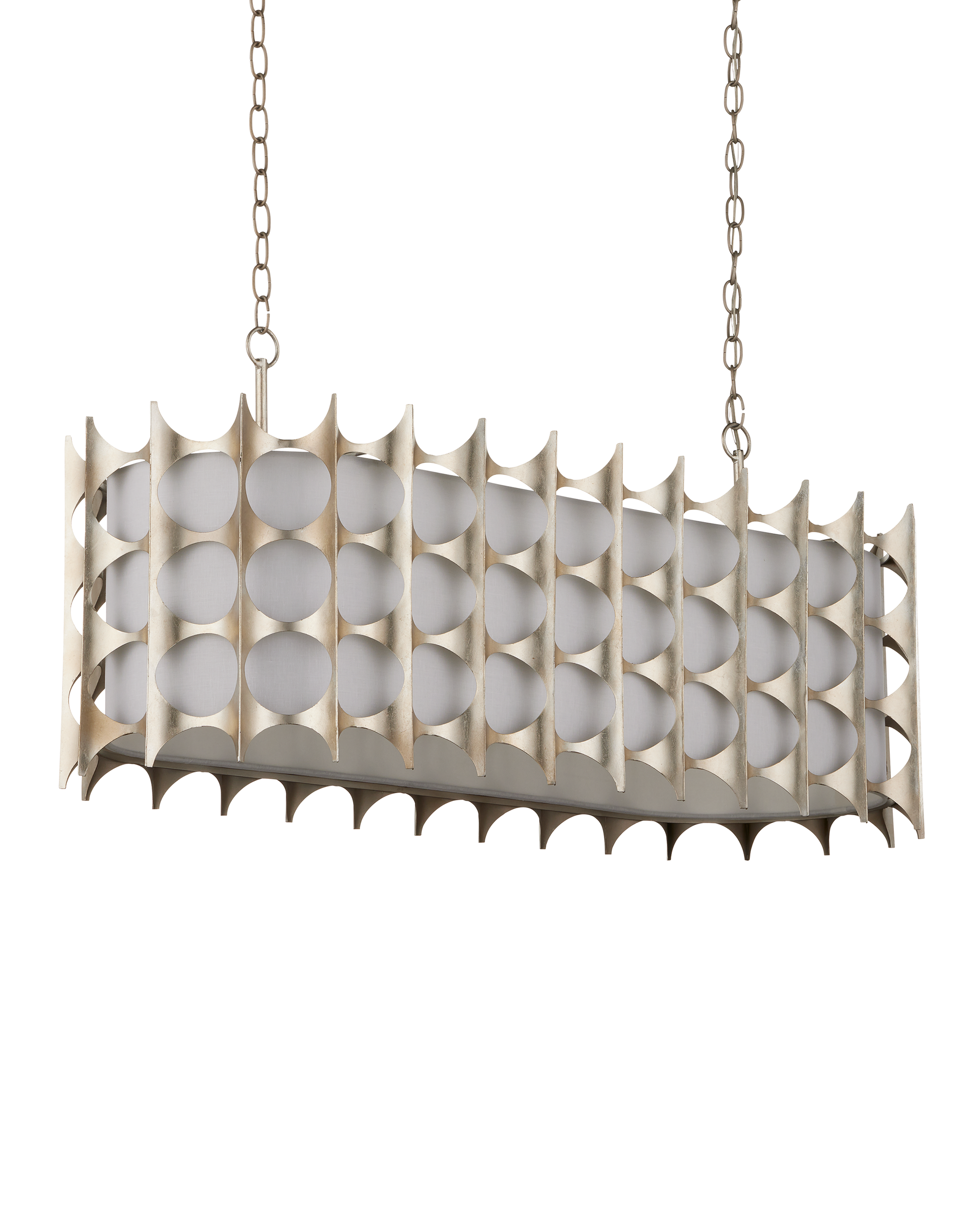 The Bardi Oval Chandelier is an engineered marvel. The laser-cut sheets of metal are bent and welded in place, then finished in a contemporary silver leaf that gleams. The dramatic construct is then fitted over a white linen shade that makes the illumination from the silver chandelier glow. Adjustable from 24" to 93.5" with use of included chain/rod kit/cable. If your space calls for a longer drop, additional chain/rods/cable is available for purchase.