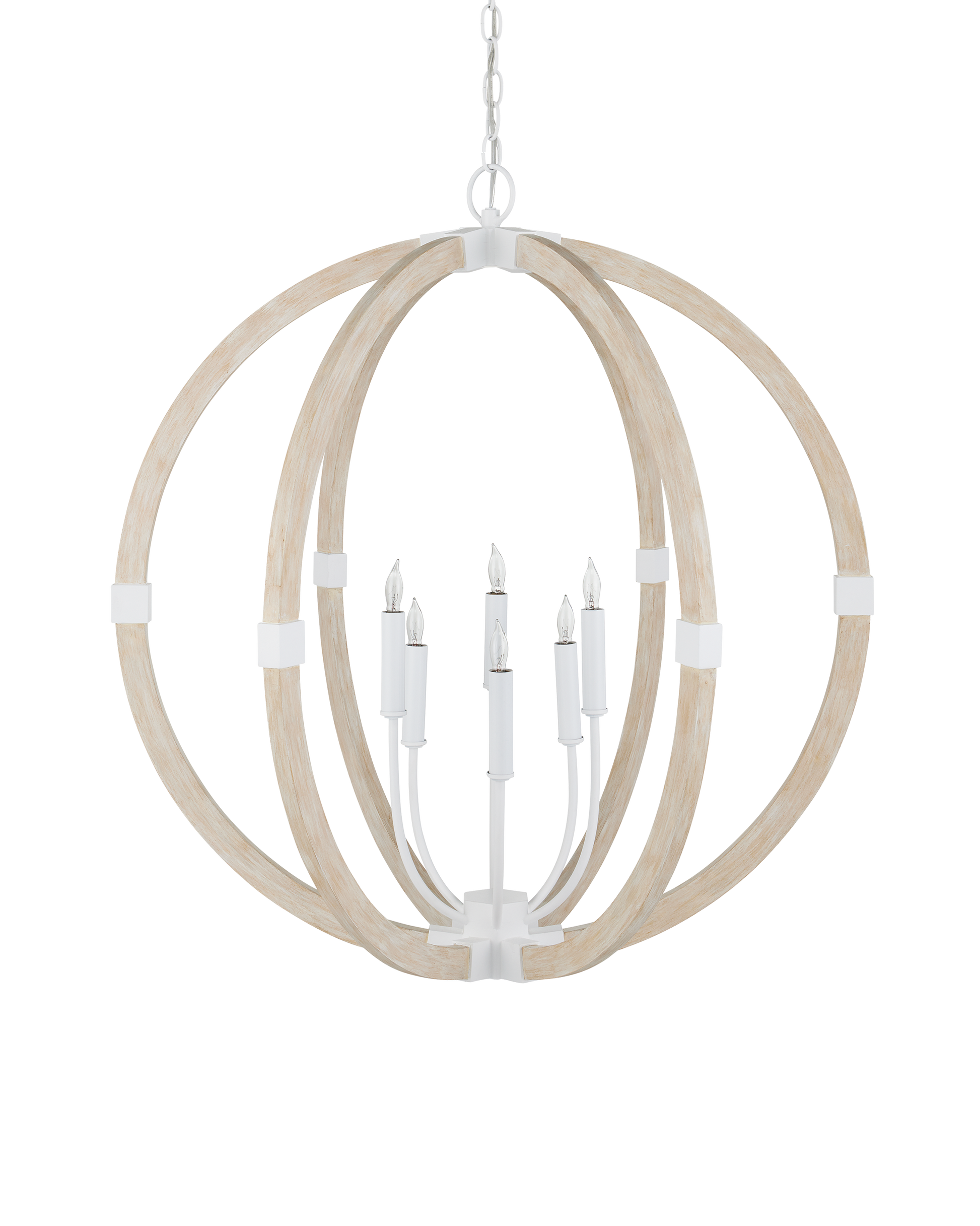 The Arts & Crafts movement inspired the design of the Bastian Sandstone Orb Chandelier, which is made of wrought iron and wood in sugar white and sandstone finishes. The crisp feel of the white metal clasping the spokes of washed wood brings extra sophistication to this fixture. The pale finishes on this bleached-wood chandelier bring the classic shape a sense of modernity. Adjustable from 37.5" to 106" with use of included chain/rod kit/cable. If your space calls for a longer drop, additional chain/rods/cable is available for purchase.