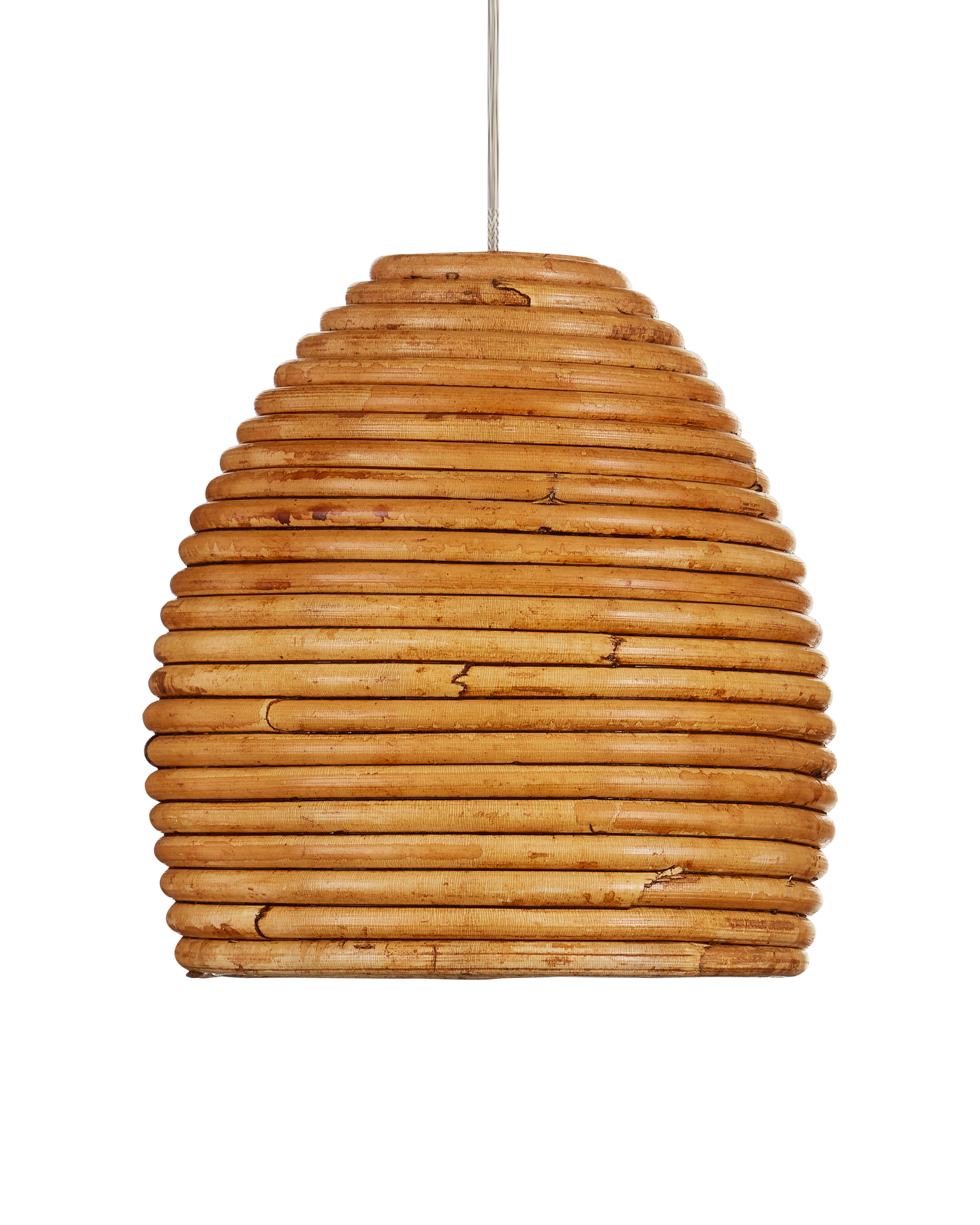 The Beehive Rectangular 7-Light Multi-Drop Pendant has rattan bell-shaped shades. Because the natural material is not perfectly uniform, there are fissures in the shades that allow illumination to escape to create a warm glow. The canopy of this piece is luminous in a painted silver finish. This fixture is among Currey & Company's multi-drop pendant collection, which includes multiple configurations.