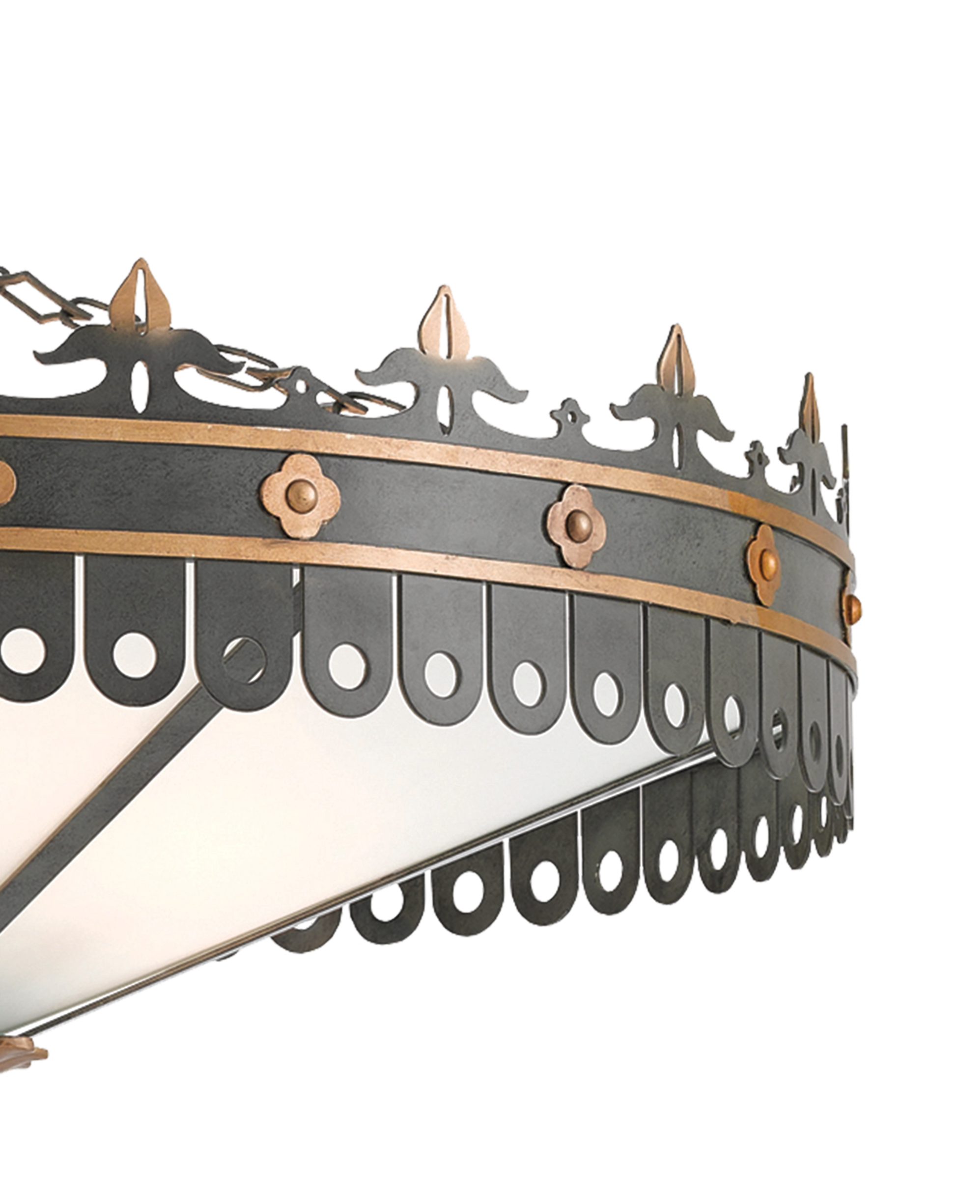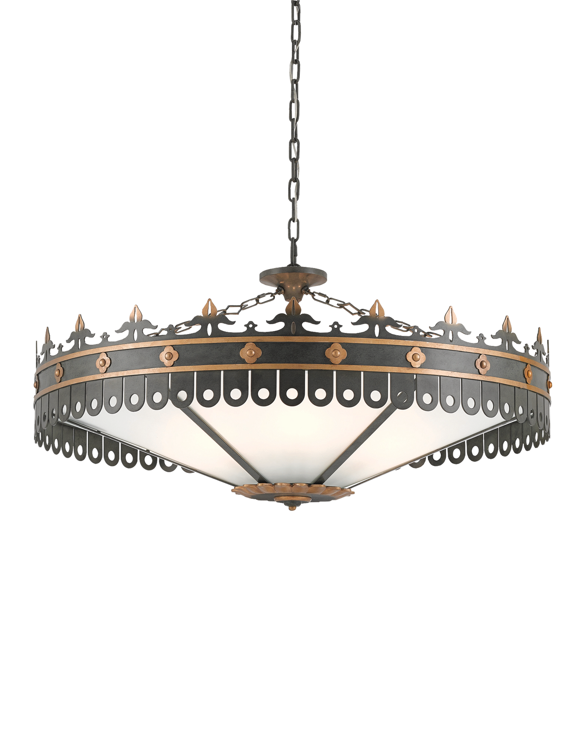 When she designed the Berkeley Chandelier, Bunny Williams was inspired by a Swedish bed corona that hangs in her home. In a dexterous mix of antique gold and moss gray finishes, the gray and gold chandelier has classical details accentuated by the contrast in hues.