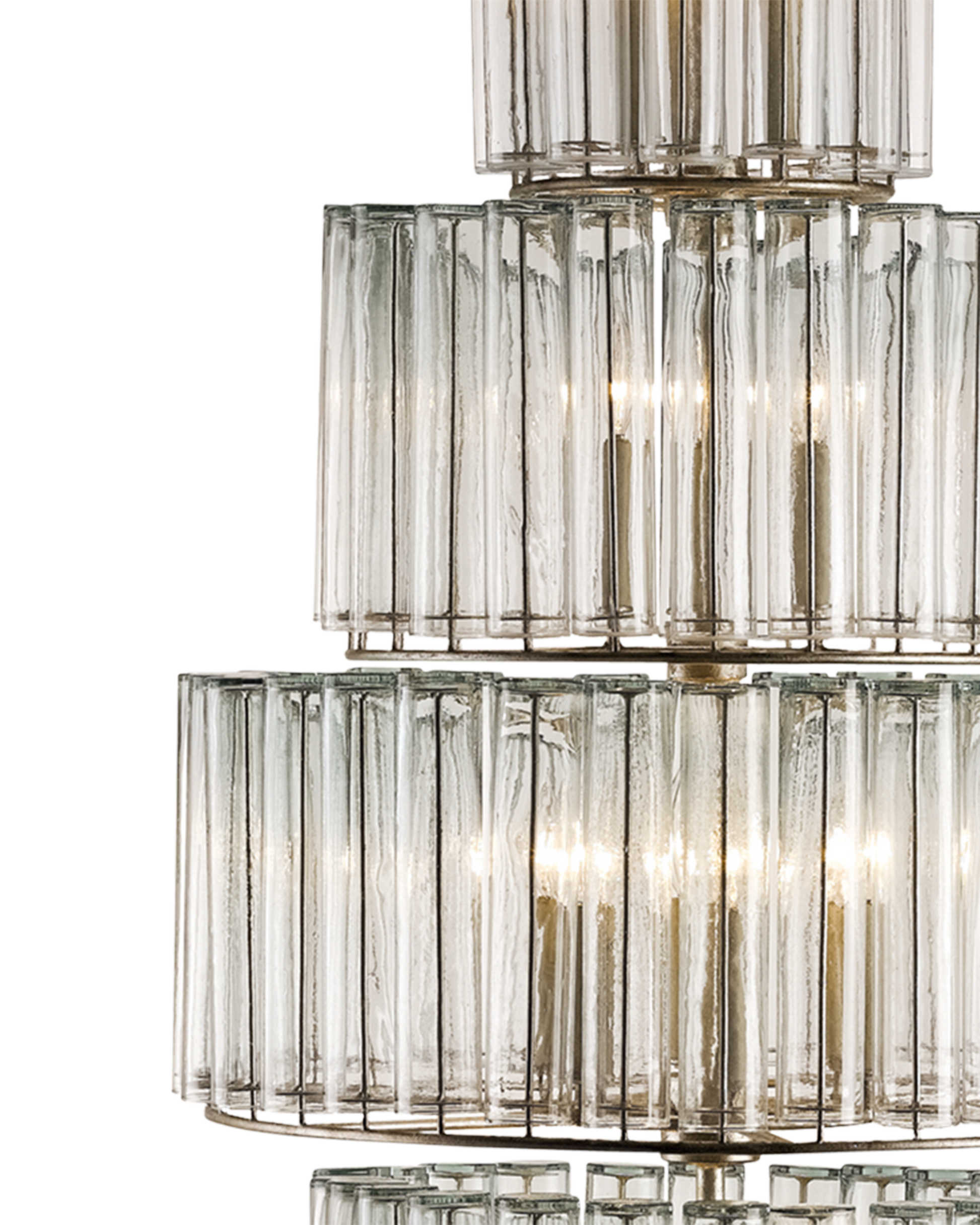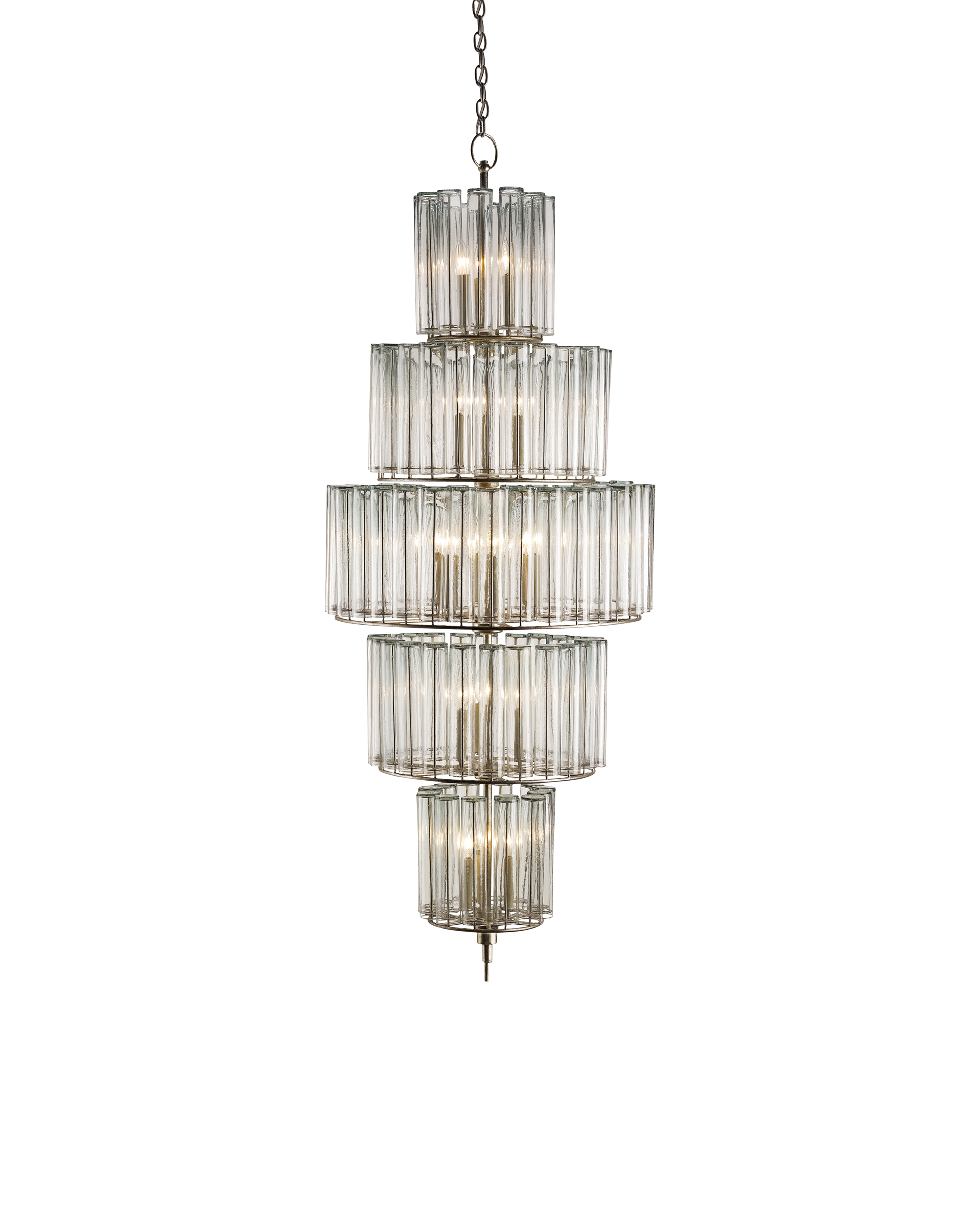 The Bevilacqua Large Chandelier has reflective glass flutes made from recycled bud vases for a shade. Its wrought iron frame is finished in an exquisite silver leaf that compliments the hues in the recycled glass. This silver chandelier is one in a variety of fixtures in the Bevilacqua collection.