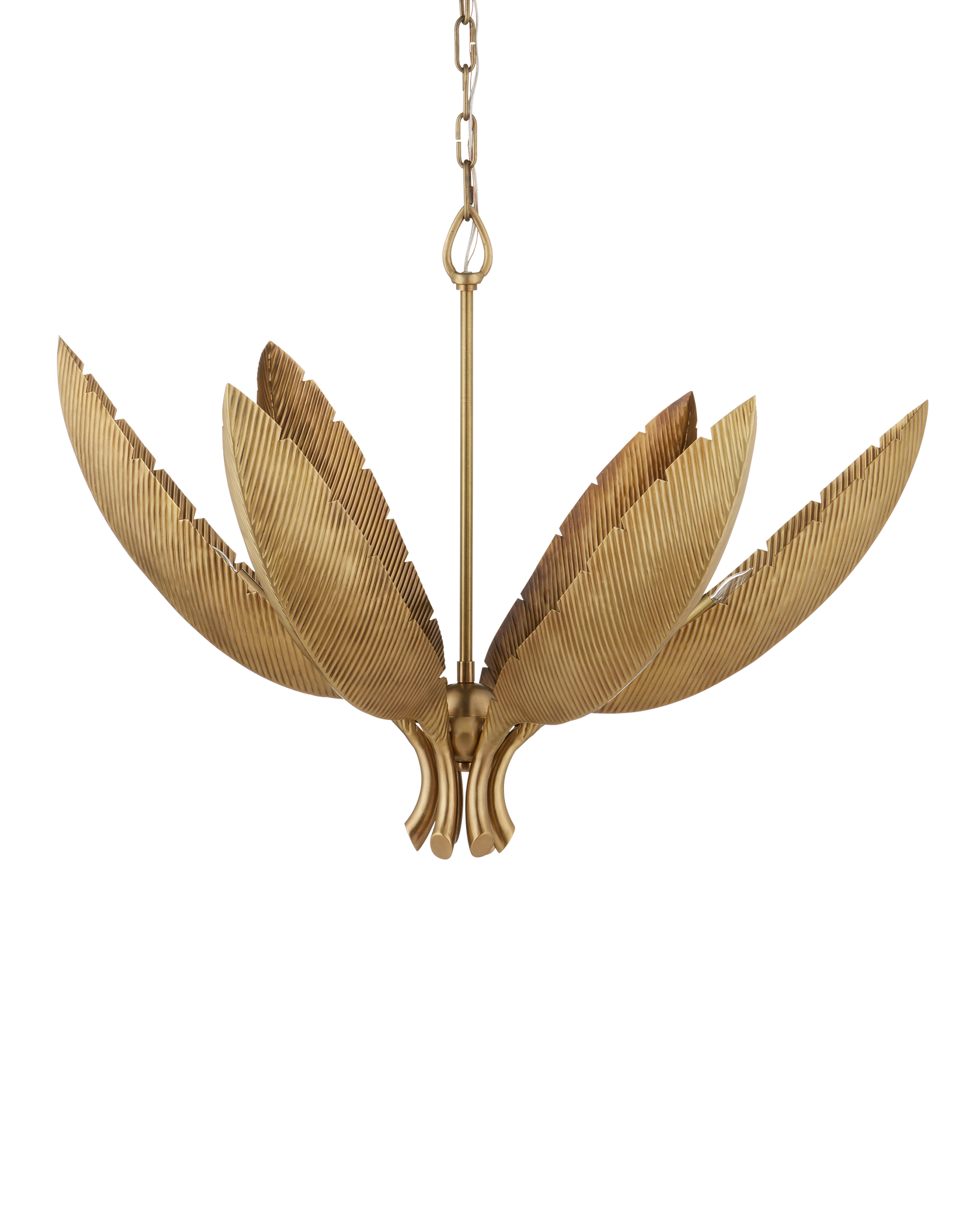 Clarence Mallari designed the Bird of Paradise Chandelier, which he notes is another of his nature-inspired fixtures. The design is based on the abaca leaf, which is cast in aluminum in an antique brass finish. The gold chandelier has six candelabra sockets and it is suspended with a chain that connects to a thin central stem through a tear-drop-shaped element. The way the leaves and stems curve around the fixture where they are mounted makes this one of our most graceful contemporary chandeliers. Adjustable from 31" to 99" with use of included chain/rod kit/cable. If your space calls for a longer drop, additional chain/rods/cable is available for purchase.