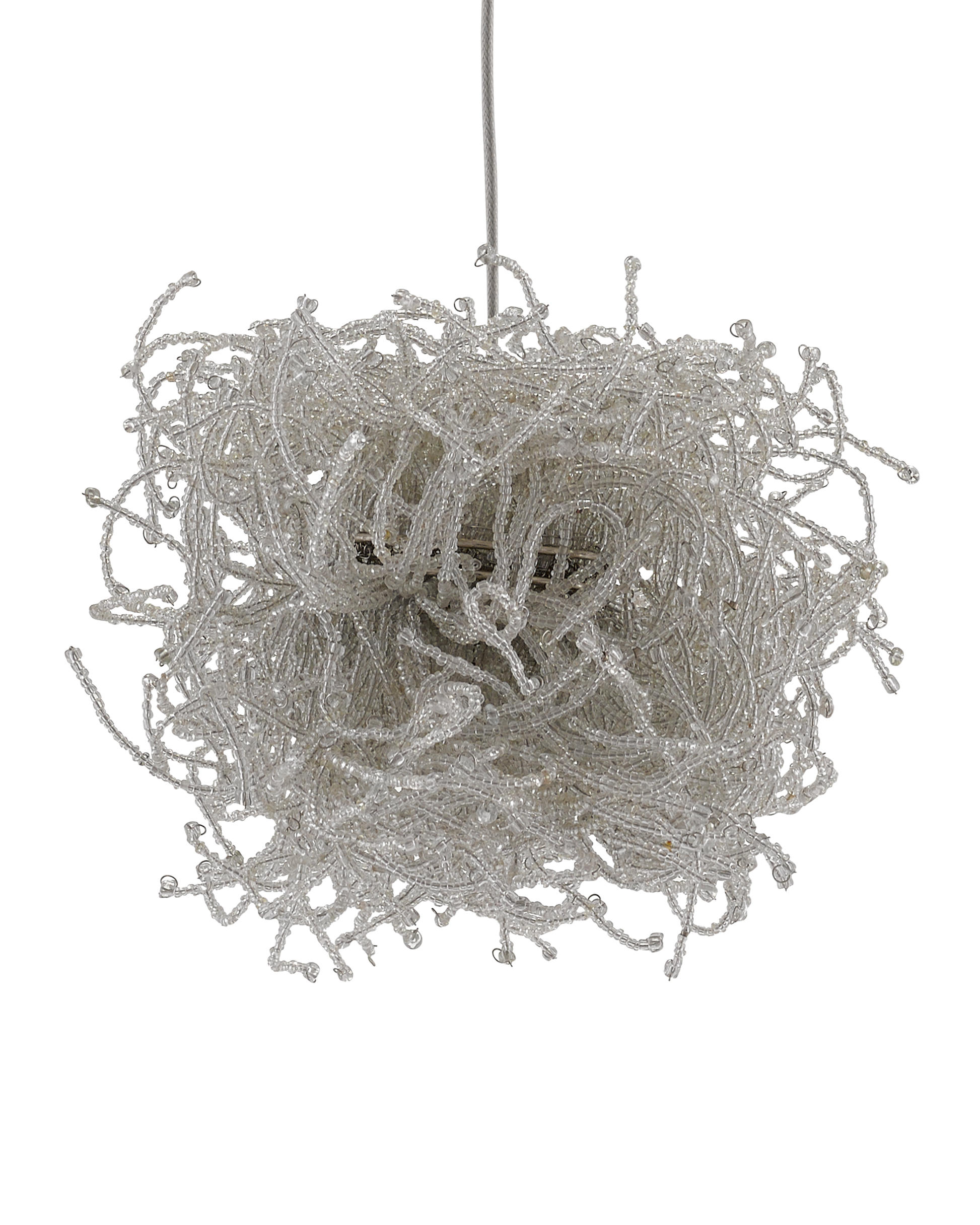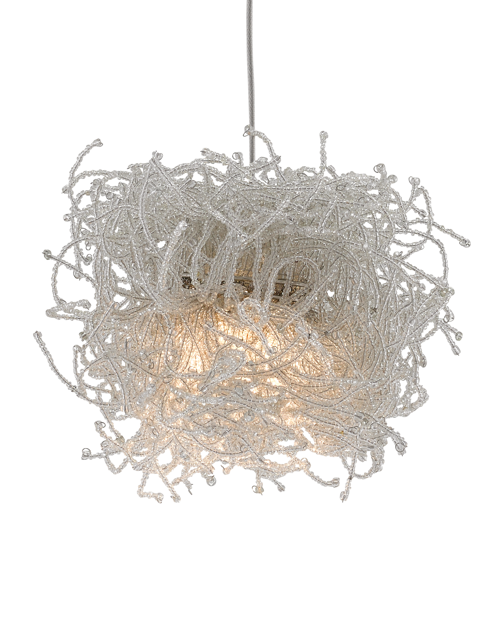 The Birds Nest 30-Light Multi-Drop Pendant is an effervescent beaded pendant that looks like luminous nests. Rather than twigs, the shades are made up of whorls of clear beads strung along pieces of wire. It takes many hours for our artisans to create these shades that look so whimsical. The canopy of this piece is luminous in a painted silver finish. This fixture is among Currey & Company's multi-drop pendant collection, which includes multiple configurations.