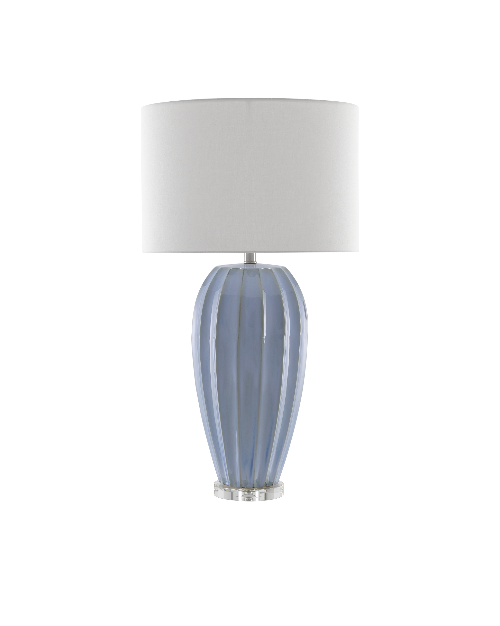 Made of porcelain, the Bluestar Table Lamp has a beautiful ridged surface with distressing at its thickest points. The cornflower blue lamp sits atop a clear optic crystal base and is topped with a white shantung shade.