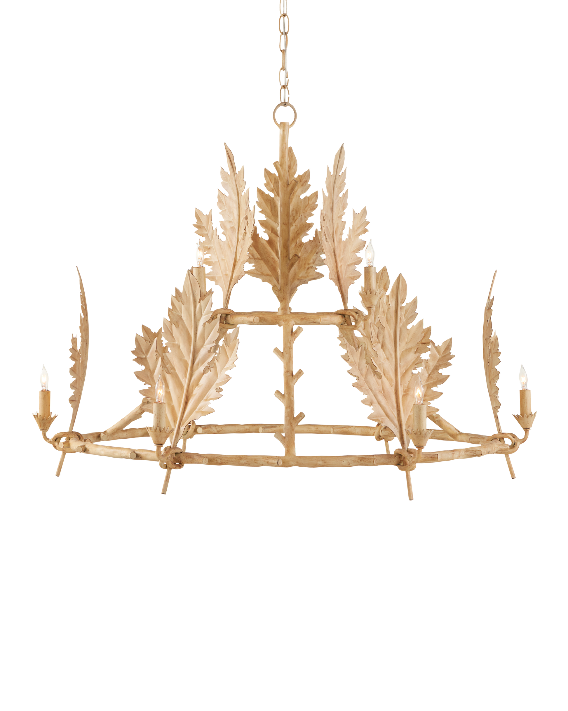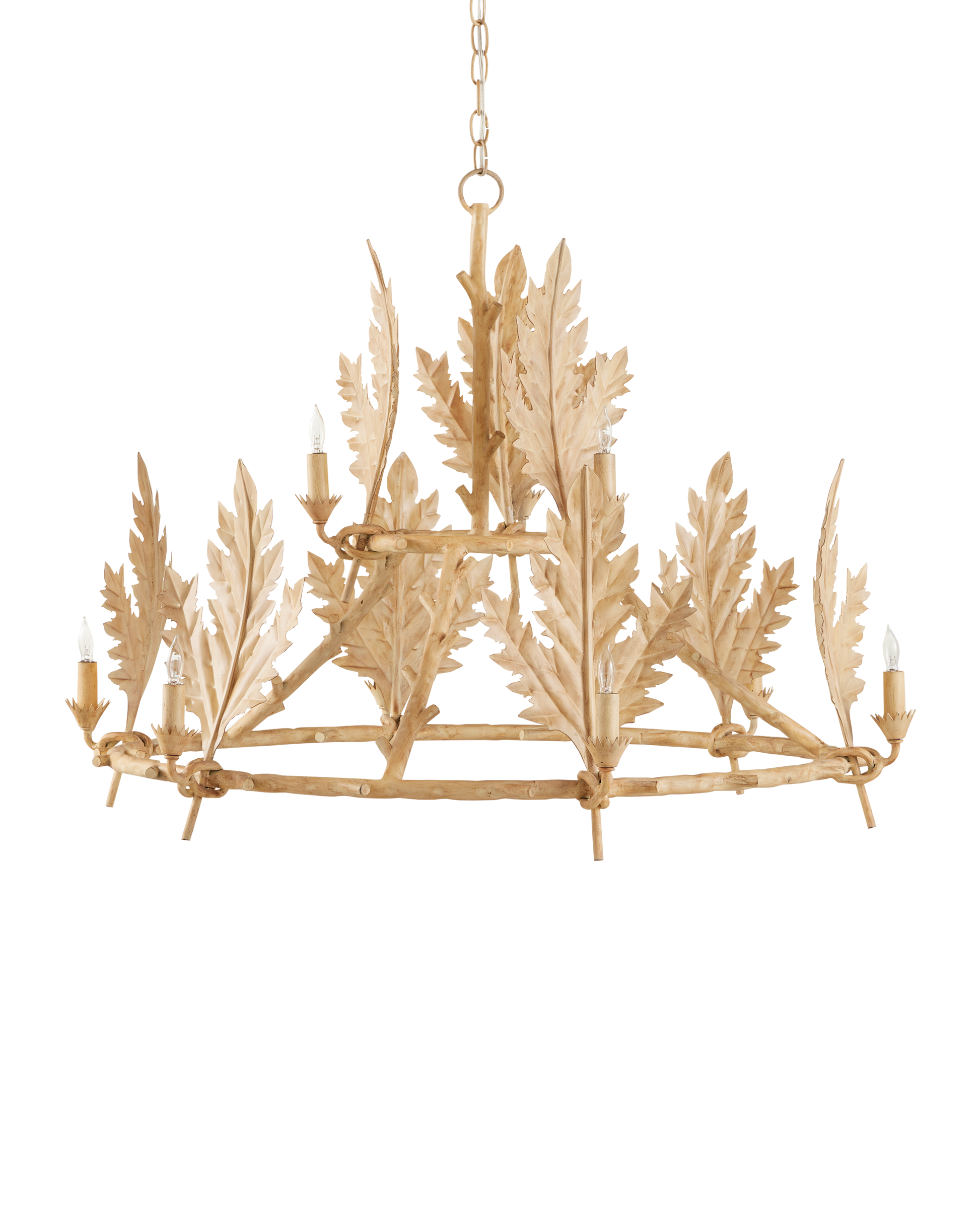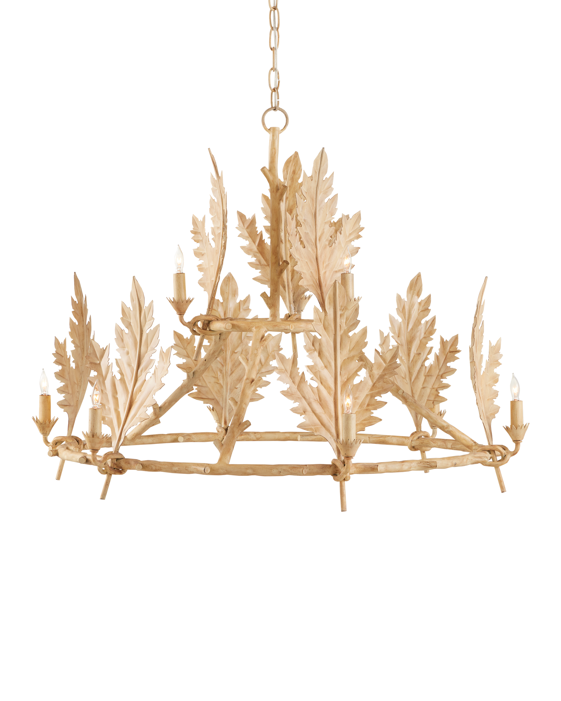 With life-like metal leaves that are laser cut and finished in coco cream, the Bowthorpe Chandelier was designed by Clarence Mallari. The leaves look so real because the veins were pressed into them with machined precision. An artisanal touch is how patina was introduced with subtle brushstrokes in a slightly darker hue, making them appear to be the freshest of the fallen specimens of autumn. The bobeches, which are shaped like upturned crowns, have mild antiquing applied as well. Notice how the leaves slide onto the forged rings of this tan chandelier through sophisticated knots. Adjustable from 35" to 102.5" with use of included chain/rod kit/cable. If your space calls for a longer drop, additional chain/rods/cable is available for purchase.
