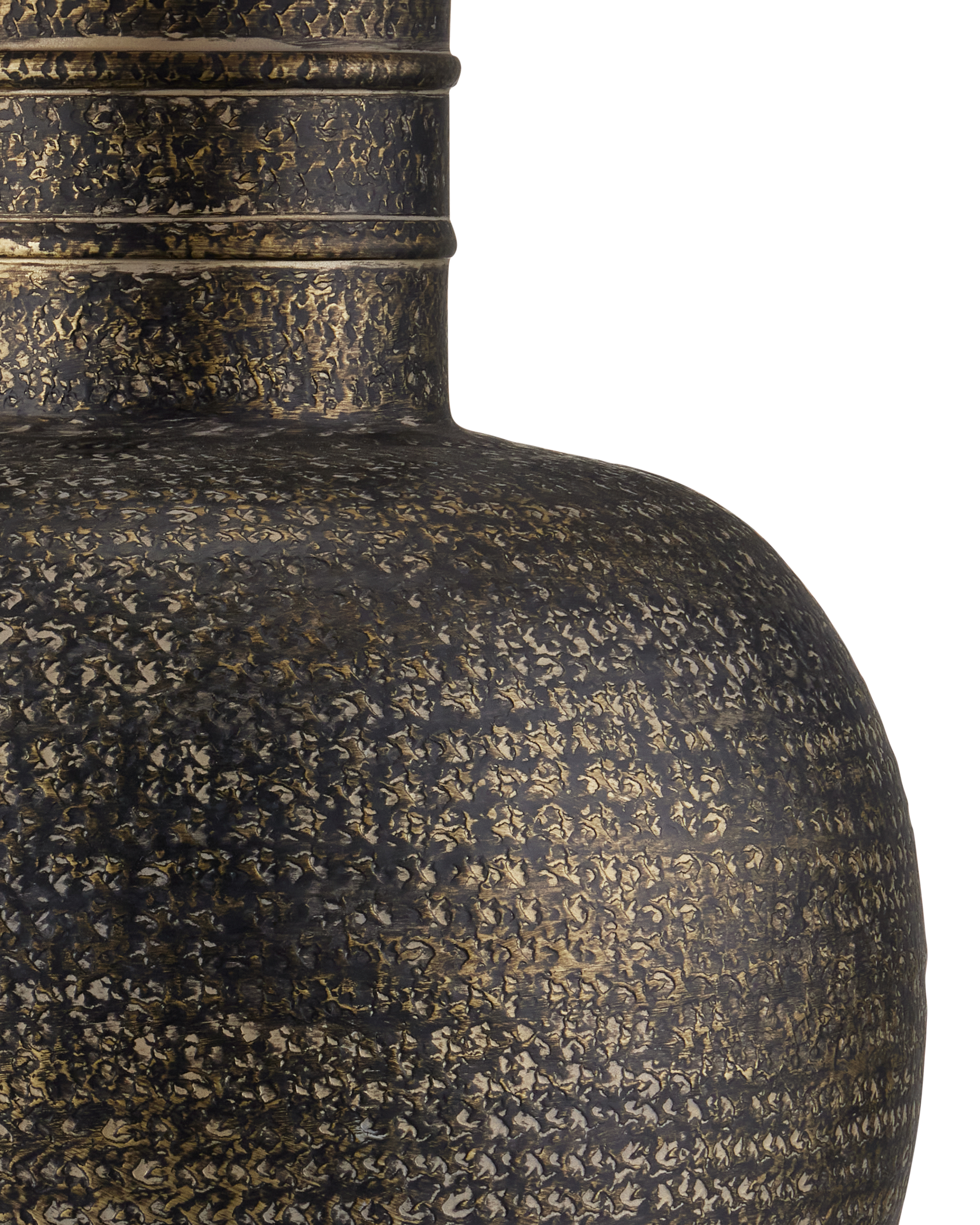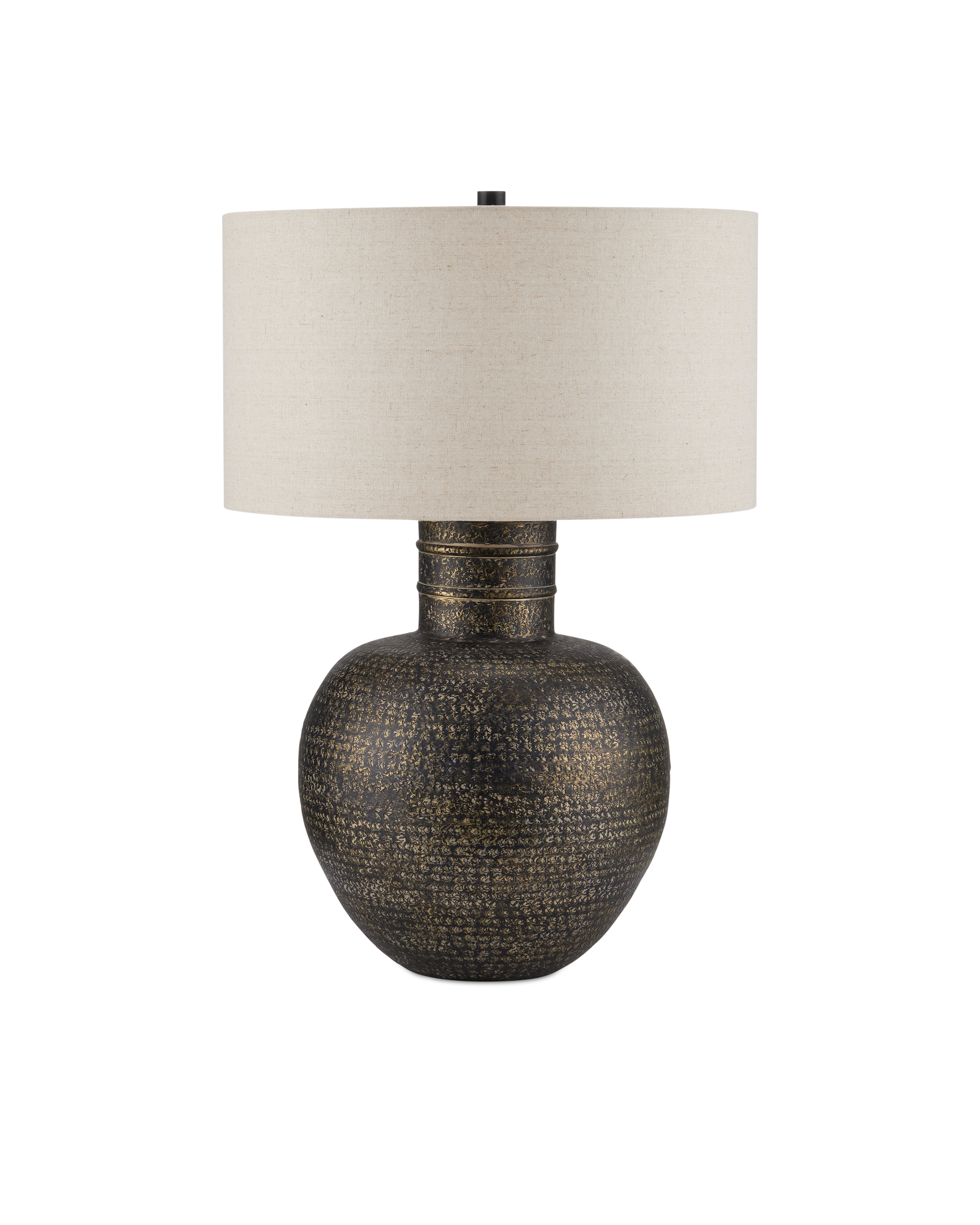 When rustic patina is desired, the Braille Table Lamp will deliver! Made of aluminum, the vase-shaped body has drifts of light and dark tones from the hand-applied antique brass finish that gathers in crevices and is wiped away from the hammered dimples that run along its surface. The raised rings on the neck of the lamp are a refined detail on the body that rises to meet the natural linen shade.