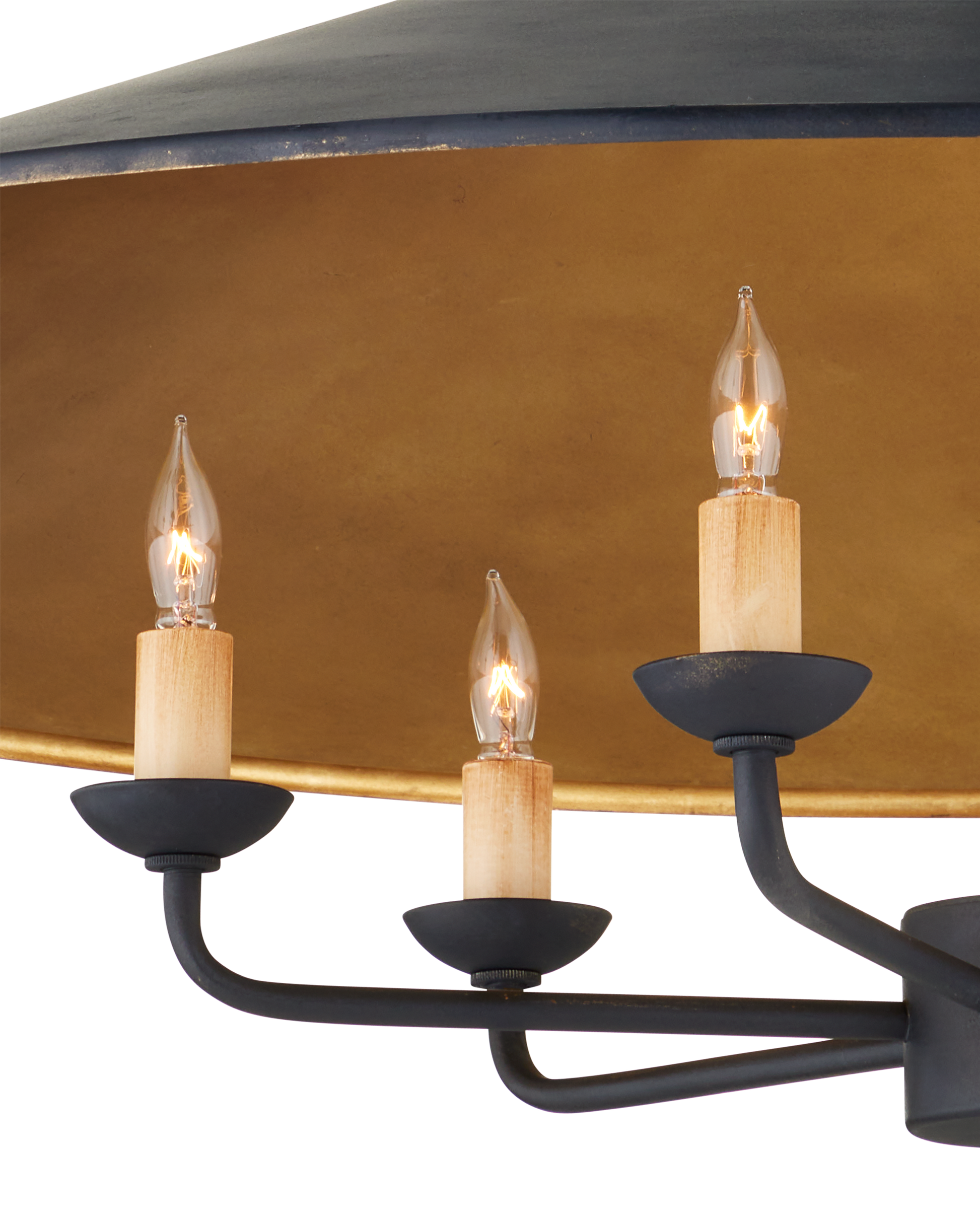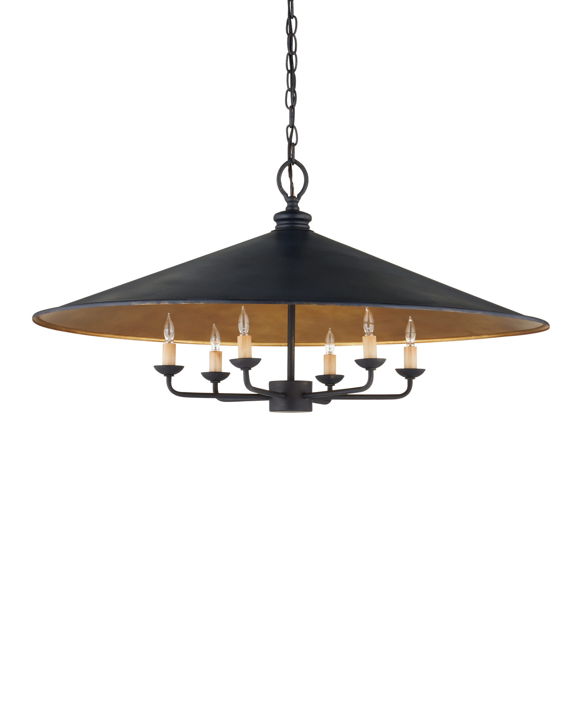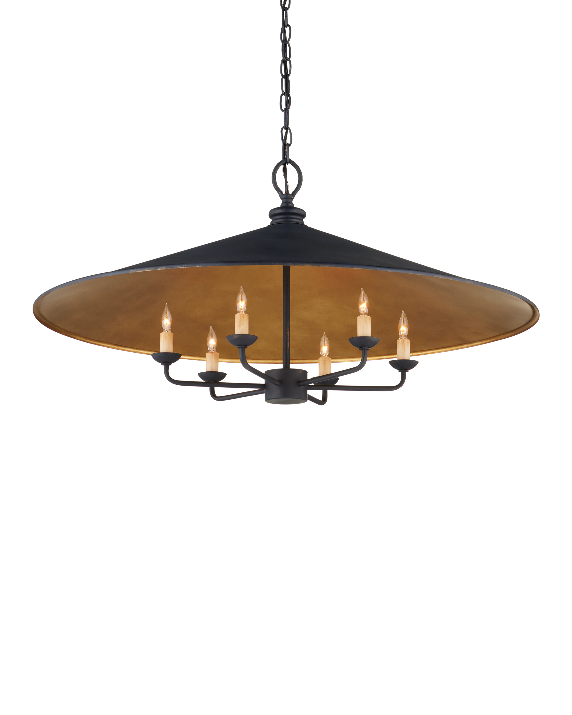 A handsome sprawling shade serves as the canopy for the Brussels Pendant with its subtle oriental profile. A smooth French black finish covers the outside of the shade, the stem, and the arms of this six-light black chandelier while the contemporary gold leaf on the interior of the shade adds contrast to the design.