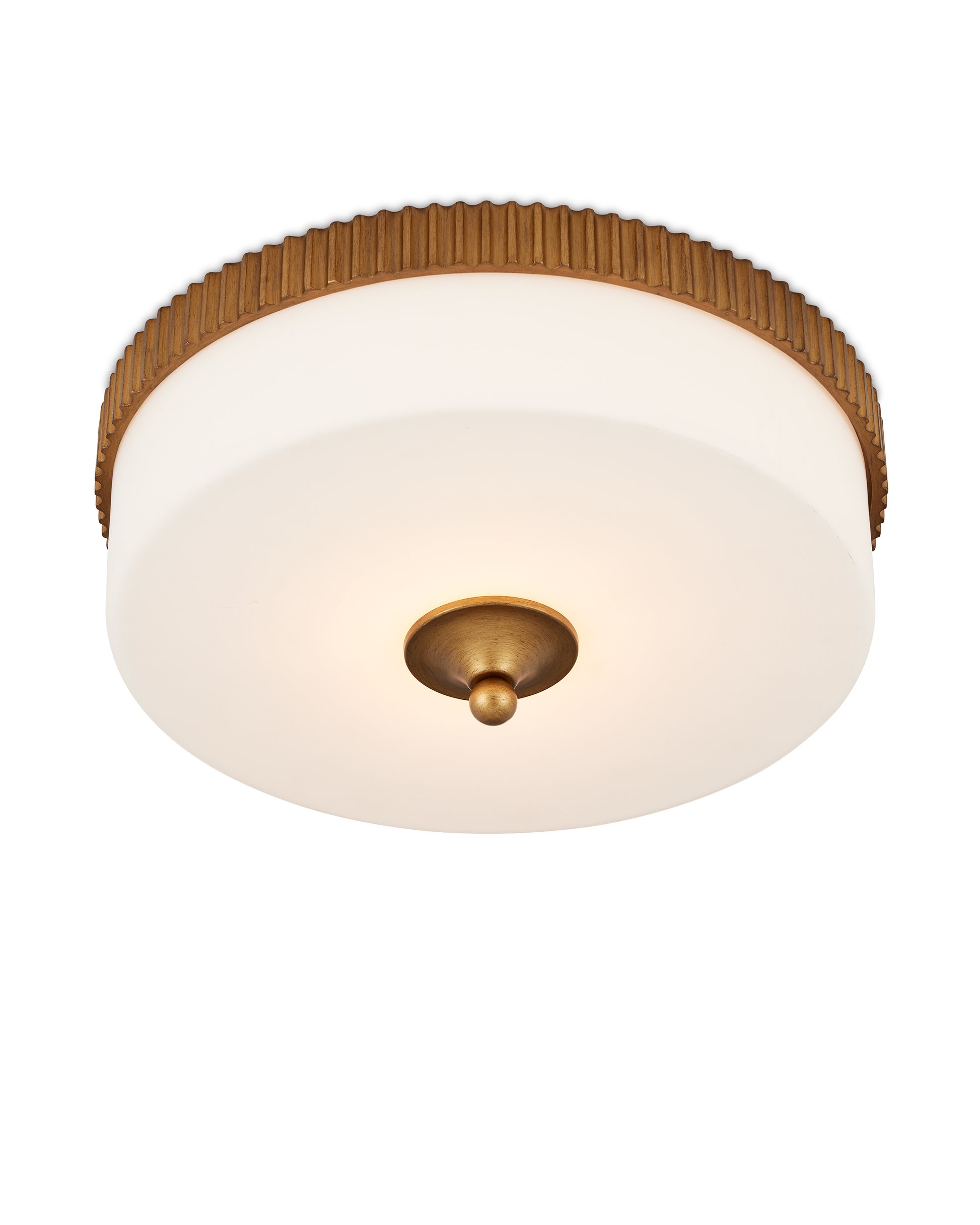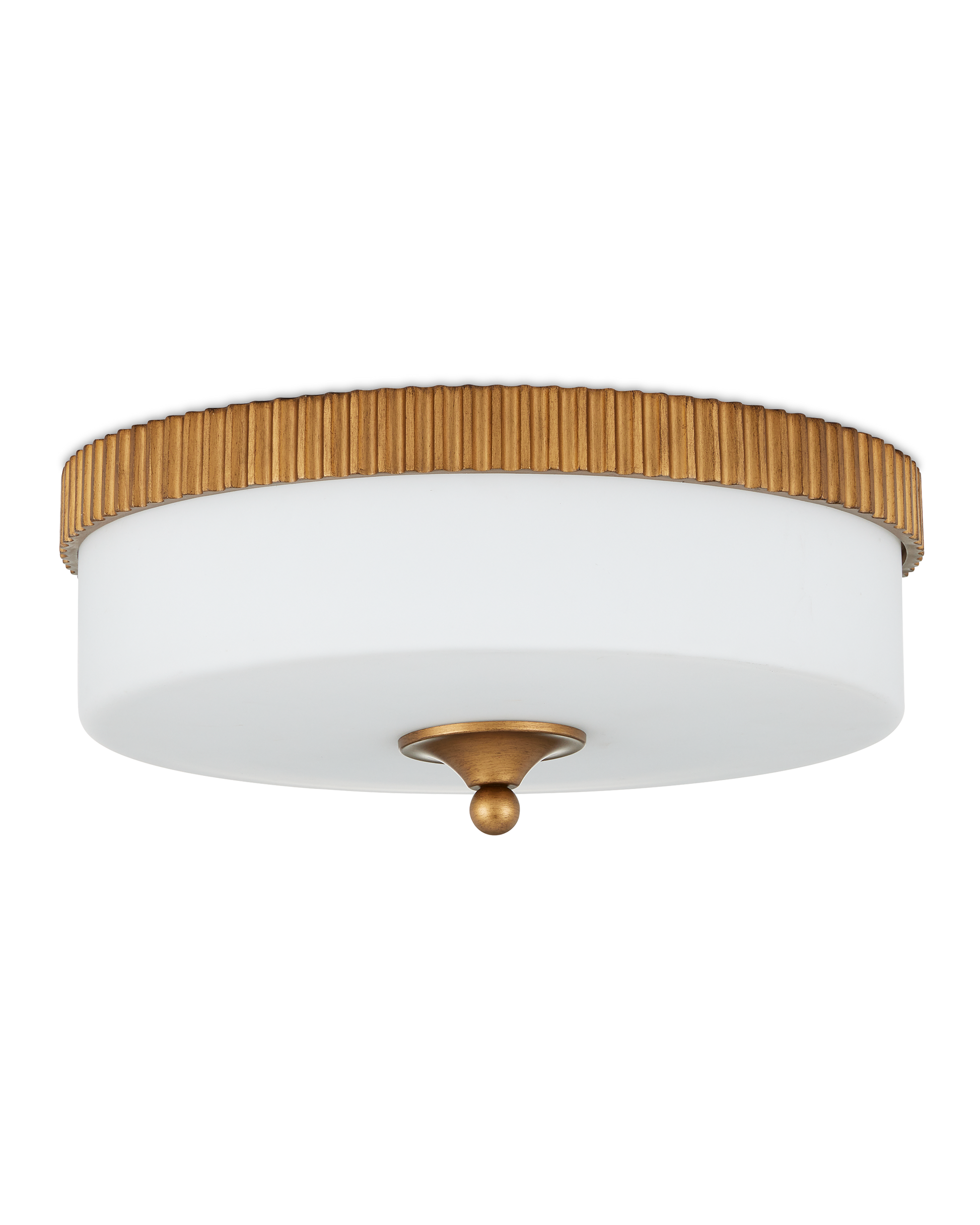 The Bryce Gold Flush Mount is a modern fixture that is just as at home in any hall as it is in a bathroom. This simple round form is embellished with a motif that hearkens to industrial gears. Barry Goralnick is comfortable exploring these forms; the addition of the gold finish an elegant new touch. The classically inspired finial capped off with a ball adds a sophisticated focal point, and the glass diffuser in frosted glass provides an even glow. The Bryce is fitted with integrated LED technology.
