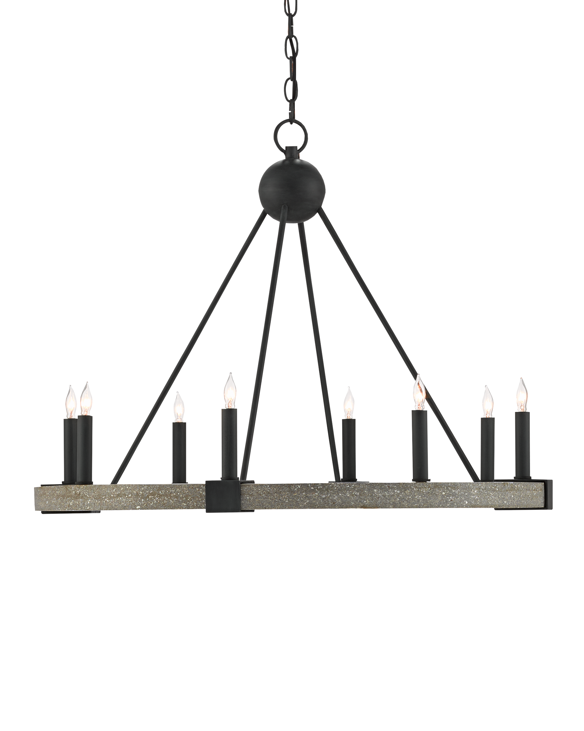 The Burgos Chandelier brings the industrial era to mind with its combination of wrought iron in an antique black finish and polished concrete. Mixing metal and concrete brings a rough luxe feel to this gray and black chandelier. Adjustable from 30.25" to 98.25" with use of included chain/rod kit/cable. If your space calls for a longer drop, additional chain/rods/cable is available for purchase.