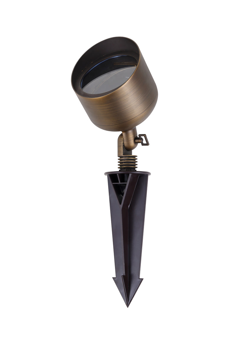 Put the fireflies to shame with Aera collection outdoor landscape spot lights. The round frame is made of die-cast brass with an antique-brass finish and includes a large eight-inch spike for stability. The clear glass lens magnifies the power of the recommended 36-watt Par36 halogen lamp (bulb not included). Unit comes with three feet of wire.