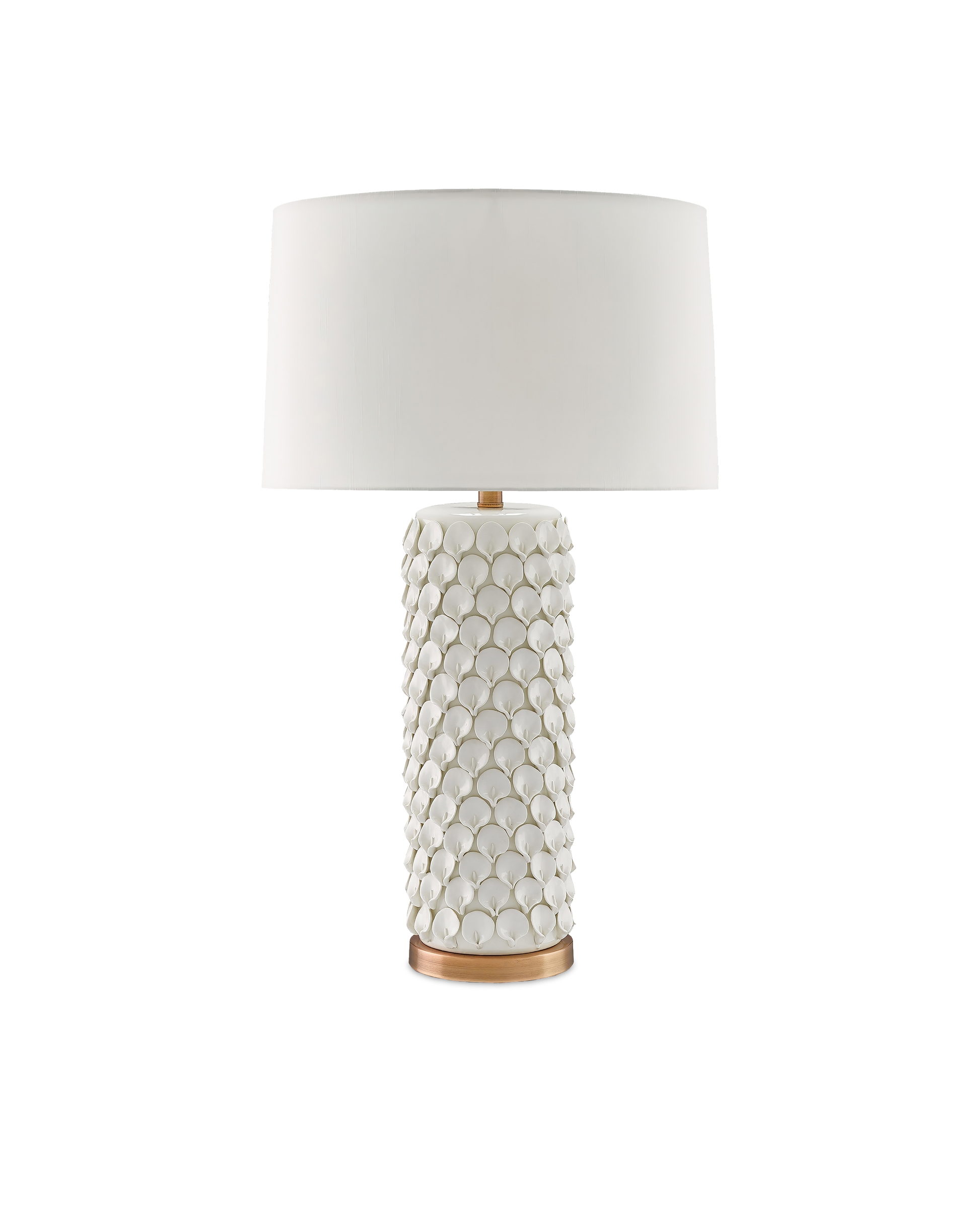 Intricate hand-formed ceramic flower petals cover the surface of the Calla Lily Table Lamp. The textural interest of the petal-covered column is heightened by the antique brushed-brass accents. The white lamp is topped with an eggshell shantung shade that completes this pretty composition.