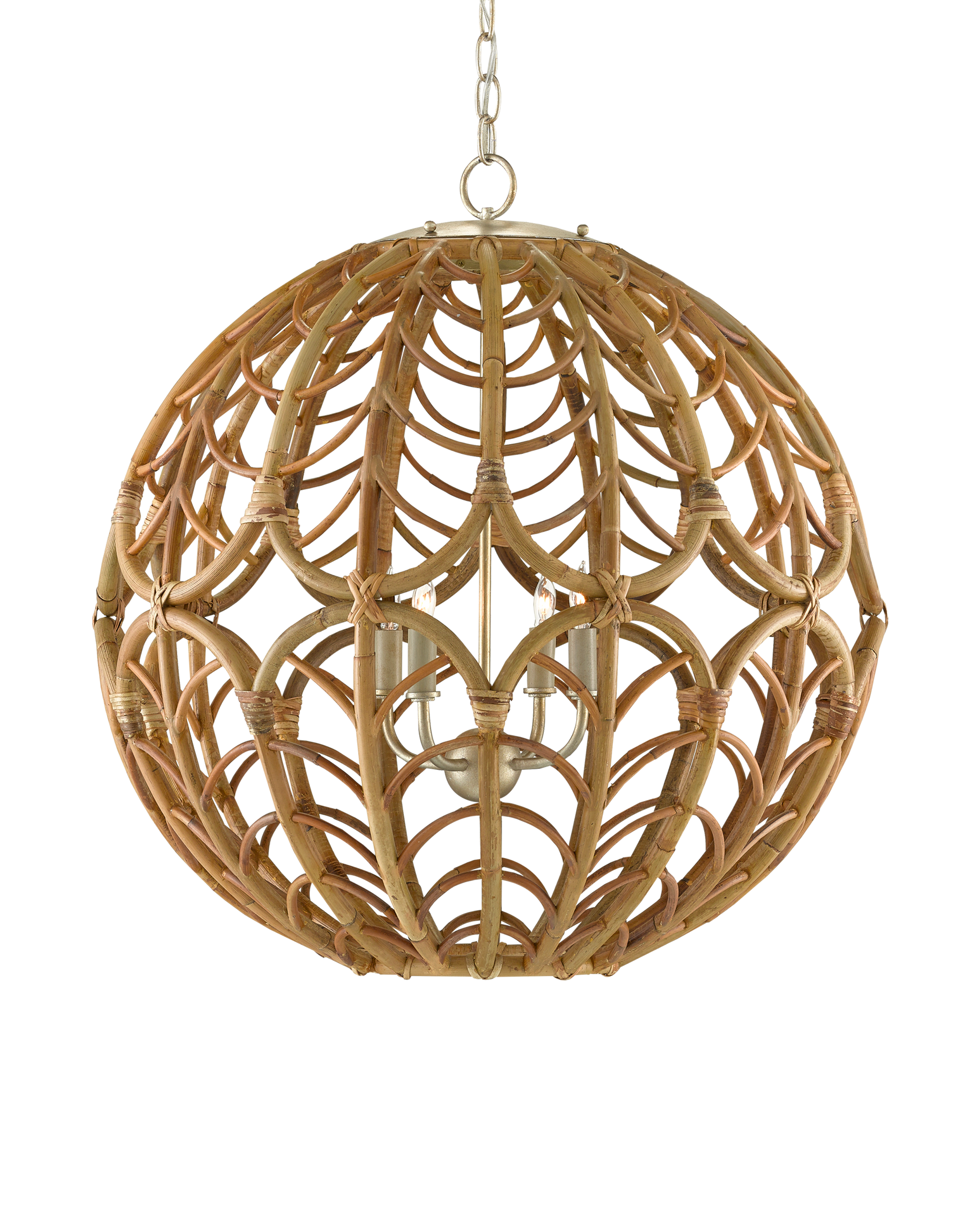 Clarence Mallari designed the Cape Verde Orb Chandelier: "With myriad books available at our Currey library, jewelry books are always a good resource for me. This round rattan chandelier was inspired by a glass bowl by Lalique. The orb chandelier took shape when I echoed the pattern etched along the glass to with the natural material that was woven to create the shade. I feel this design has true harmony." The hardware on the Cape Verde is in a mix of silver leaf and smoke wood finishes. Adjustable from 32" to 100" with use of included chain/rod kit/cable. If your space calls for a longer drop, additional chain/rods/cable is available for purchase.