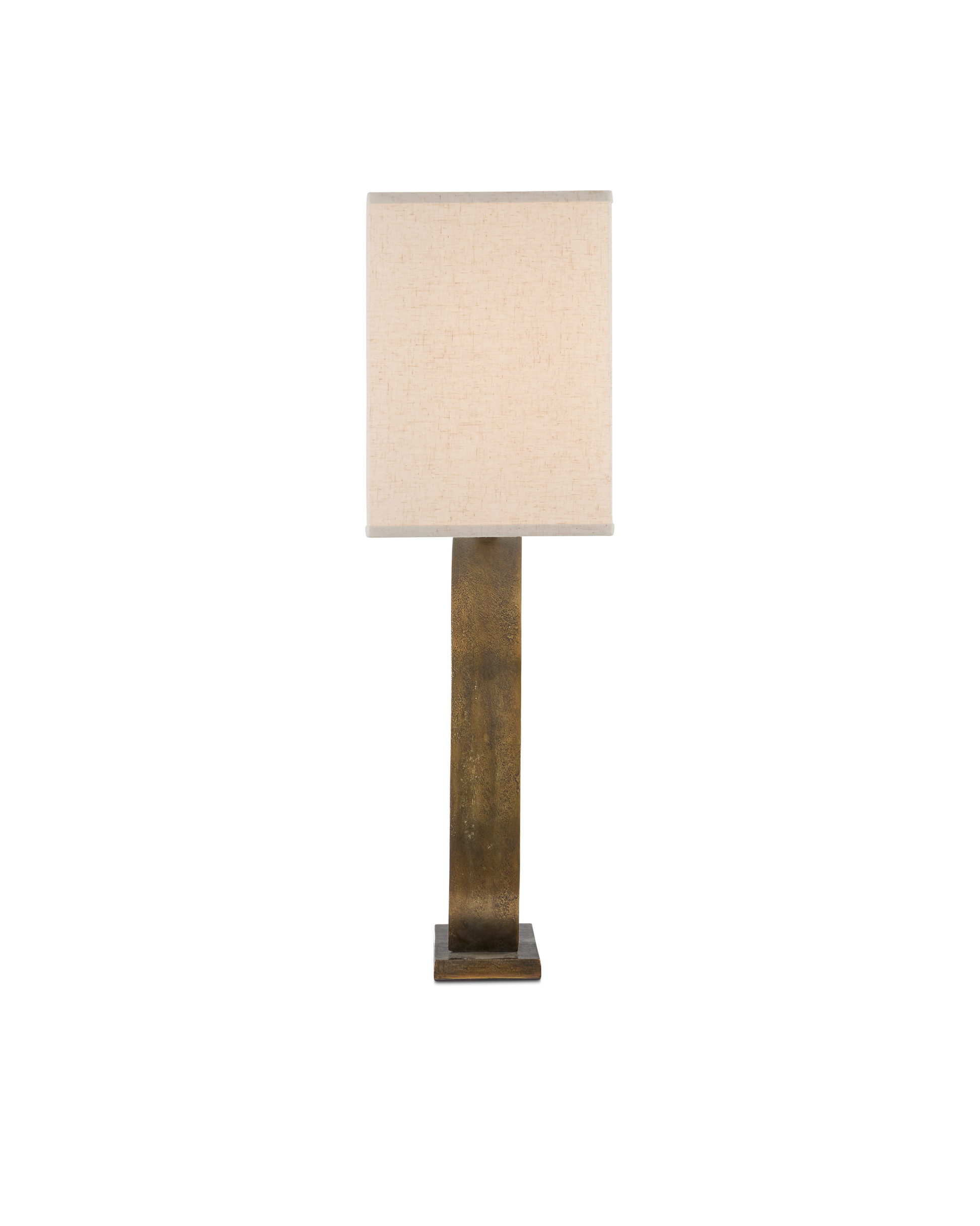 The Cercle Table Lamp is a shapely deep gold lamp that reflects the playful shape behind its French name. Made of cast aluminum, the elegant ring is affixed to a minimal rectangular base in the same dark brass antique finish. The clean-lined rectangular shade, which is perfectly in scale with the body, has a sophisticated trim on the top and bottom edges.