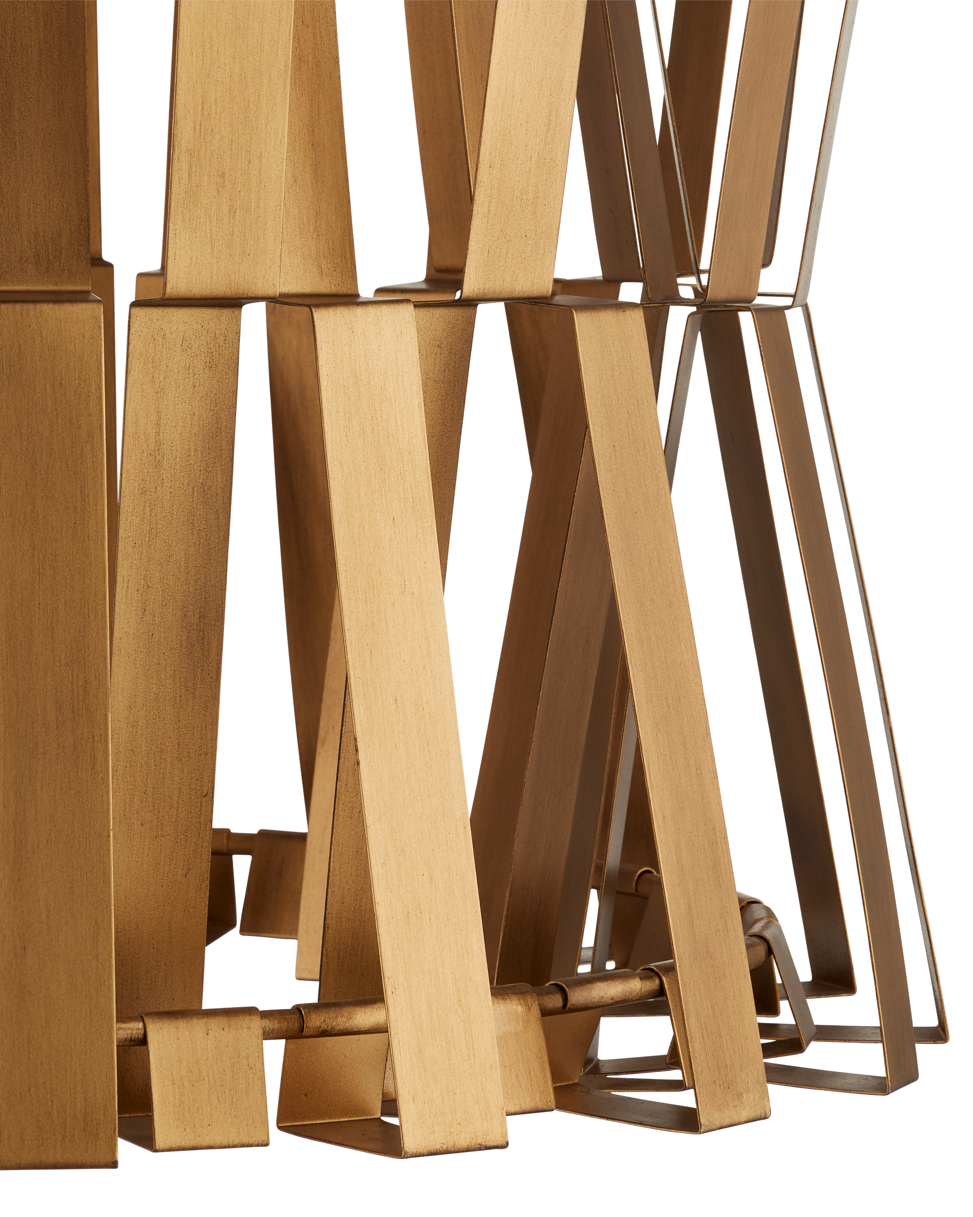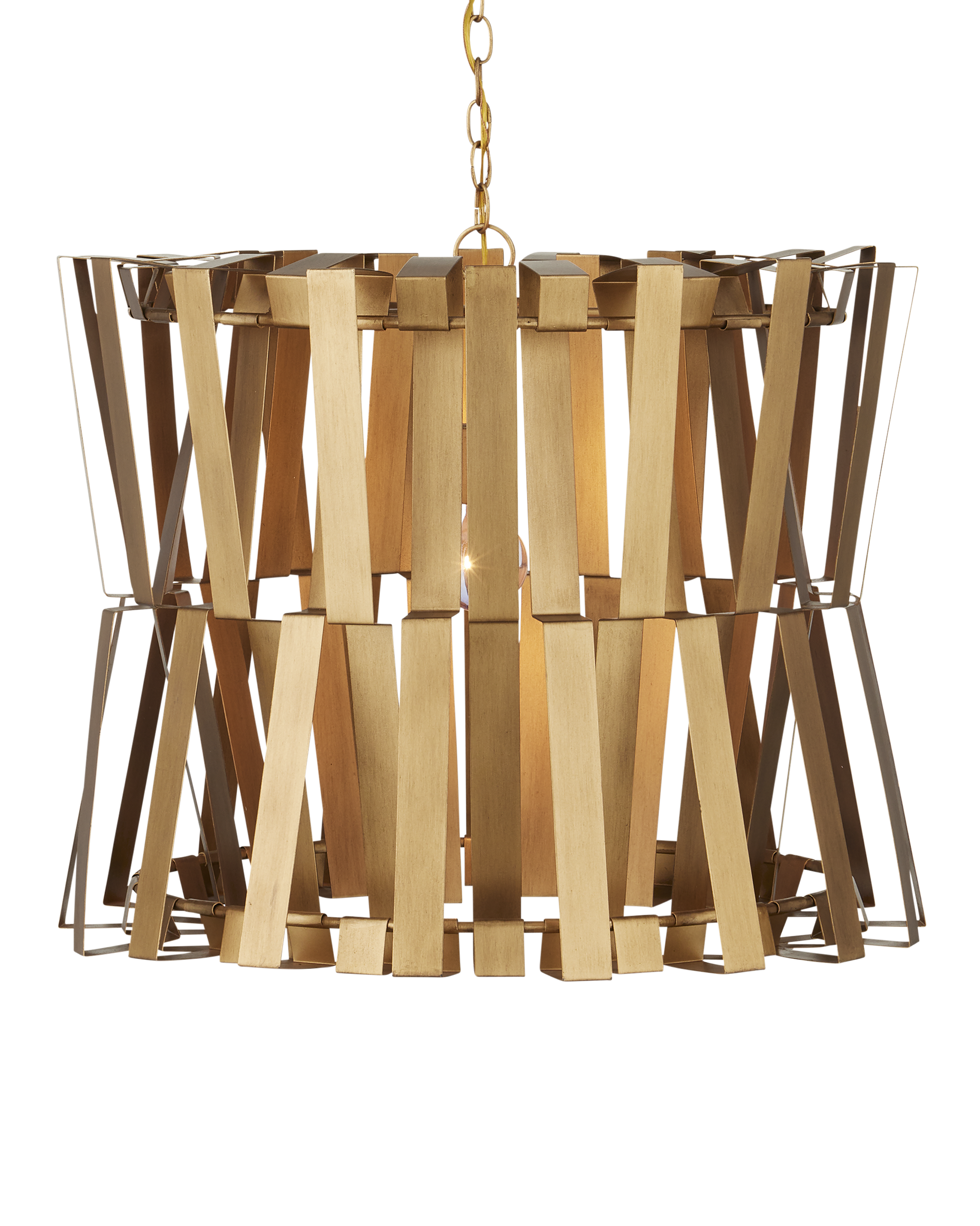 As complex as a profile gets, the Chaconne Brass Chandelier has a circumference ringed in folded metal straps. Each piece is bent seven times to achieve the shape that is then wrapped around the frame. This is a labor-intensive process that takes a tremendous amount of concentration to ensure that the interconnecting straps end up the exact same length. Brightening the overall composition is the brass finish. Adjustable from 28.5" to 96.5" with use of included chain/rod kit/cable. If your space calls for a longer drop, additional chain/rods/cable is available for purchase.
