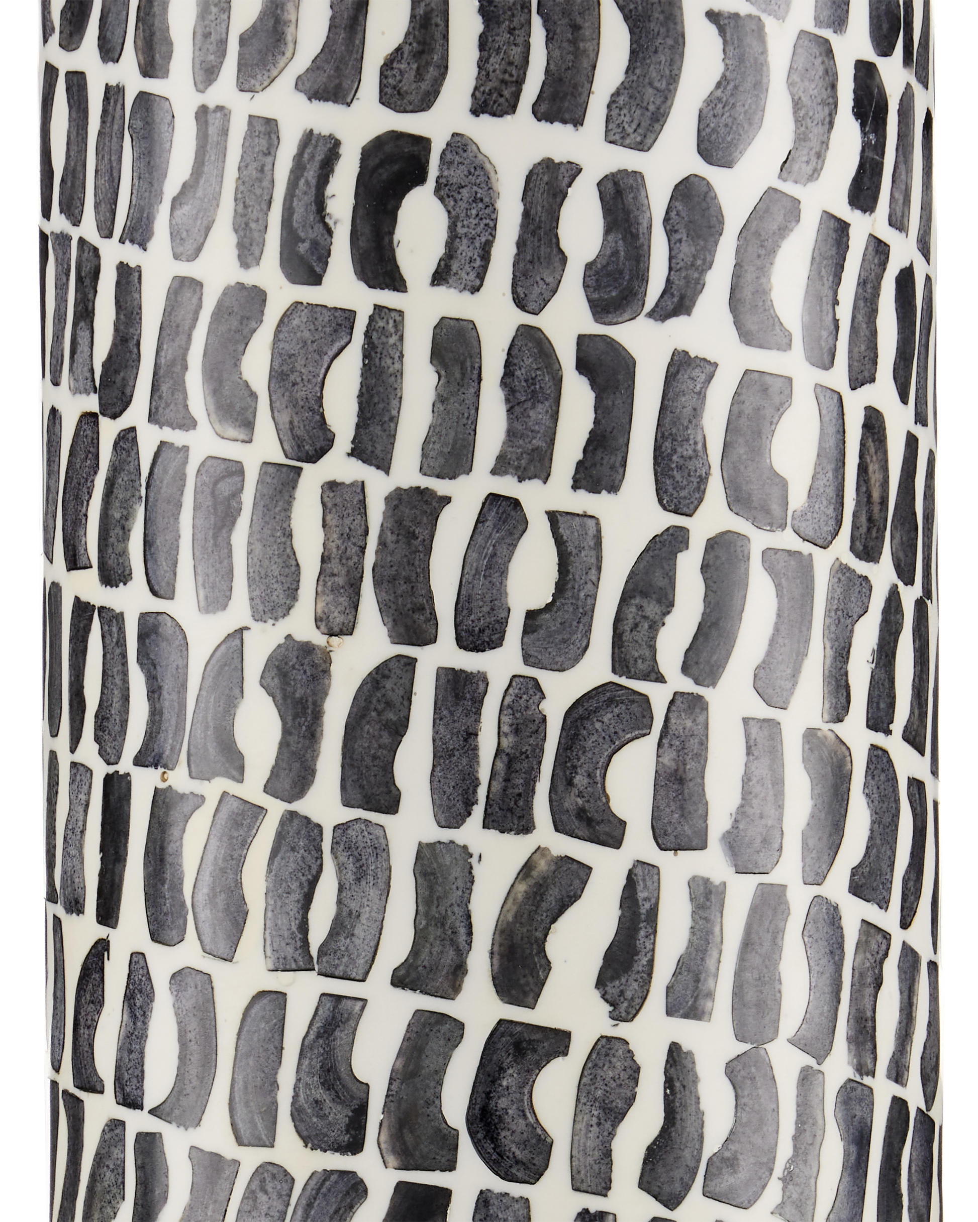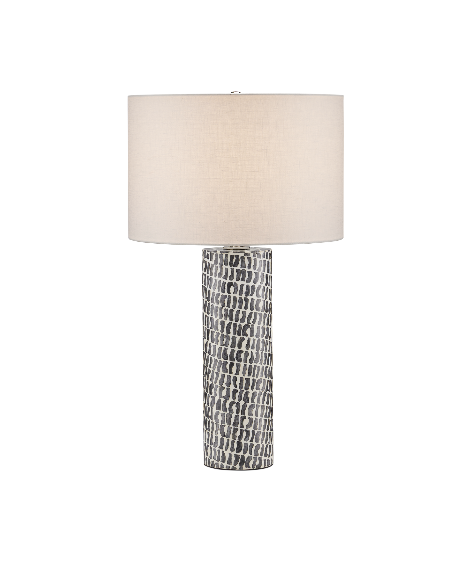 Appearing as if it has a painterly surface, one with naïve brushstrokes that could have been fashioned by a child, the body of the Charcoal Table Lamp, designed by Aimee Kurzner, is made of dark gray bone and composite. The pattern that flows along the columnar base creates a sense of movement that makes this gray lamp special. The pared-down profile leaves the curving motifs to make their mark, while the off-white linen drum shade douses the lamp's body with illumination.