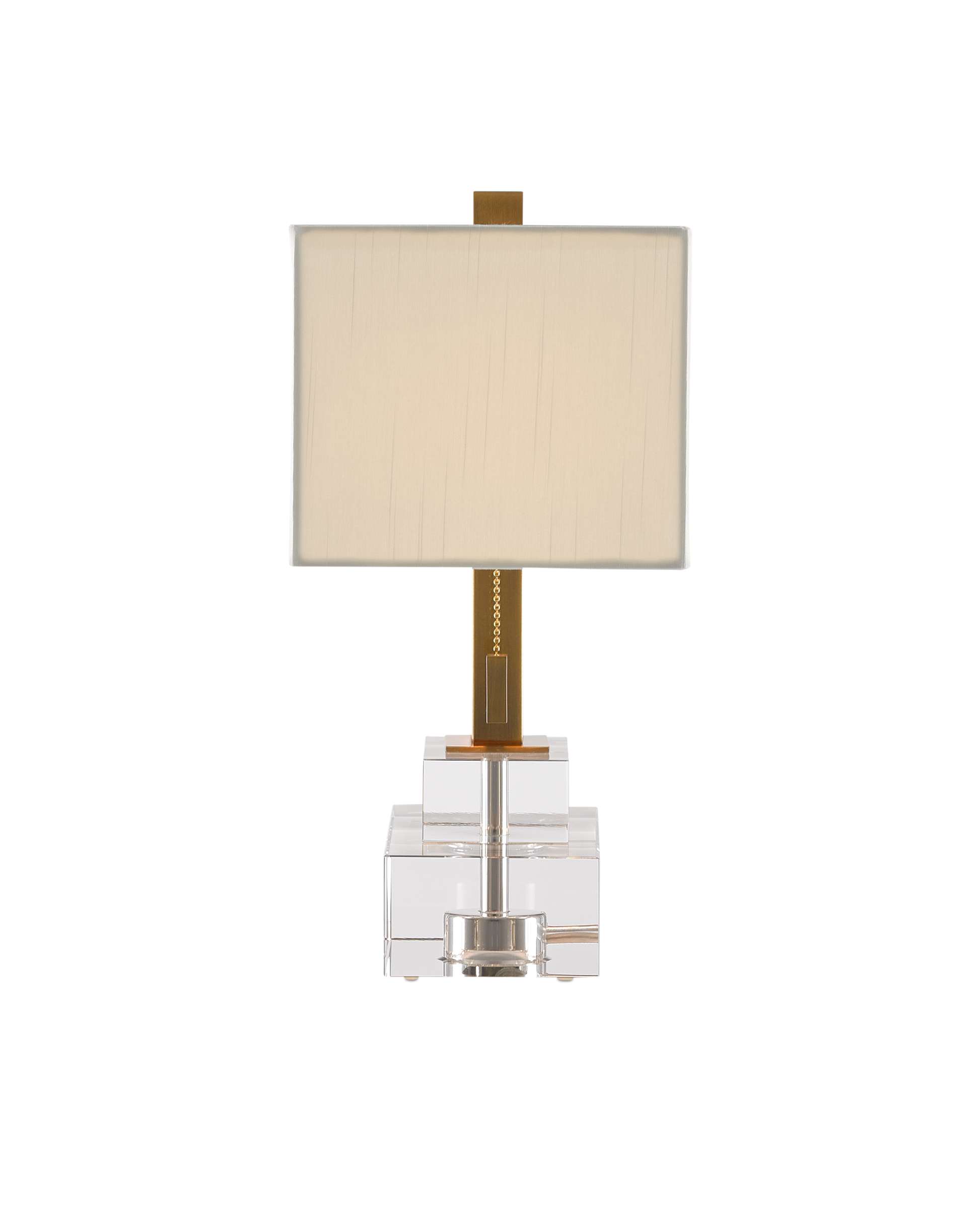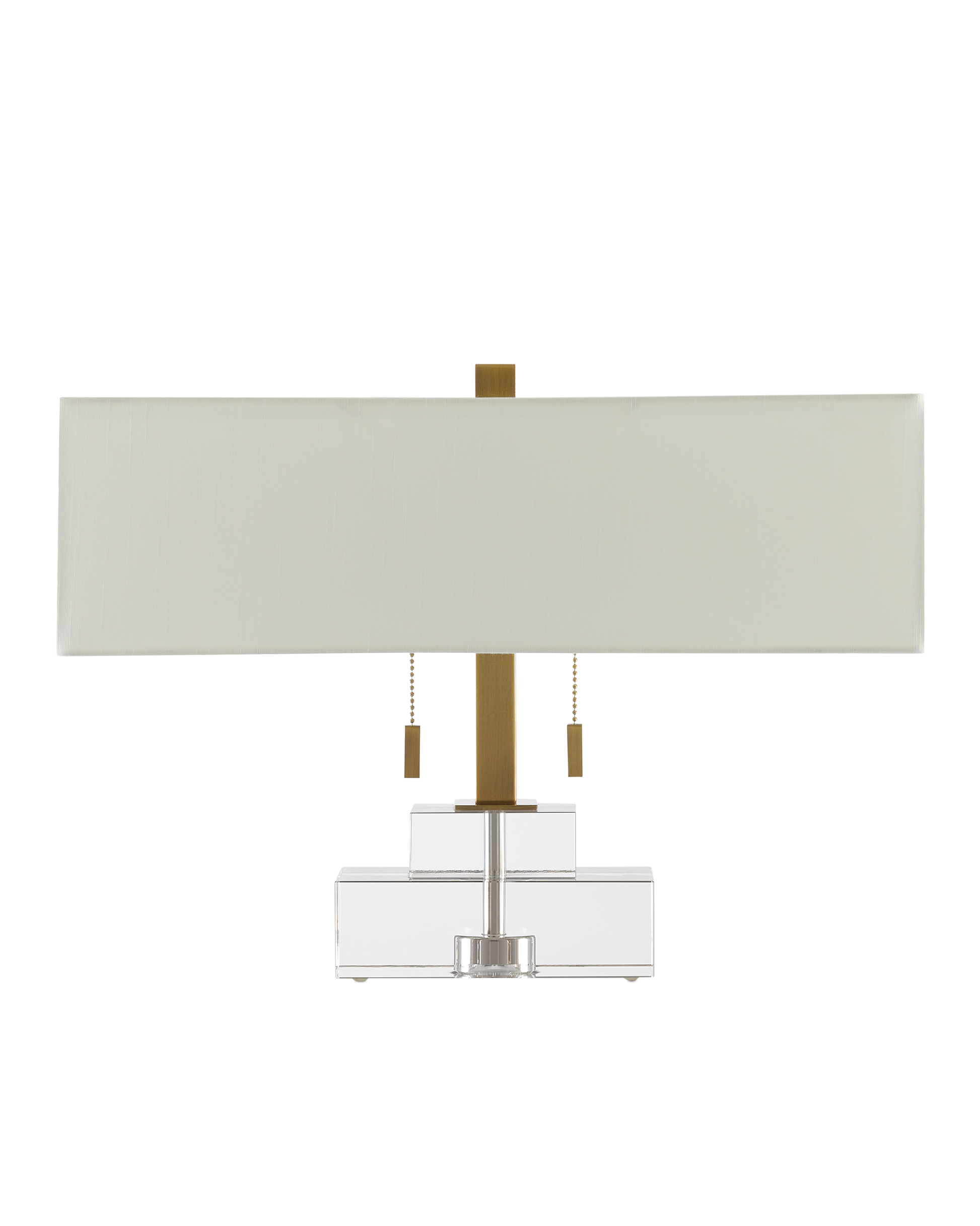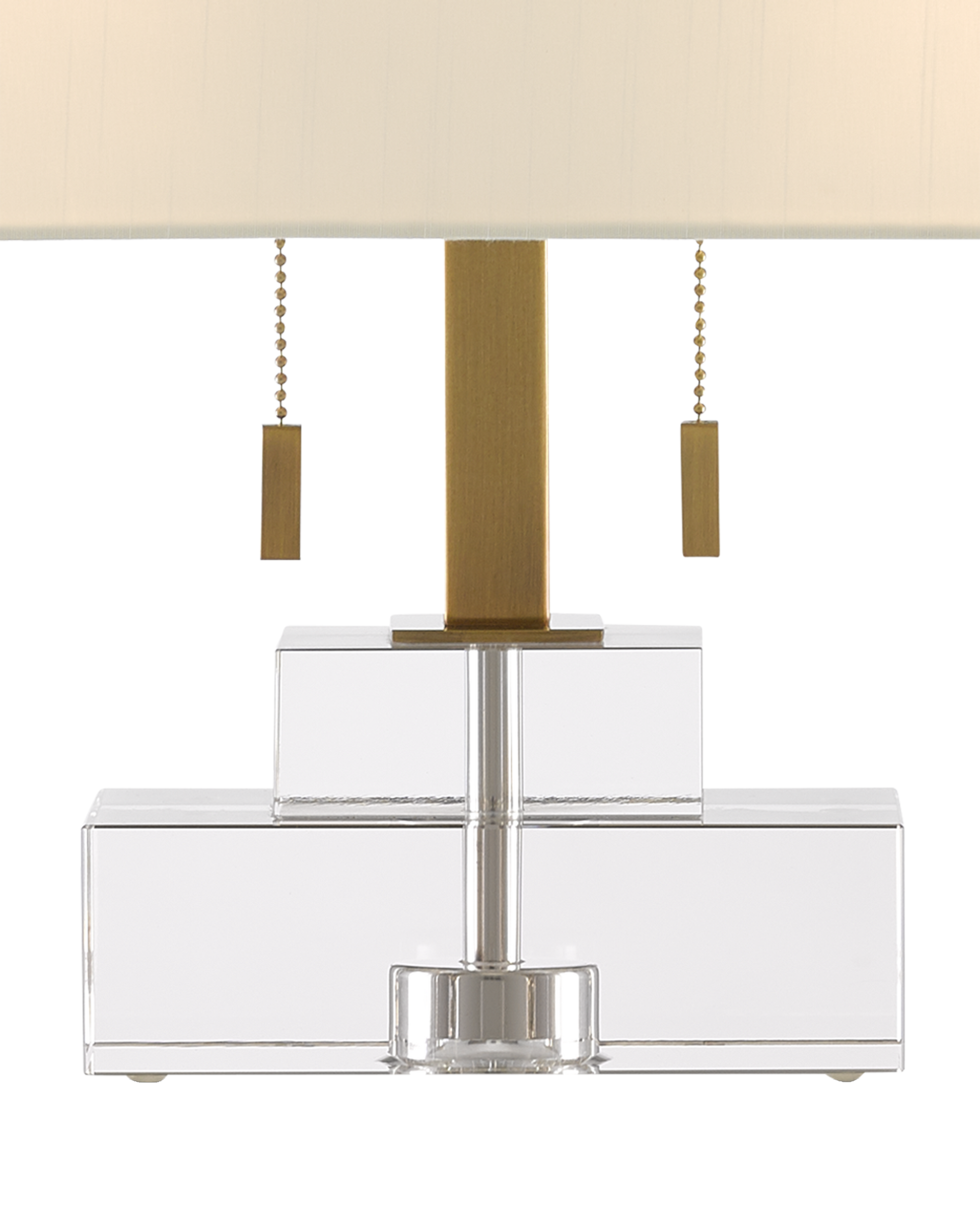 Rectangles of clear optic crystal make the Chiara Table Lamp luminous. Contrasting the pale stacked body are the antique brass finish on the metal and the off-white shantung shade.