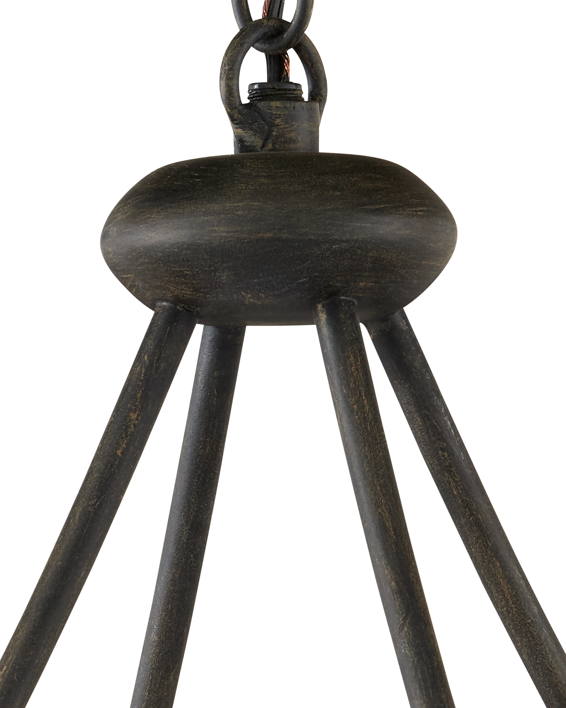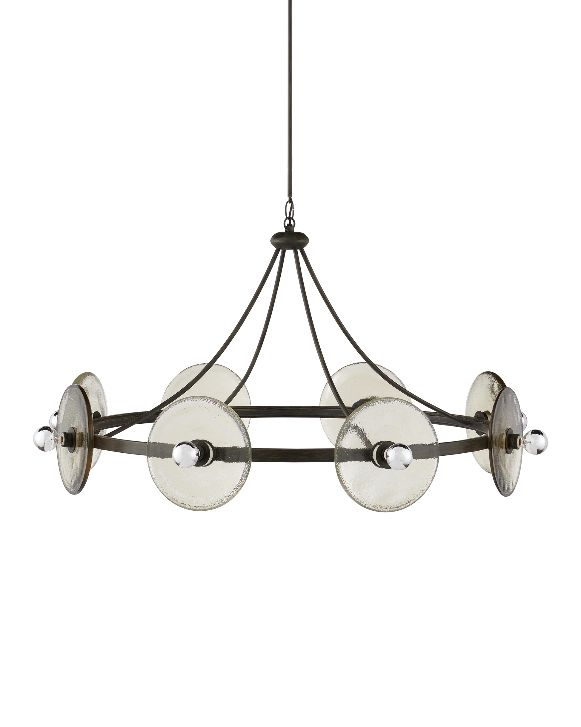 The Circumstellar Disc Chandelier is a Tom Caldwell design that features cast glass discs with pebbly surfaces. The recycled glass discs are fitted to a wrought iron frame in a black iron finish. Reflector bulbs (shown here) are recommended for this black chandelier as they don't emit glare. The frosted silver bulbs, which are not included with the fixture, throw the light back onto the glass discs to create a beautiful glow. Adjustable from 27.5" to 68.5" with use of included chain/rod kit/cable. If your space calls for a longer drop, additional chain/rods/cable is available for purchase.