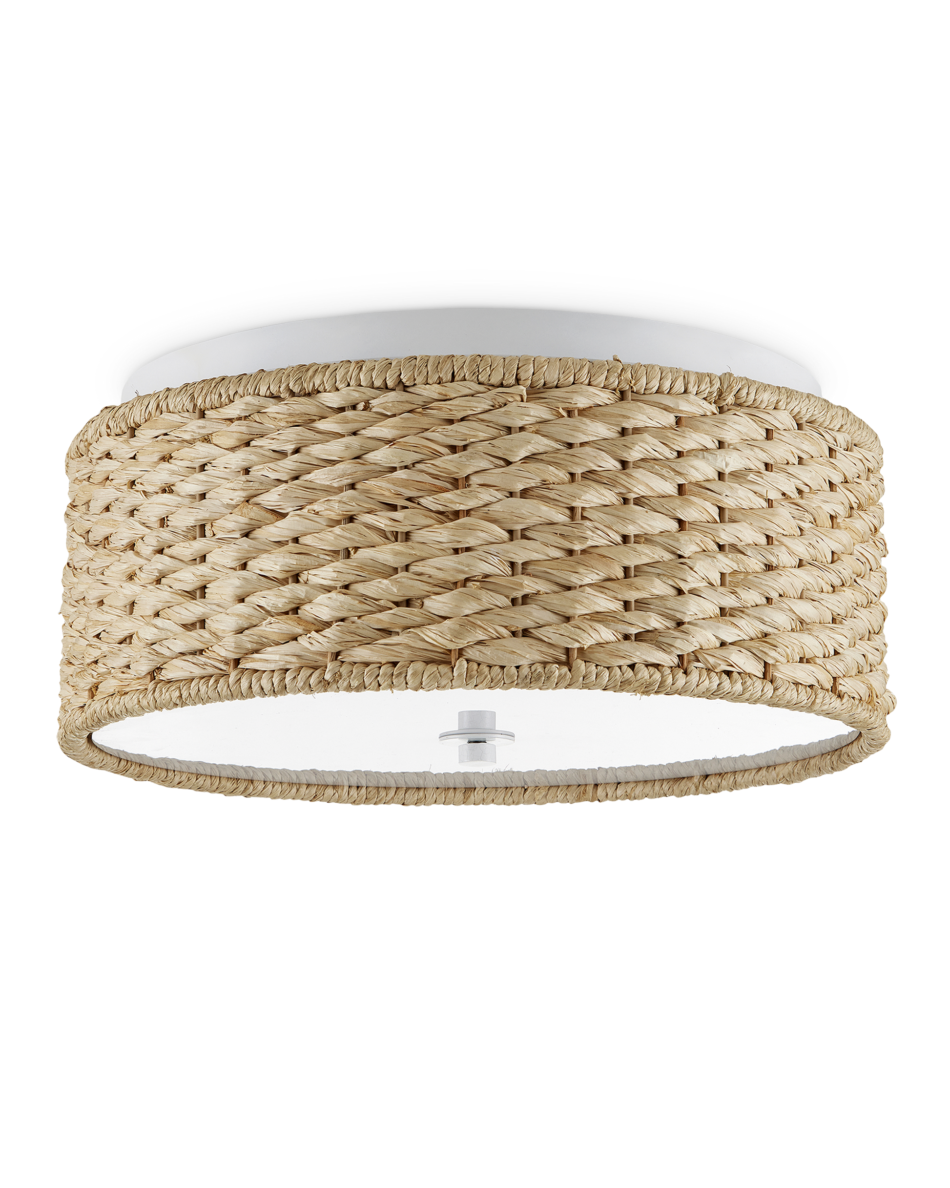 Raffia is densely woven around the circumference of the Colchester Flush Mount. Clarence Mallari designed the rope flush mount to be luminous. Choices that enhance the glow include the sugar white finish, the acrylic diffuser, the way the light flows onto the ceiling, and the weave that allows the light to seep through.